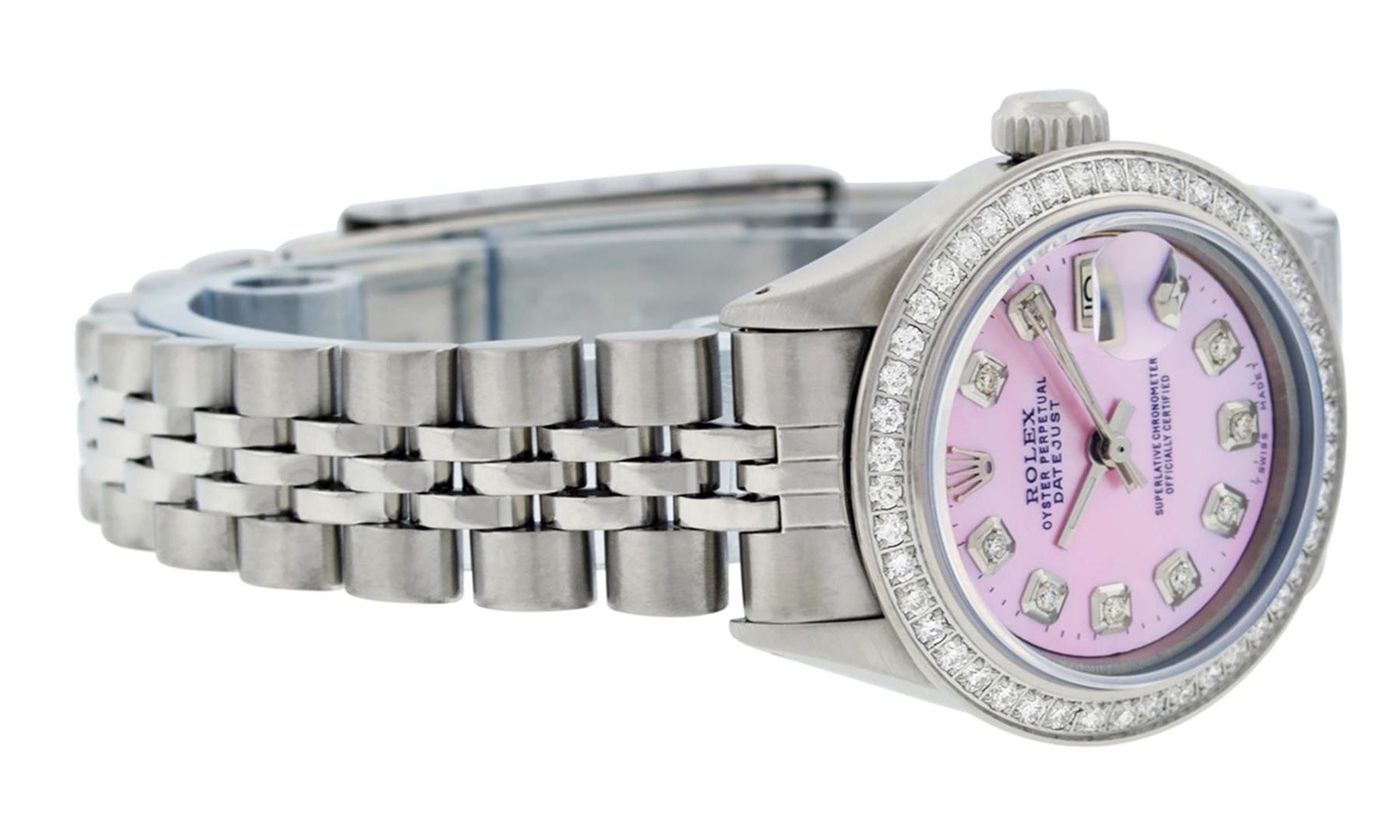 One Ladies Stainless Steel Rolex Datejust Polished Bright with Satin Finish, Serviced & Electronically Tested, Stainless Steel Case: 26mm, Stainless Steel Crown, Custom Bezel: New Stainless Steel Beadset Diamond Bezel, Diamond Count: 44 Diamonds Total Weight 1.00 Carat, Clarity: SI-VS, Color: G to H. Custom Crystal: New Synthetic Sapphire Cyclops Lens. Custom Hands: New Luminescent Hands. Movement: Automatic Winding Movement Caliber 2030. Custom Dial: Refinished Pink Mother Of Pearl With Diamond Hour Markers, Diamond Count: 10 Diamonds in Dial G To H In Color, Clarity: SI-VS. Date Window: 3 O'Clock Position Date Display, Model: Datejust. Condition: G-6 Extra Fine. Bracelet: Stainless Steel Jubilee Band. Bright Polish & Satin Finish. 6.0 Inch Length, Adjustable. Standard Clasp, With Rolex Logo. This Watch Has Been Serviced Time Tested And Is In Excellent Condition It Is Free Of All Scratches And Dents.