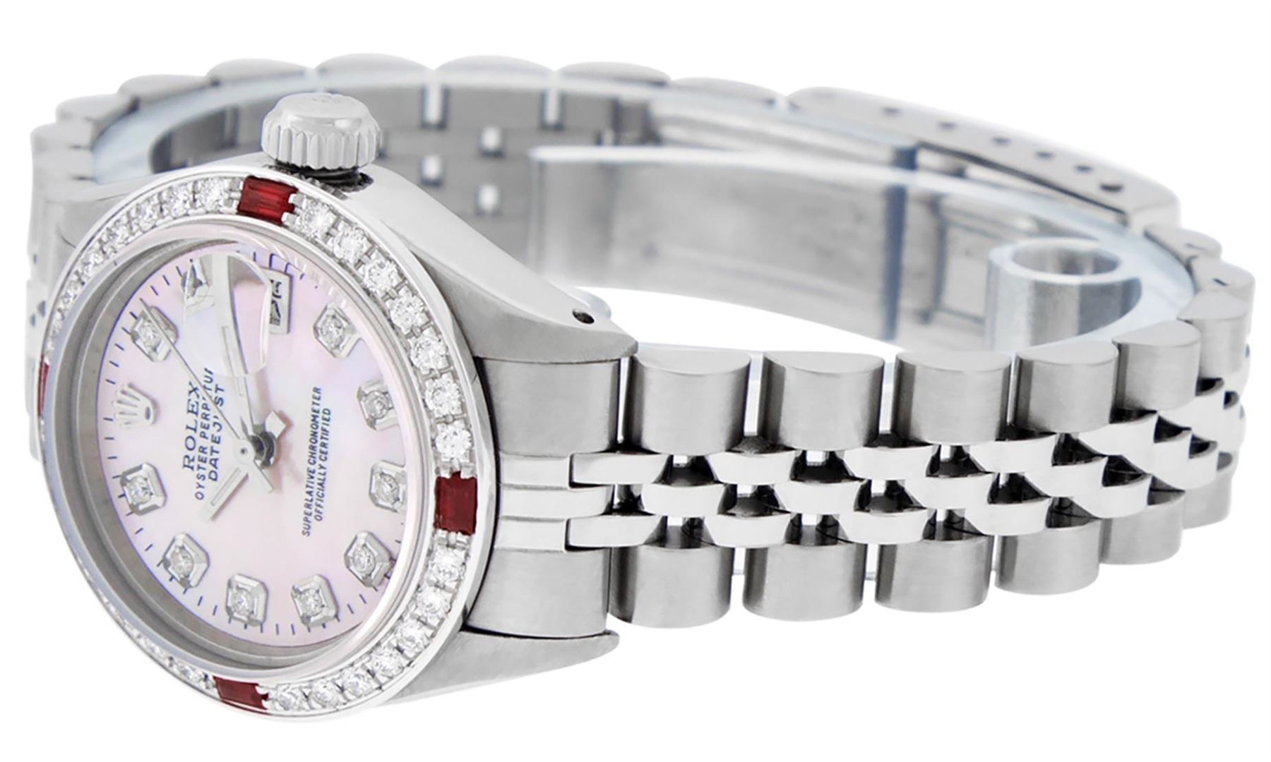One Ladies Stainless Steel Rolex Oyster Perpetual Datejust Polished Bright with Satin Finish, Serviced & Electronically Tested, Stainless Steel Case: 26mm, Stainless Steel Crown, Custom Bezel: New 18K White Gold Ruby Beadset Diamond Bezel, Diamond + Gem Count: 28 Diamonds + 4 Rubies Total Weight .70 Carat, Clarity: SI-VS, Color: G to H. Custom Crystal: New Scratch Resistant Synthetic Sapphire Cyclops Lens. Custom Hands: New Luminescent Hands. Movement: Automatic Winding Movement. Custom Dial: Refinished Pink Mother Of Pearl With Diamond Hour Markers, 10 Diamond in Dial G To H In Color, Clarity: SI-VS. Date Window: 3 O'clock Position Date Display, Model: Datejust. Condition: G-6 Extra Fine. Bracelet: Stainless Steel Jubilee Band. Bright Polish & Satin Finish. 6.0 Inch Length, Adjustable. Standard Clasp, With Rolex Logo. This Watch Has Been Serviced Time Tested And Is In Excellent Condition It Is Free Of All Scratches And Dents.