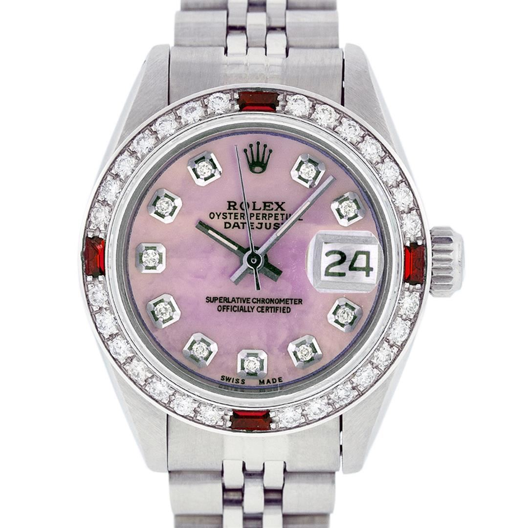 One Ladies Stainless Steel Rolex Datejust Polished Bright with Satin Finish, Serviced & Electronically Tested, Stainless Steel Case: 26mm, Stainless Steel Crown, Custom Bezel: New 18K White Gold Ruby Beadset Diamond Bezel, Diamond + Gem Count: 28 Diamonds + 4 Rubies. Total Weight .70 Carat, Clarity: SI-VS, Color: G to H. Custom Crystal: New Scratch Resistant Synthetic Sapphire Cyclops Lens. Custom Hands: New Luminescent Hands. Movement: Automatic Winding Movement. Custom Dial: Refinished Pink Mother Of Pearl With Diamond Hour Markers, 10 Diamonds in Dial G To H In Color, Clarity: SI-VS. Date Window: 3 O'clock Position Date Display, Model: Datejust. Condition: G-6 Extra Fine. Bracelet: Stainless Steel Jubilee Band. Bright Polish & Satin Finish. 6.0 Inch Length, Adjustable. Standard Clasp, With Rolex Logo. This Watch Has Been Serviced Time Tested And Is In Excellent Condition It Is Free Of All Scratches And Dents.