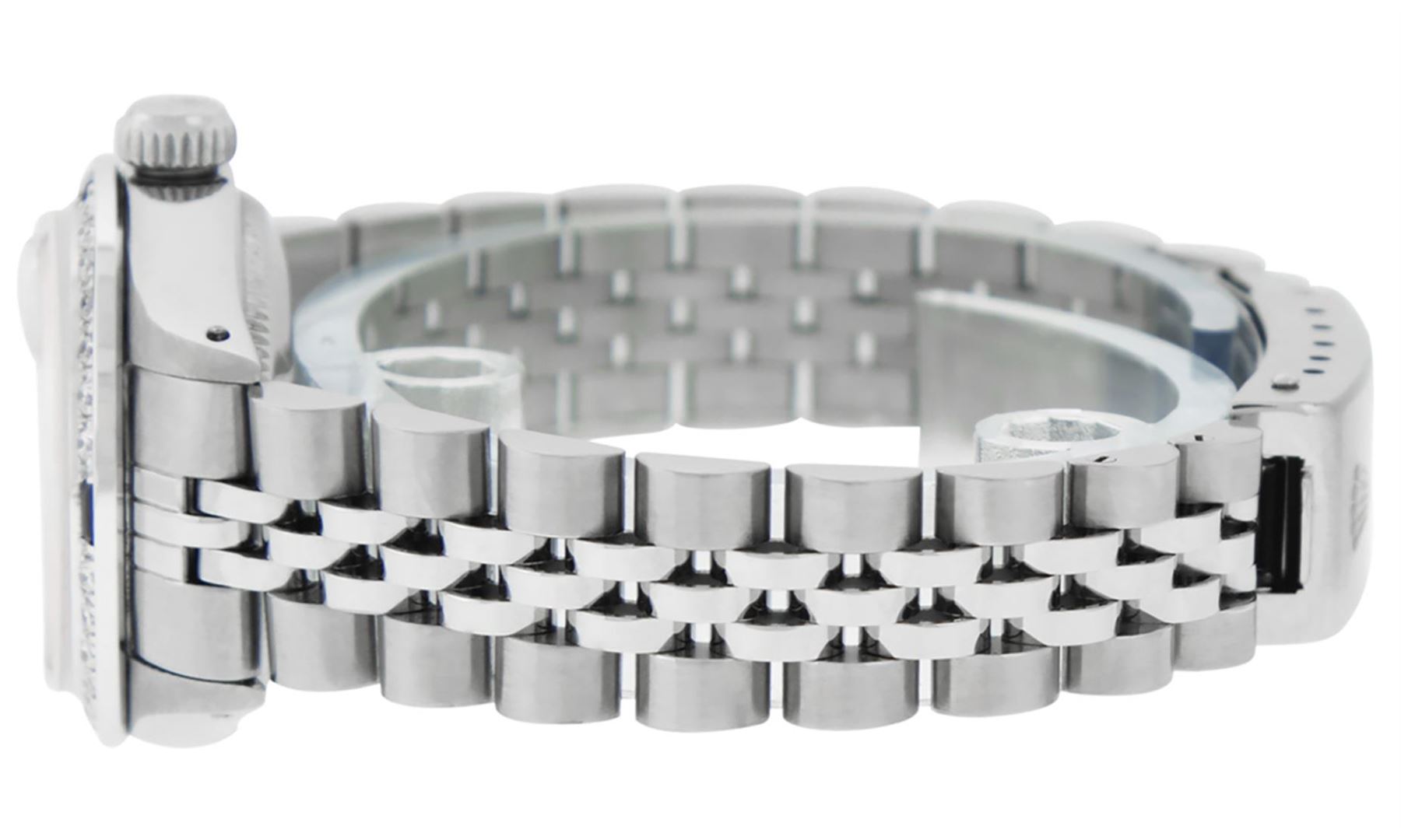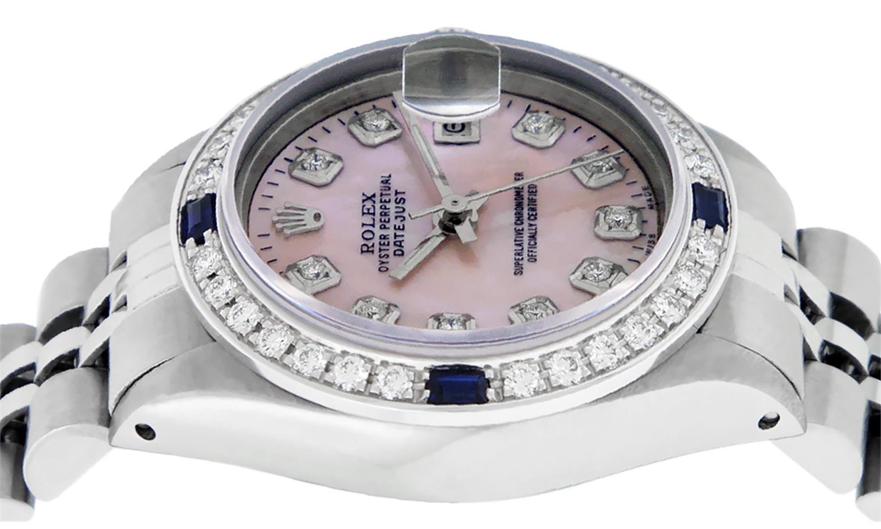 One Ladies Stainless Steel Rolex Datejust Polished Bright with Satin Finish, Serviced & Electronically Tested, Stainless Steel Case: 26mm, Stainless Steel Crown, Custom Bezel: New 18K White Gold Sapphire Beadset Diamond Bezel, Diamond + Gem Count: 28 Diamonds + 4 Sapphires. Total Weight .70 Carat, Clarity: SI-VS, Color: G to H. Custom Crystal: New Synthetic Sapphire Cyclops Lens. Custom Hands: New Luminescent Hands. Movement: Automatic Winding Movement Caliber 2030. Custom Dial: Refinished Pink Mother Of Pearl With Diamond Hour Markers, Diamond Count: 10 Diamond in Dial, G To H In Color, Clarity: SI-VS. Date Window: 3 O'Clock Position Date Display, Model: Datejust. Condition: G-6 Extra Fine. Bracelet: Stainless Steel Jubilee. Bright Polish & Satin Finish. 6.0 Inch Length, Adjustable. Standard Clasp, With Rolex Logo. This Watch Has Been Serviced Time Tested And Is In Excellent Condition It Is Free Of All Scratches And Dents.