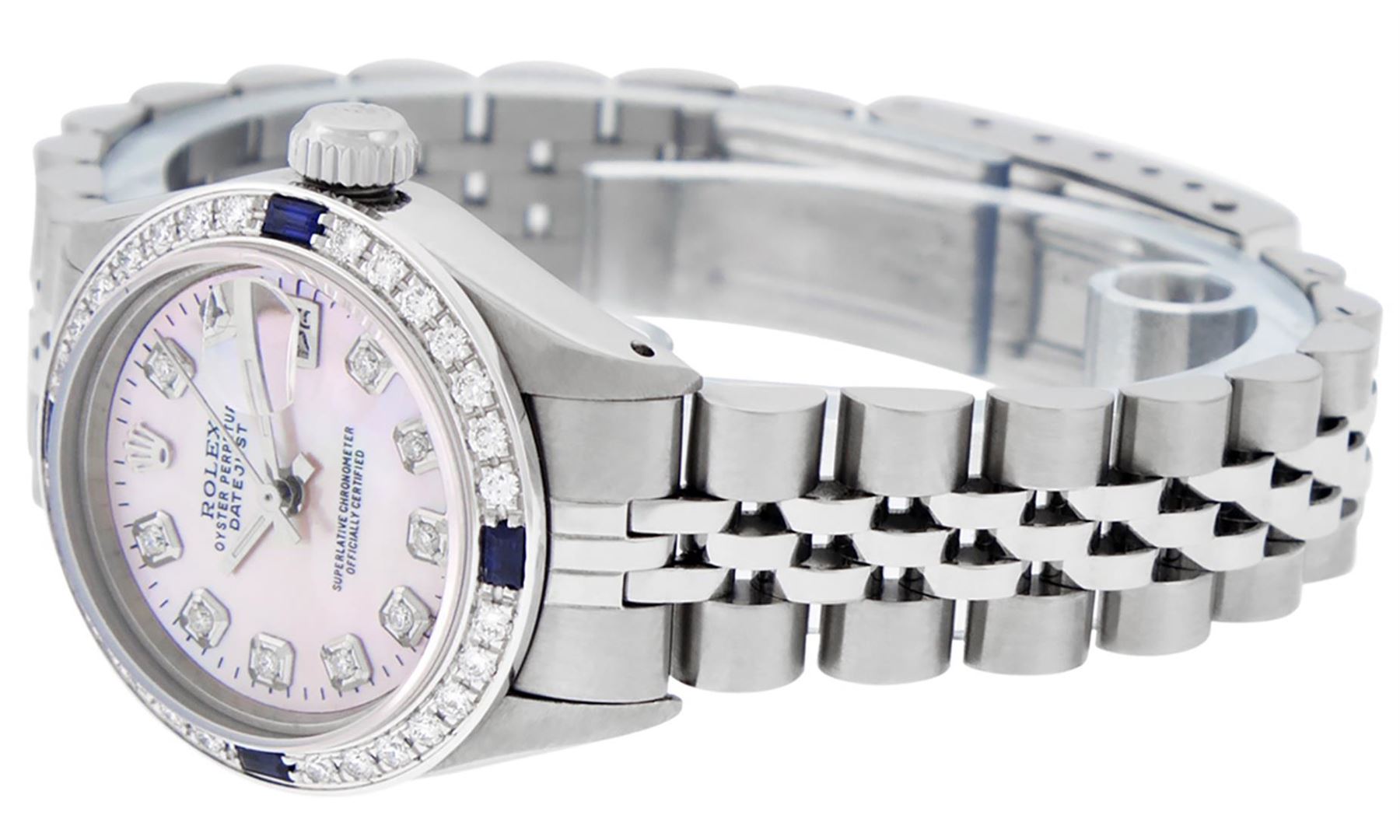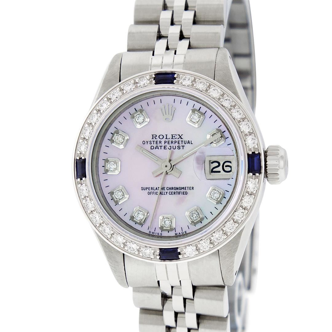 One Ladies Stainless Steel Rolex Datejust Polished Bright with Satin Finish, Serviced & Electronically Tested, Stainless Steel Case: 26mm, Stainless Steel Crown, Custom Bezel: New 18K White Gold Sapphire Beadset Diamond Bezel, Diamond + Gem Count: 28 Diamonds + 4 Sapphires. Total Weight .70 Carat, Clarity: SI-VS, Color: G to H. Custom Crystal: New Synthetic Sapphire Cyclops Lens. Custom Hands: New Luminescent Hands. Movement: Automatic Winding Movement. Custom Dial: Refinished Pink Mother Of Pearl With Diamond Hour Markers, Diamond Count: 10 Diamond in Dial, G To H In Color, Clarity: SI-VS. Date Window: 3 O'clock Position Date Display, Model: Datejust. Condition: G-6 Extra Fine. Bracelet: Stainless Steel Jubilee. Bright Polish & Satin Finish. 6.0 Inch Length, Adjustable. Standard Clasp, With Rolex Logo. This Watch Has Been Serviced Time Tested And Is In Excellent Condition It Is Free Of All Scratches And Dents.