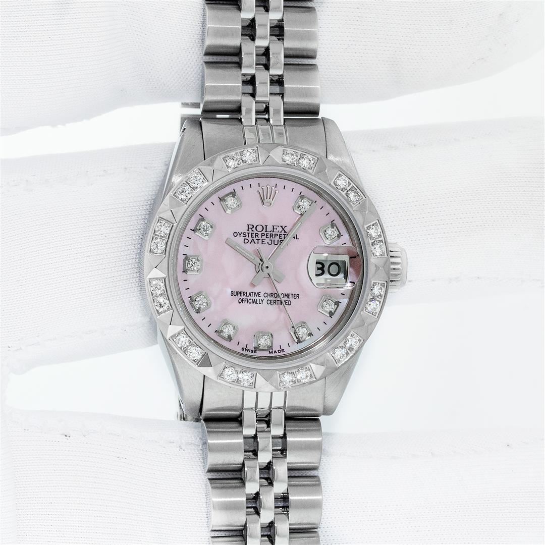 One Ladies Stainless Steel Rolex Datejust Polished Bright with Satin Finish, Serviced & Electronically Tested, Rolex Stainless Steel Case: 26mm, Rolex Stainless Steel Crown, Custom Bezel: New 18K White Gold Pyramid Diamond Bezel, Diamond Count: 24 Diamonds In Dial. Total Weight .50 Carat, Clarity: SI-VS, Color: G to H. Custom Crystal: New Sapphire With Magnified Date Window. Custom Hands: New Luminescent Hands. Rolex Movement: Automatic Winding Movement. Custom Dial: Light Pink Mother Of Pearl Diamond Dial. Diamond Count: 10 Diamonds In Dial. Clarity: SI-VS, Color: G to H. Date Window: 3 O'clock Position Date Display, Model: Datejust. Condition: G-6 Extra Fine. Rolex Bracelet: Stainless Steel Jubilee Band With Rolex Crown On Buckle. Bright Polish & Satin Finish. Band Length: 6.0 Inch Length, Adjustable. Standard Clasp, With Rolex Logo. This Pre Owned Watch Has Been Serviced Time Tested And Is In Excellent Condition It Is Free Of All Scratches And Dents. This Watch Comes With A Rolex Box.