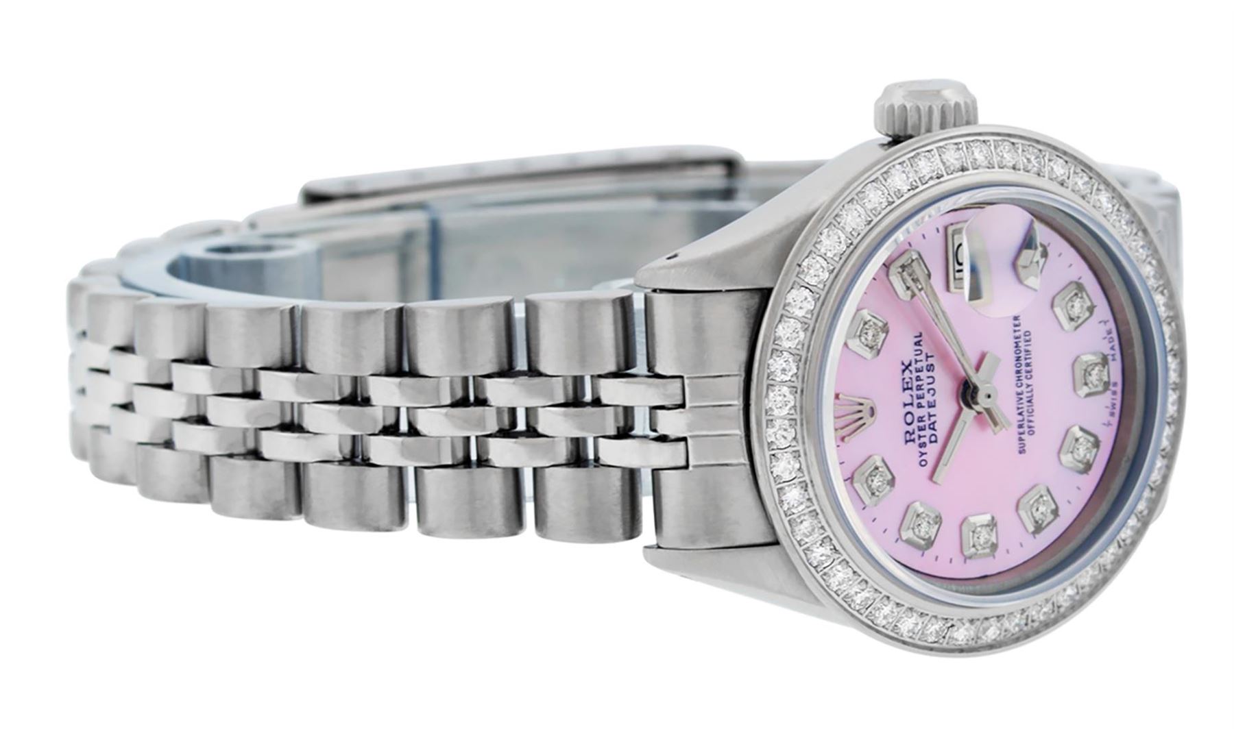 Rolex Ladies Stainless Steel Rolex Datejust Polished Bright with Satin Finish, Serviced & Electronically Tested, Stainless Steel Case: 26mm, Stainless Steel Crown, Custom Bezel: New Stainless Steel Beadset Diamond Bezel, Diamond Count: 44 Diamonds Total Weight 1.00 Carat, Clarity: SI-VS, Color: G to H. Custom Crystal: New Synthetic Sapphire Cyclops Lens. Custom Hands: New Luminescent Hands. Movement: Automatic Winding Movement. Custom Dial: Refinished Pink Mother Of Pearl With Diamond Hour Markers, Diamond Count: 10 Diamonds in Dial G To H In Color, Clarity: SI-VS. Date Window: 3 O'Clock Position Date Display, Model: Datejust. Condition: G-6 Extra Fine. Bracelet: Stainless Steel Jubilee Band. Bright Polish & Satin Finish. 6.0 Inch Length, Adjustable. Standard Clasp, With Rolex Logo. This Watch Has Been Serviced Time Tested And Is In Excellent Condition It Is Free Of All Scratches And Dents.
