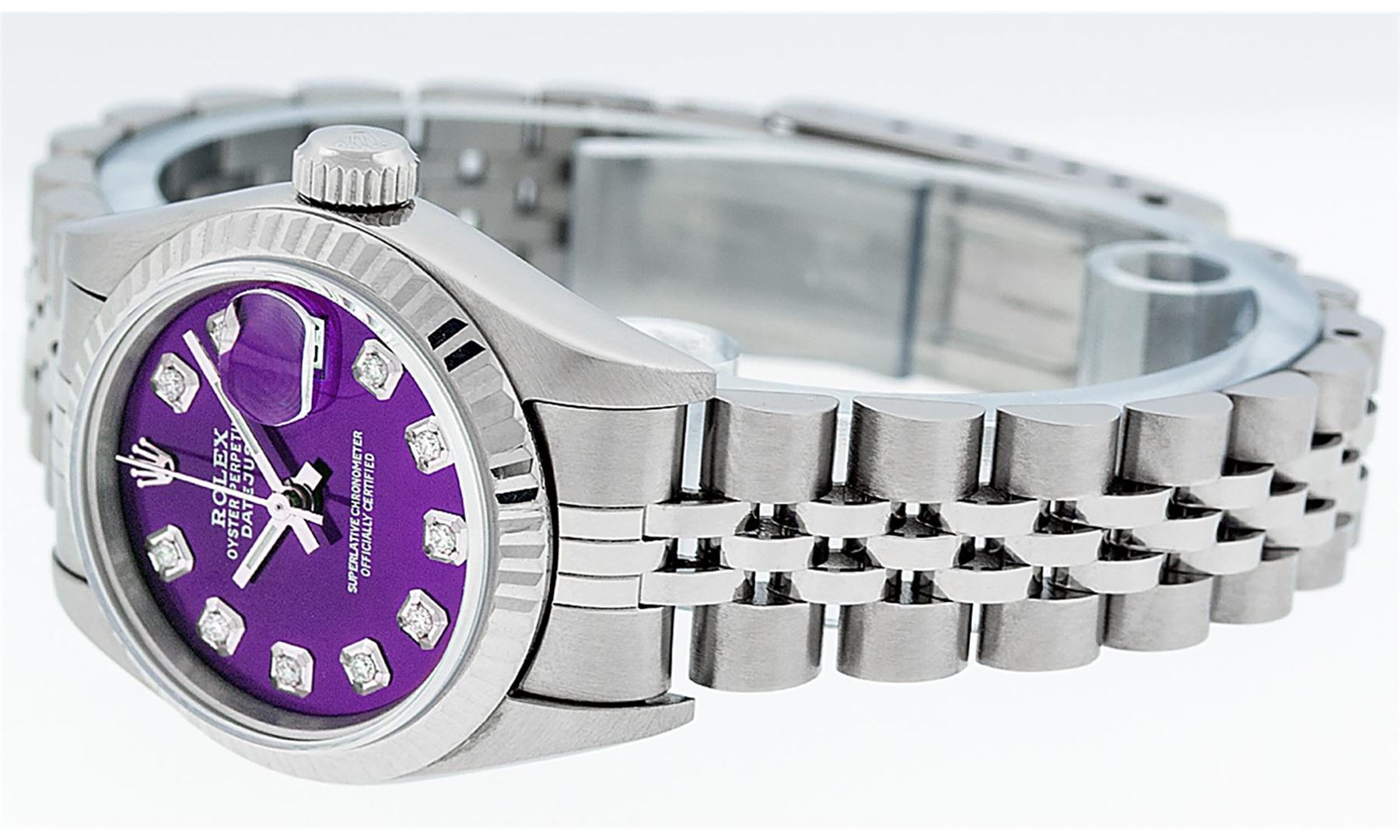 One Ladies Quickset Stainless Steel Rolex Datejust Polished Bright with Satin Finish, Serviced & Electronically Tested, Stainless Steel Case: 26mm, Stainless Steel Crown, Bezel: 18K White Gold Fluted Bezel. Custom Crystal: New Scratch Resistant Sapphire Cyclops Lens. Custom Hands: New Luminescent Hands. Movement: Automatic Winding Movement Caliber 2235. Custom Dial: Purple Diamond Dial, Diamond Count: 10 Diamonds In Dial, Color: G to H, Clarity: SI1 Date Window: 3 O'Clock Position Date Display, Model: 79174 Quickset Datejust. Condition: G-6 Extra Fine. Bracelet: Stainless Steel Jubilee Band. Bright Polish & Satin Finish. 6.0 Inch Length, Adjustable. Standard Clasp, With Rolex Logo. This Watch Has Been Serviced Time Tested And Is In Excellent Condition It Is Free Of All Scratches And Dents.