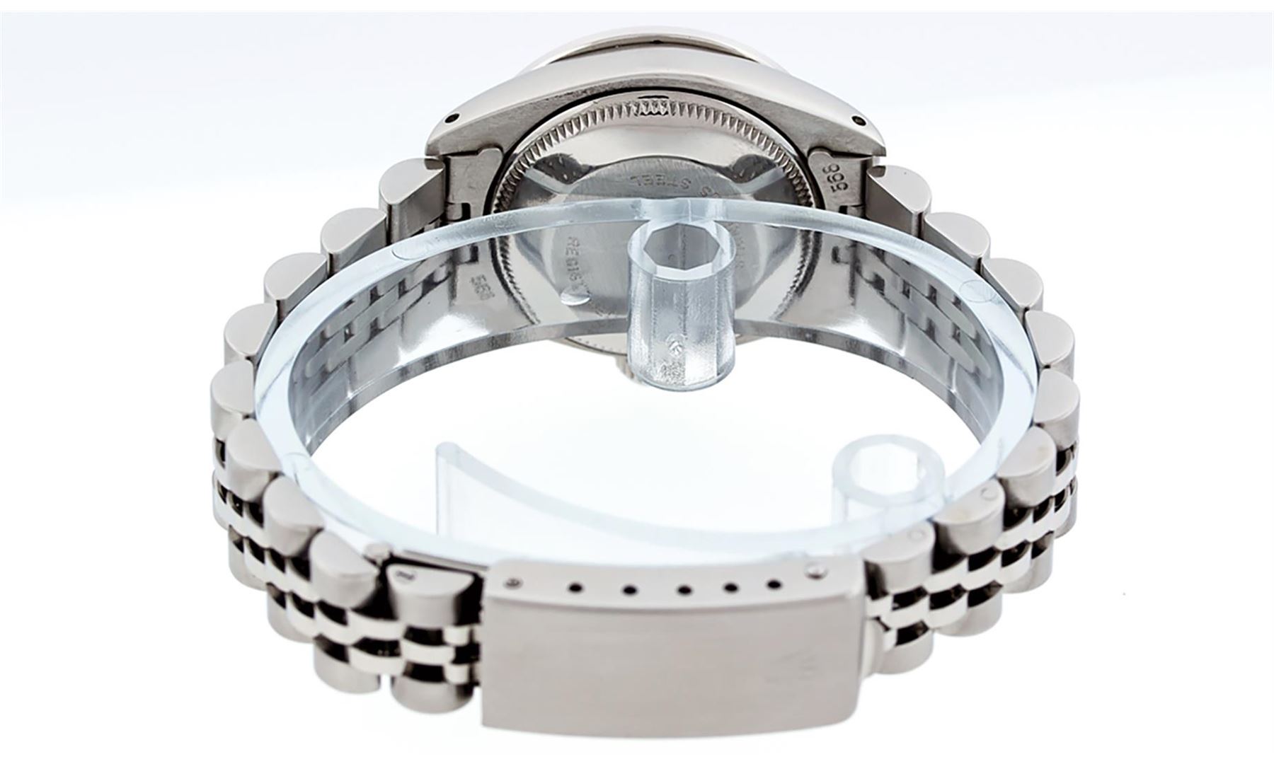 One Ladies Stainless Steel Rolex Datejust Polished Bright with Satin Finish, Serviced & Electronically Tested, Stainless Steel Case: 26mm, Stainless Steel Crown, Custom Bezel: New 18K White Gold Ruby Beadset Diamond Bezel, Diamond + Gem Count: 28 Diamonds + 4 Rubies. Total Weight .70 Carat, Clarity: SI-VS, Color: G to H. Custom Crystal: New Synthetic Sapphire Cyclops Lens. Custom Hands: New Luminescent Hands. Movement: Automatic Winding Movement Caliber 2030. Custom Dial: Refinished Purple With Diamond Hour Markers, Diamond Count: 10 Diamond in Dial, G To H In Color, Clarity: SI-VS. Date Window: 3 O'Clock Position Date Display, Model: Datejust. Condition: G-6 Extra Fine. Bracelet: Stainless Steel Jubilee. Bright Polish & Satin Finish. 6.0 Inch Length, Adjustable. Standard Clasp, With Rolex Logo. This Watch Has Been Serviced Time Tested And Is In Excellent Condition It Is Free Of All Scratches And Dents.