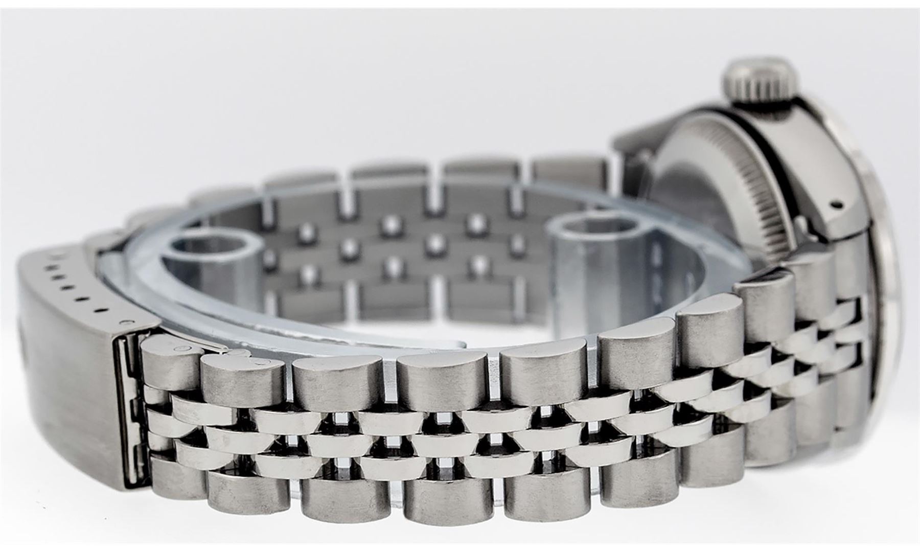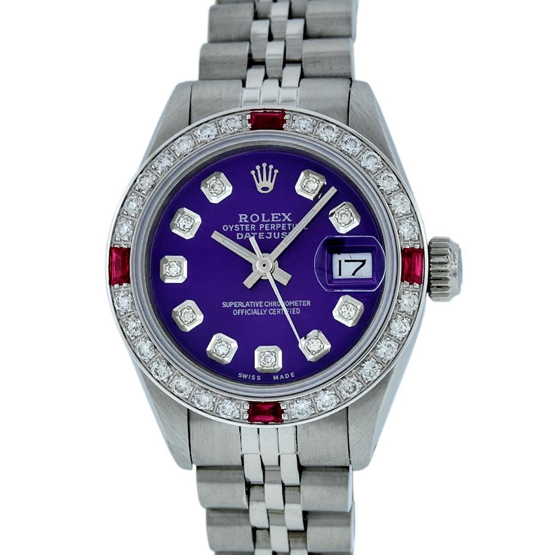 One Ladies Stainless Steel Rolex Datejust Polished Bright with Satin Finish, Serviced & Electronically Tested, Stainless Steel Case: 26mm, Stainless Steel Crown, Custom Bezel: New 18K White Gold Ruby Beadset Diamond Bezel, Diamond + Gem Count: 28 Diamonds + 4 Rubies. Total Weight .70 Carat, Clarity: SI-VS, Color: G to H. Custom Crystal: New Synthetic Sapphire Cyclops Lens. Custom Hands: New Luminescent Hands. Movement: Automatic Winding Movement. Custom Dial: Refinished Purple With Diamond Hour Markers, Diamond Count: 10 Diamond in Dial, G To H In Color, Clarity: SI-VS. Date Window: 3 O'clock Position Date Display, Model: Datejust. Condition: G-6 Extra Fine. Bracelet: Stainless Steel Jubilee. Bright Polish & Satin Finish. 6.0 Inch Length, Adjustable. Standard Clasp, With Rolex Logo. This Watch Has Been Serviced Time Tested And Is In Excellent Condition It Is Free Of All Scratches And Dents.