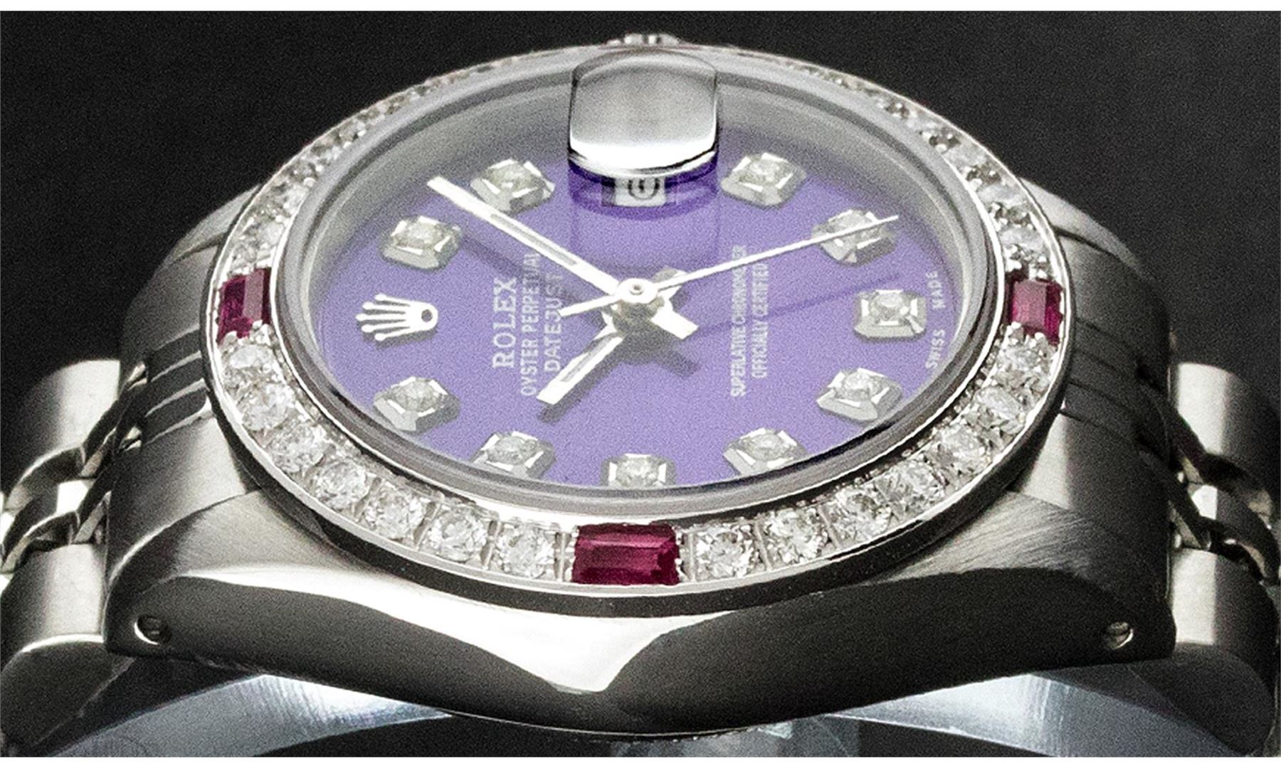 One Ladies Stainless Steel Rolex Datejust Polished Bright with Satin Finish, Serviced & Electronically Tested, Stainless Steel Case: 26mm, Stainless Steel Crown, Custom Bezel: New 18K White Gold Ruby Beadset Diamond Bezel, Diamond + Gem Count: 28 Diamonds + 4 Rubies. Total Weight .70 Carat, Clarity: SI-VS, Color: G to H. Custom Crystal: New Synthetic Sapphire Cyclops Lens. Custom Hands: New Luminescent Hands. Movement: Automatic Winding Movement. Custom Dial: Refinished Purple With Diamond Hour Markers, Diamond Count: 10 Diamond in Dial, G To H In Color, Clarity: SI-VS. Date Window: 3 O'Clock Position Date Display, Model: Datejust. Condition: G-6 Extra Fine. Bracelet: Stainless Steel Jubilee. Bright Polish & Satin Finish. 6.0 Inch Length, Adjustable. Standard Clasp, With Rolex Logo. This Watch Has Been Serviced Time Tested And Is In Excellent Condition It Is Free Of All Scratches And Dents.