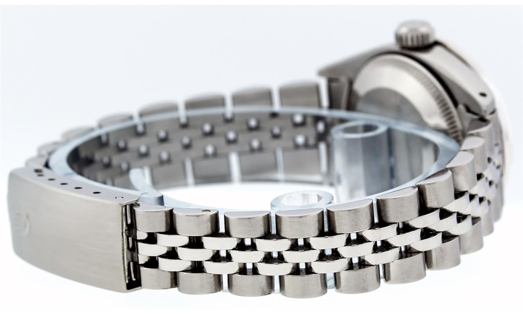One Ladies Stainless Steel Rolex Datejust Polished Bright with Satin Finish, Serviced & Electronically Tested, Stainless Steel Case: 26mm, Stainless Steel Crown, Custom Bezel: New 18K White Gold Sapphire Beadset Diamond Bezel, Diamond + Gem Count: 28 Diamonds + 4 Sapphires, Total Weight .70 Carat, Clarity: SI-VS, Color: G to H. Custom Crystal: New Scratch Resistant Synthetic Sapphire Cyclops Lens. Custom Hands: New Luminescent Hands. Movement: Automatic Winding Movement Caliber 2030. Custom Dial: Purple Roman Dial With Square Track. Date Window: 3 O'Clock Position Date Display, Model: Datejust. Condition: G-6 Extra Fine. Bracelet: Stainless Steel Jubilee. Bright Polish & Satin Finish. 6.0 Inch Length, Adjustable. Standard Clasp, With Rolex Logo. This Watch Has Been Serviced Time Tested And Is In Excellent Condition It Is Free Of All Scratches And Dents.