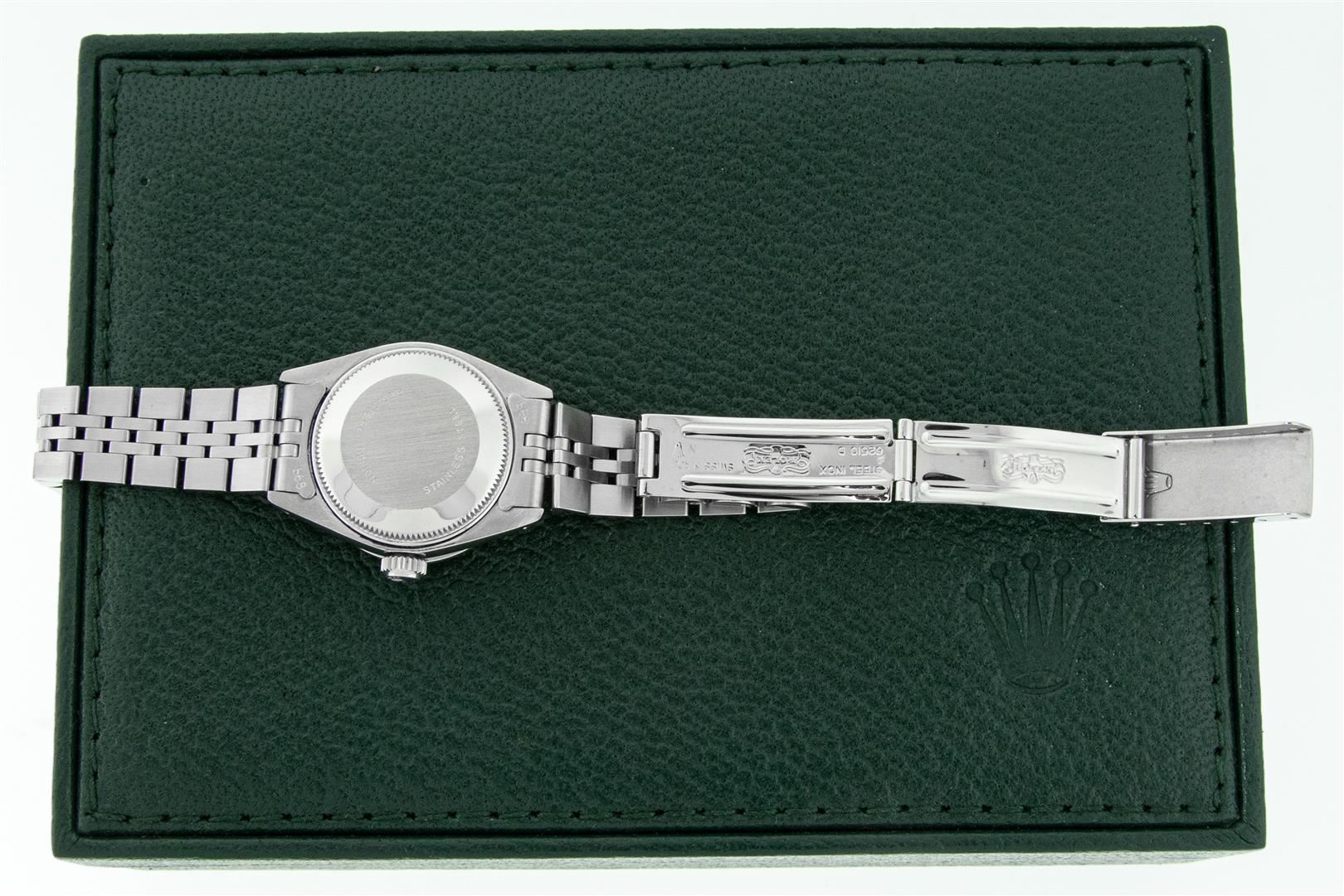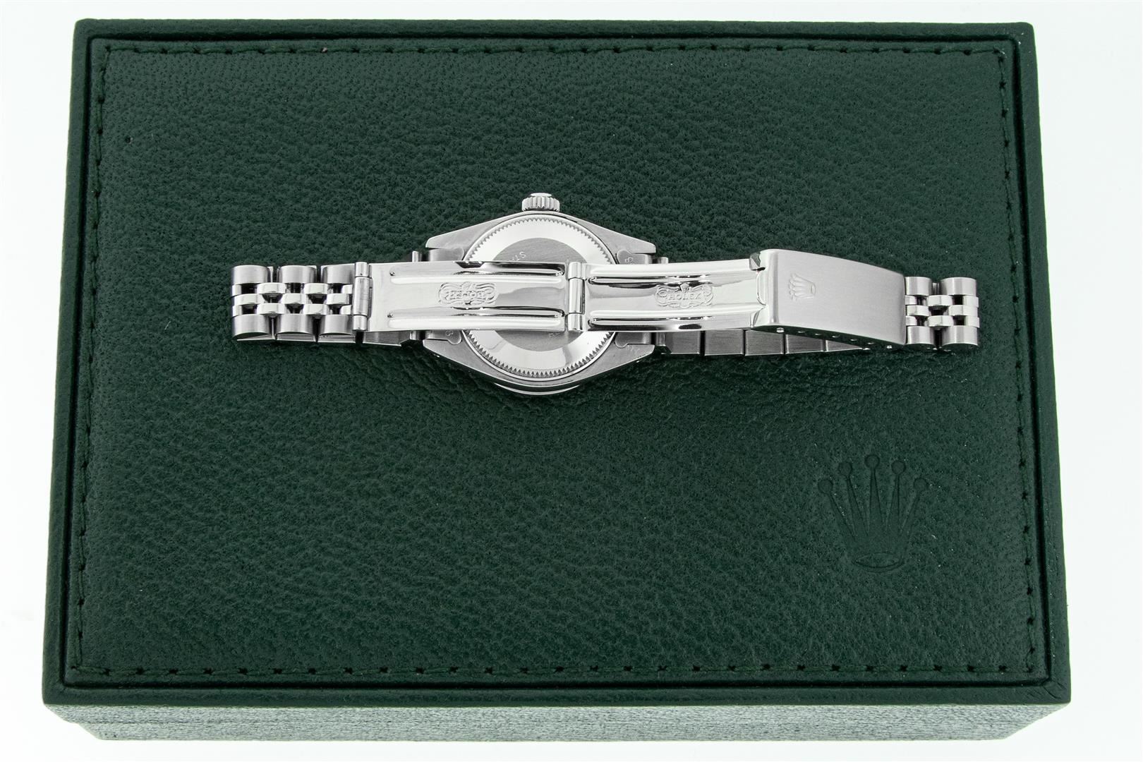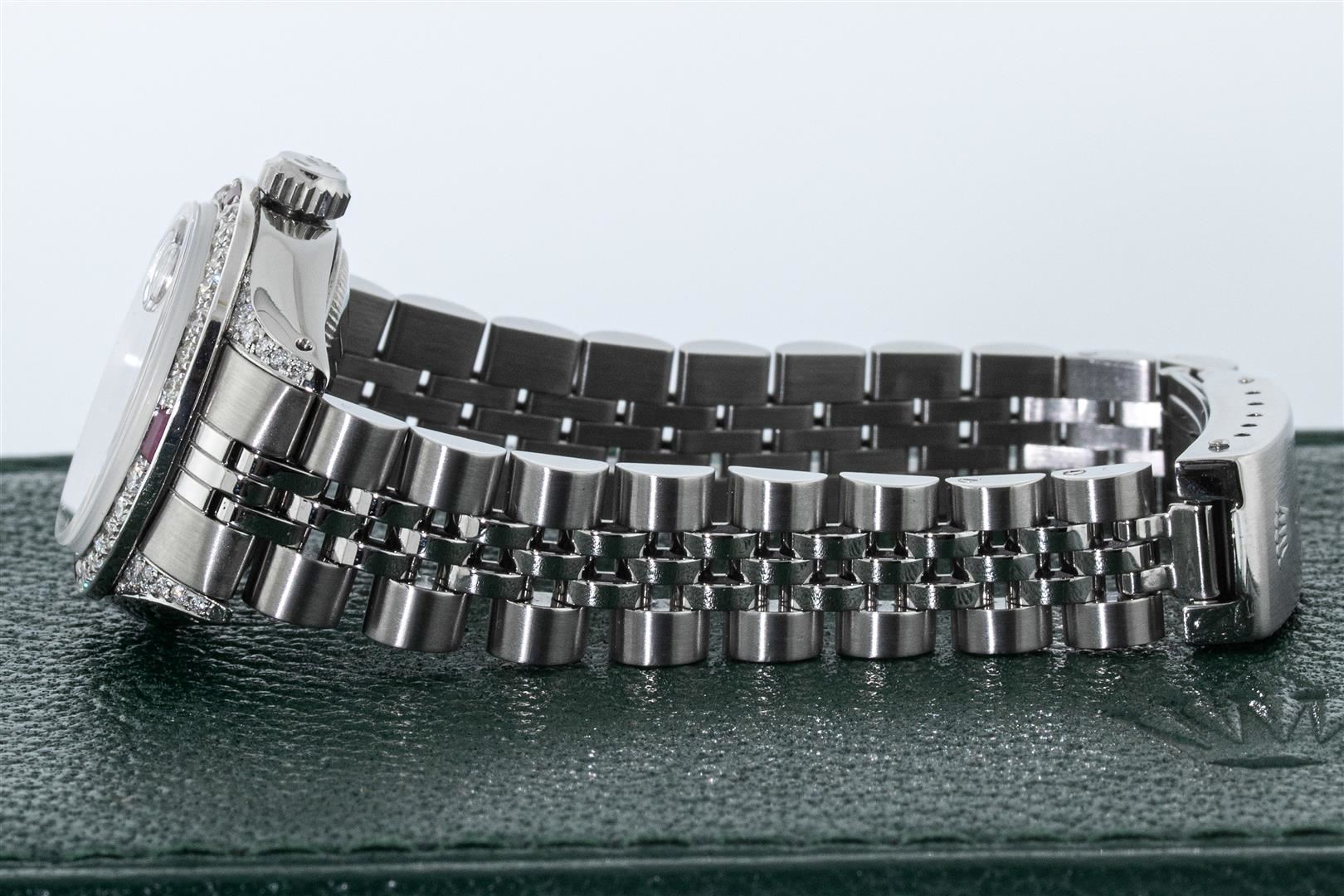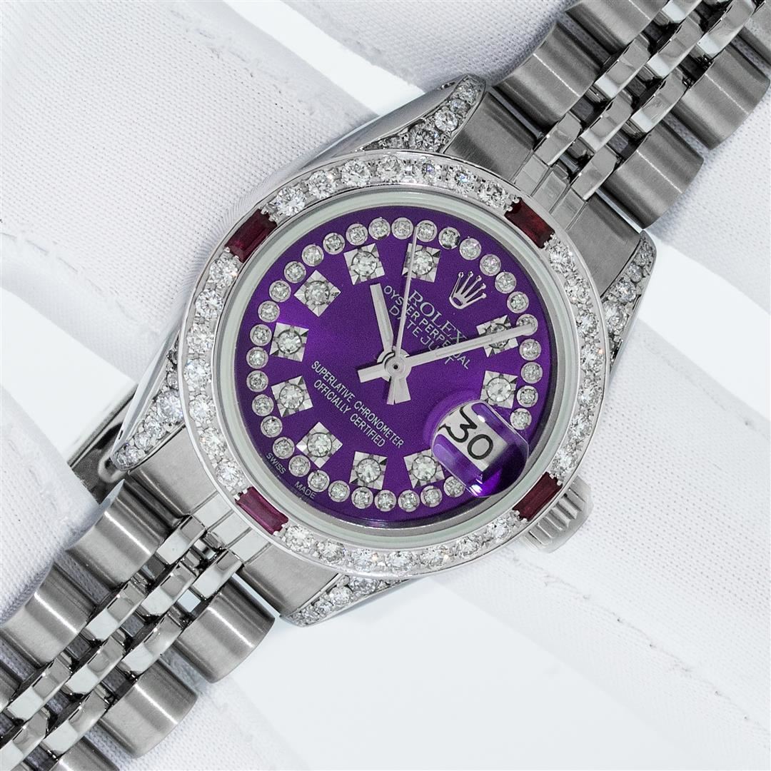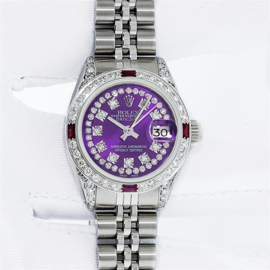One Ladies Stainless Steel Rolex Datejust Polished Bright with Satin Finish, Serviced & Electronically Tested, Rolex Stainless Steel Case: 26mm, Rolex Stainless Steel Crown, Custom Diamond Lugs: 24 Diamonds On Lugs, Clarity: SI-VS, Color: G to H. Custom Bezel: New 18K White Gold Diamond + Ruby Beadset Diamond Bezel, Stone Count: 28 Diamonds + 4 Rubies, Total Weight .70 Carat, Clarity: SI-VS, Color: G to H. Custom Crystal: New Sapphire With Magnified Date Window. Custom Hands: New Luminescent Hands. Rolex Movement: Automatic Winding Movement. Custom Dial: Refinished To Purple With Custom Added Diamonds, 43 Diamonds in Dial G To H In Color, Clarity: VS. Date Window: 3 O'clock Position Date Display, Model: Datejust. Condition: G-6 Extra Fine. Rolex Bracelet: Stainless Steel Jubilee Band. Bright Polish & Satin Finish. 6.0 Inch Length, Adjustable. Standard Clasp, With Rolex Logo. This Pre Owned Watch Has Been Serviced Time Tested And Is In Excellent Condition It Is Free Of All Scratches And Dents. This Watch Comes With A Rolex Box.