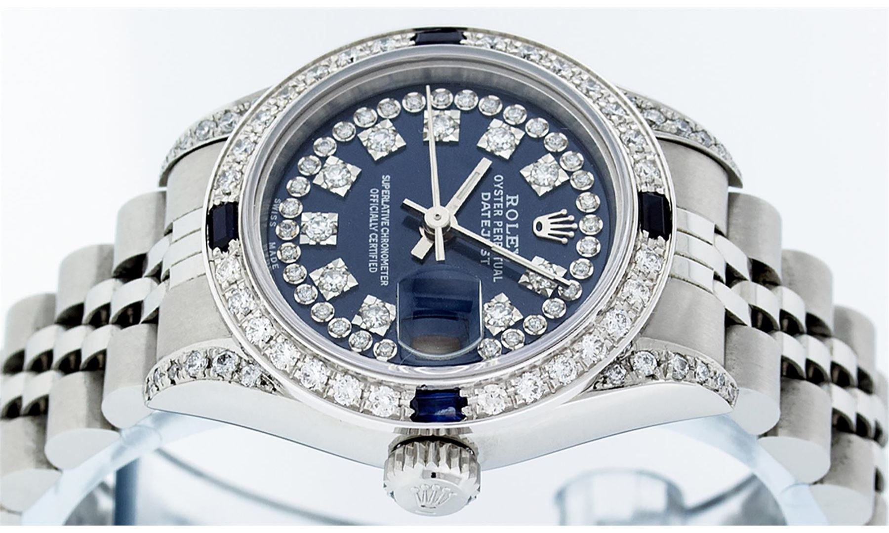 One Quickset Ladies Stainless Steel Rolex Datejust Polished Bright with Satin Finish, Serviced & Electronically Tested, Stainless Steel Case: 26mm, Stainless Steel Crown, Custom Diamond Lugs: 24 Diamonds On Lugs, Clarity: SI-VS, Color: G to H. Custom Bezel: New 18K White Gold Diamond + Sapphire Beadset Diamond Bezel, Stone Count: 28 Diamonds + 4 Sapphires, Total Weight .70 Carat, Clarity: SI-VS, Color: G to H. Custom Crystal: New Scratch Resistant Synthetic Sapphire Cyclops Lens. Custom Hands: New Luminescent Hands. Movement: Automatic Winding Movement Caliber 2235. Custom Dial: Refinished Single Cut Blue String Diamond Dial, 43 Diamonds in Dial G To H In Color, Clarity: VS. Date Window: 3 O'Clock Position Date Display, Model: Quickset Datejust. Condition: G-6 Extra Fine. Bracelet: Stainless Steel Jubilee Band. Bright Polish & Satin Finish. 6.0 Inch Length, Adjustable. Standard Clasp, With Rolex Logo. This Watch Has Been Serviced Time Tested And Is In Excellent Condition It Is Free Of All Scratches And Dents.