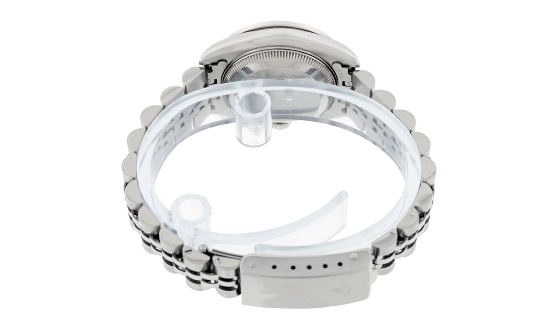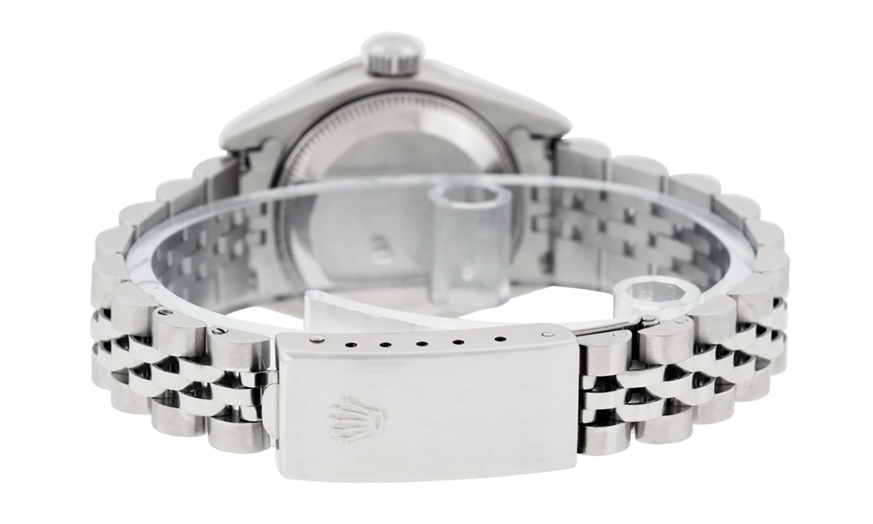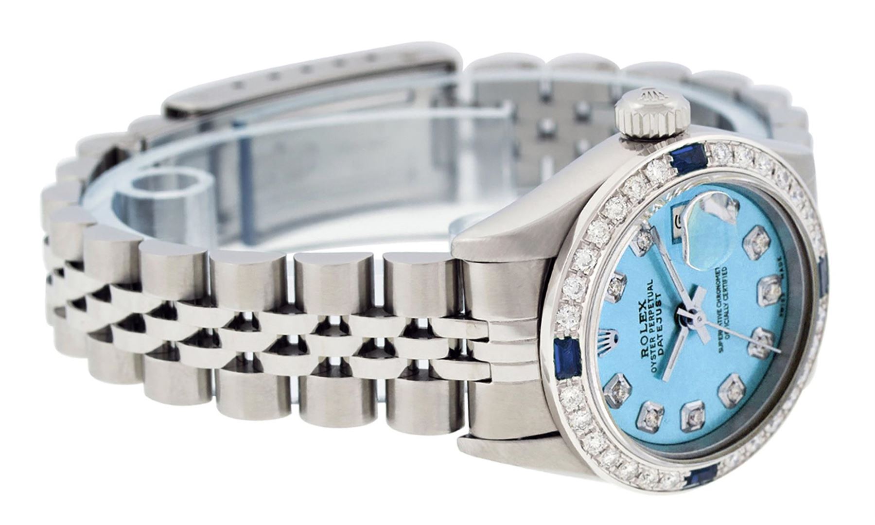 One Quickset Ladies Stainless Steel Rolex Datejust Polished Bright with Satin Finish, Serviced & Electronically Tested, Stainless Steel Case: 26mm, Stainless Steel Crown, Custom Bezel: New 18K White Gold Diamond + Sapphire Beadset Diamond Bezel, Stone Count: 28 Diamonds + 4 Sapphires, Total Weight .70 Carat, Clarity: SI-VS, Color: G to H. Custom Crystal: New Scratch Resistant Synthetic Sapphire Cyclops Lens. Custom Hands: New Luminescent Hands. Movement: Automatic Winding Movement Caliber 2235. Custom Dial: Refinished Sky Blue Diamond Dial, 10 Diamonds in Dial G To H In Color, Clarity: VS. Date Window: 3 O'Clock Position Date Display, Model: 79174 Quickset Datejust. Condition: G-6 Extra Fine. Bracelet: Stainless Steel Jubilee Band. Bright Polish & Satin Finish. 6.0 Inch Length, Adjustable. Standard Clasp, With Rolex Logo. This Watch Has Been Serviced Time Tested And Is In Excellent Condition It Is Free Of All Scratches And Dents.