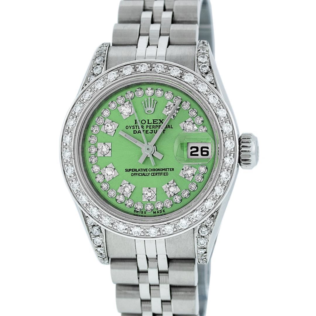 One Quickset Ladies Stainless Steel Rolex Datejust Polished Bright with Satin Finish, Serviced & Electronically Tested, Stainless Steel Case: 26mm, Stainless Steel Crown, Custom Diamond Lugs: 24 Diamonds On Lugs, Clarity: SI-VS, Color: G to H. Custom Bezel: New 18K White Gold Beadset Diamond Bezel, Stone Count: 32 Diamonds On Bezel, Total Bezel Weight .70 Carat, Clarity: SI-VS, Color: G to H. Custom Crystal: New Scratch Resistant Synthetic Sapphire Cyclops Lens. Custom Hands: New Luminescent Hands. Movement: Automatic Winding Movement Caliber 2235. Custom Dial: Refinished Single Cut Green String Diamond Dial, 43 Diamonds in Dial G To H In Color, Clarity: VS. Date Window: 3 O'Clock Position Date Display, Model: 79160 Quickset Datejust. Condition: G-6 Extra Fine. Bracelet: Stainless Steel Jubilee Band. Bright Polish & Satin Finish. 6.0 Inch Length, Adjustable. Standard Clasp, With Rolex Logo. This Watch Has Been Serviced Time Tested And Is In Excellent Condition It Is Free Of All Scratches And Dents.