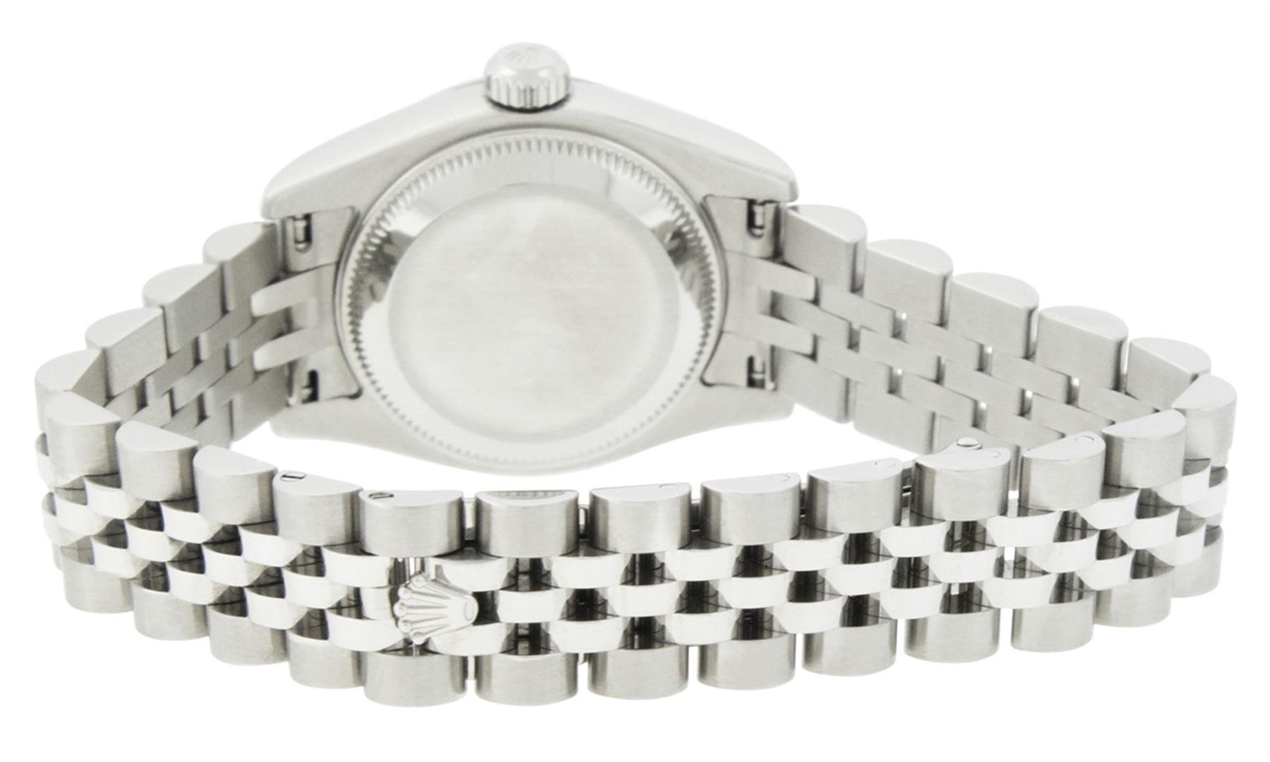 One Quickset Ladies Stainless Steel Rolex Datejust Polished Bright with Satin Finish, Serviced & Electronically Tested, Stainless Steel Case: 26mm, Stainless Steel Crown, Custom Bezel: New 18K White Gold Beadset +Sapphire Diamond Bezel, Stone Count: 28 Diamonds + 4 Sapphires On Bezel, Total Weight .70 Carat, Clarity: SI-VS, Color: G to H. Custom Crystal: New Scratch Resistant Synthetic Sapphire Cyclops Lens. Custom Hands: New Luminescent Hands. Movement: Automatic Winding Movement Caliber 2235. Custom Dial: Refinished Mother Of Pearl Diamond Dial, Stone Count: 10 Diamonds On Dial, G To H In Color, Clarity: VS. Date Window: 3 O'Clock Position Date Display, Model: 179160 Quickset Datejust. Condition: G-6 Extra Fine. Bracelet: Stainless Steel Jubilee Band. Bright Polish & Satin Finish. 6.0 Inch Length, Adjustable. Standard Clasp, With Rolex Logo. This Watch Has Been Serviced Time Tested And Is In Excellent Condition It Is Free Of All Scratches And Dents.
