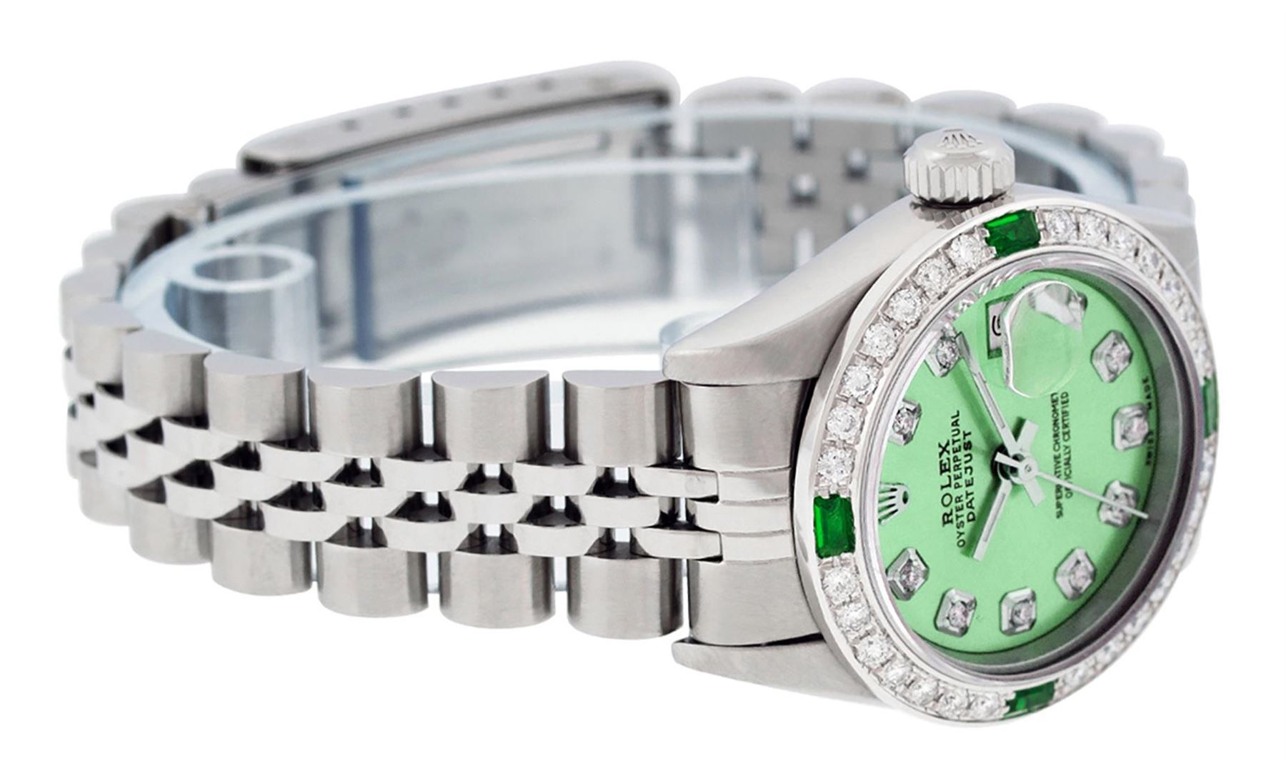 One Quickset Ladies Stainless Steel Rolex Datejust Polished Bright with Satin Finish, Serviced & Electronically Tested, Stainless Steel Case: 26mm, Stainless Steel Crown, Custom Bezel: New 18K White Gold Diamond + Emerald Beadset Diamond Bezel, Stone Count: 28 Diamonds + 4 Emeralds, Total Weight .70 Carat, Clarity: SI-VS, Color: G to H. Custom Crystal: New Scratch Resistant Synthetic Sapphire Cyclops Lens. Custom Hands: New Luminescent Hands. Movement: Automatic Winding Movement Caliber 2235. Custom Dial: Refinished Green Diamond Dial, 10 Diamonds in Dial G To H In Color, Clarity: VS. Date Window: 3 O'Clock Position Date Display, Model: Quickset Datejust. Condition: G-6 Extra Fine. Bracelet: Stainless Steel Jubilee Band. Bright Polish & Satin Finish. 6.0 Inch Length, Adjustable. Standard Clasp, With Rolex Logo. This Watch Has Been Serviced Time Tested And Is In Excellent Condition It Is Free Of All Scratches And Dents.