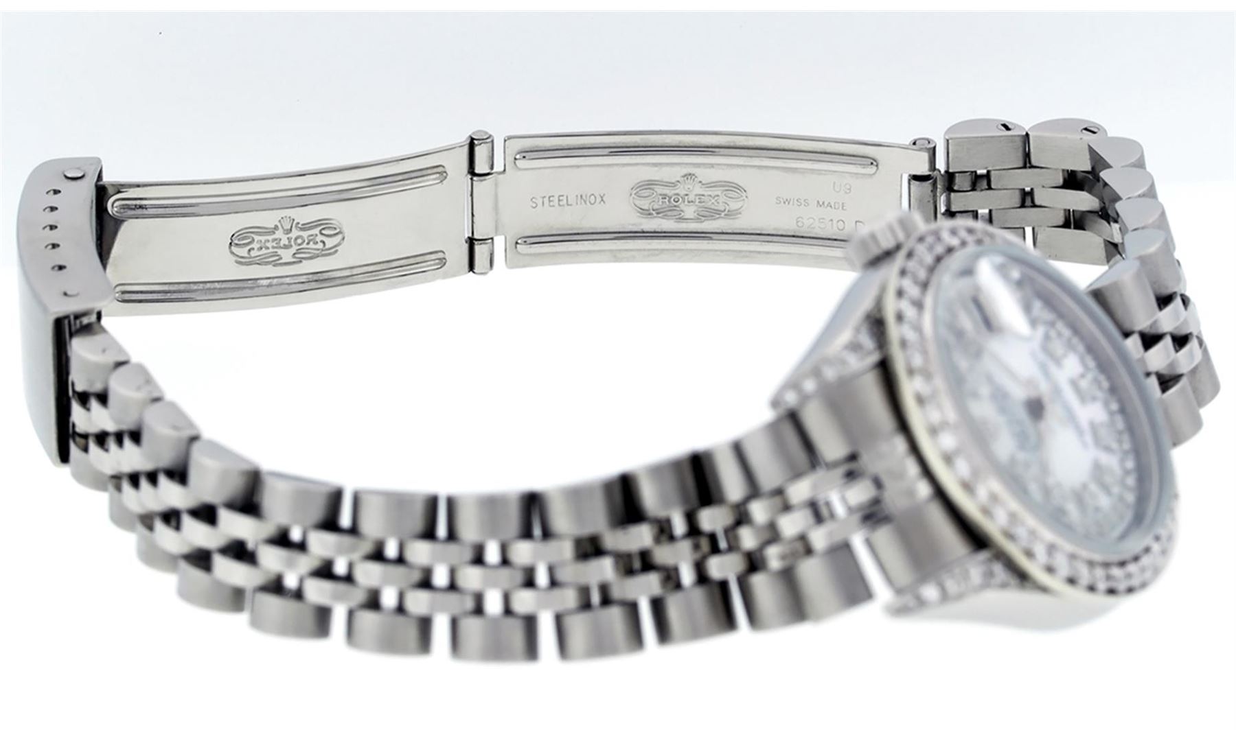 One Quickset Ladies Stainless Steel Rolex Datejust Polished Bright with Satin Finish, Serviced & Electronically Tested, Stainless Steel Case: 26mm, Stainless Steel Crown, Custom Diamond Lugs: 24 Diamonds On Lugs, Clarity: SI-VS, Color: G to H. Custom Bezel: New Stainless Steel Beadset Diamond Bezel, Stone Count:�39 Diamonds On Bezel, Total Weight .70 Carat, Clarity: SI-VS, Color: G to H. Custom Crystal: New Scratch Resistant Synthetic Sapphire Cyclops Lens. Custom Hands: New Luminescent Hands. Movement: Automatic Winding Movement Caliber 2235.�Custom Dial: Refinished Single Cut Mother Of Pearl String Diamond Dial, 43 Diamonds in Dial G To H In Color, Clarity: VS. Date Window: 3 O'Clock Position Date Display, Model: 79160 Quickset Datejust. Condition: G-6 Extra Fine. Bracelet: Stainless Steel Jubilee Band. Bright Polish & Satin Finish. 6.0 Inch Length, Adjustable. Standard Clasp, With Rolex Logo. This Watch Has Been Serviced Time Tested And Is In Excellent Condition It Is Free Of All Scratches And Dents. This Watch Comes With A Rolex Box.