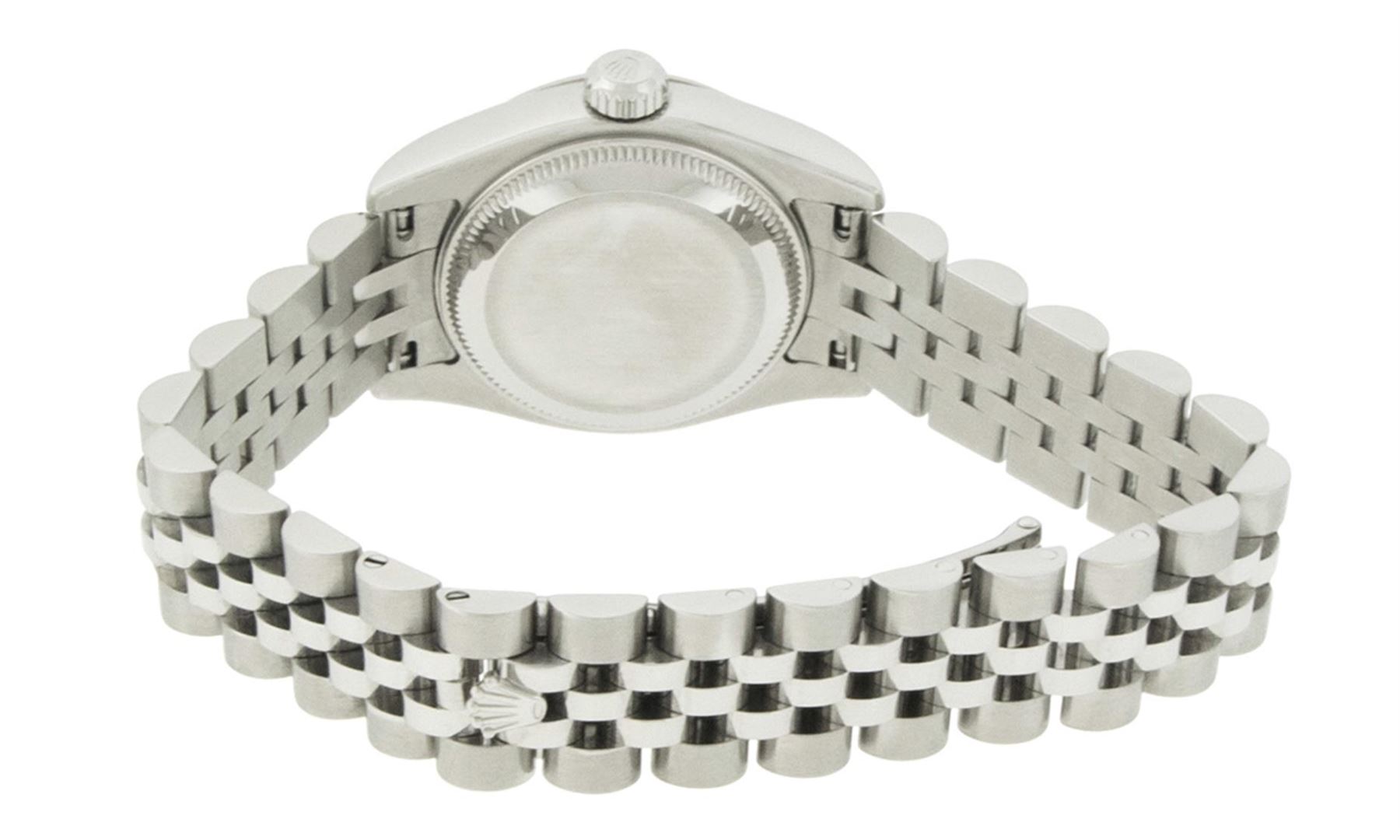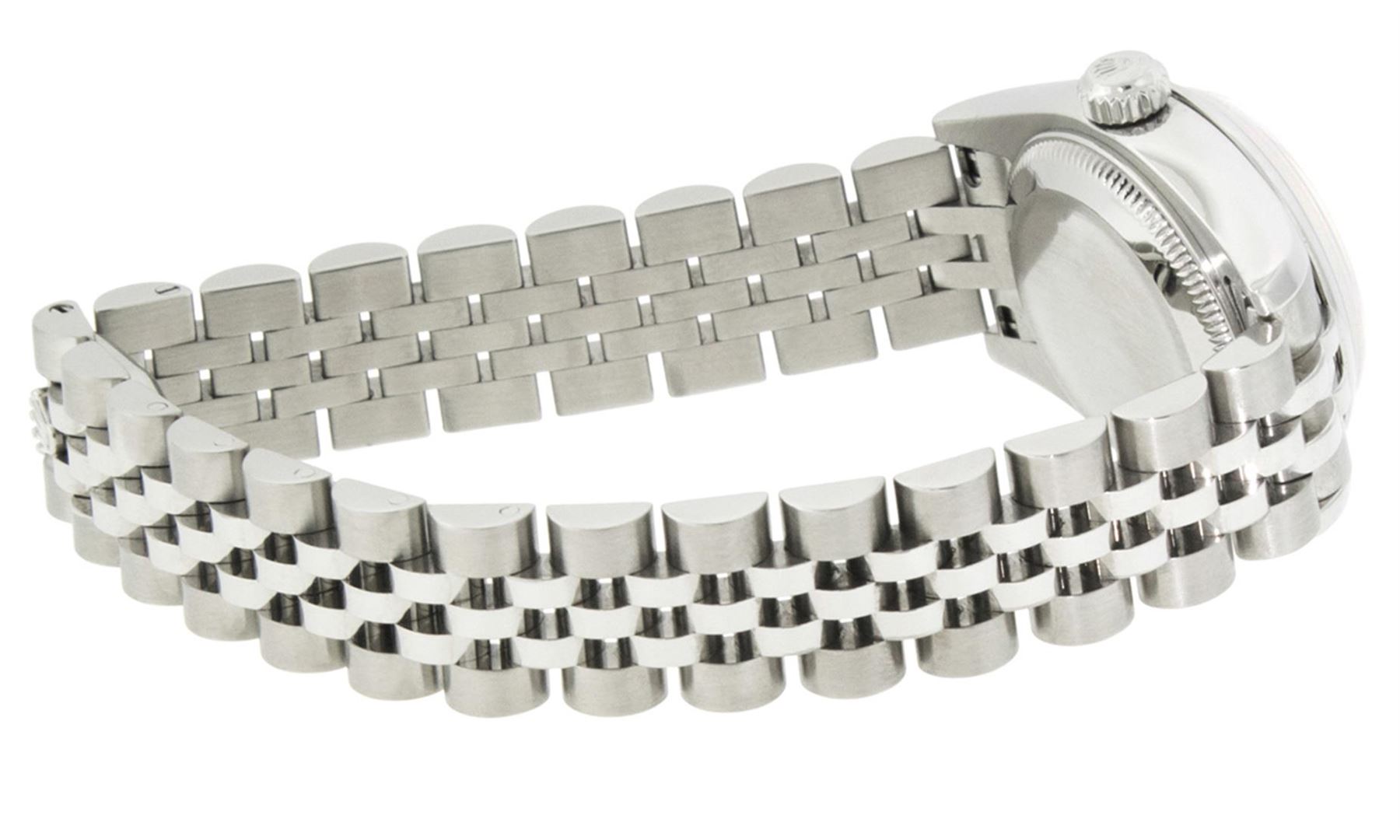 One Quickset Ladies Stainless Steel Rolex Datejust Polished Bright with Satin Finish, Serviced & Electronically Tested, Stainless Steel Case: 26mm, Stainless Steel Crown, Custom Bezel: New 18K White Gold Beadset + Emerald Diamond Bezel, Stone Count: 28 Diamonds + 4 Emeralds On Bezel, Total Weight .70 Carat, Clarity: SI-VS, Color: G to H. Custom Crystal: New Scratch Resistant Synthetic Sapphire Cyclops Lens. Custom Hands: New Luminescent Hands. Movement: Automatic Winding Movement Caliber 2235. Custom Dial: Refinished Mother Of Pearl Diamond Dial, Stone Count: 10 Diamonds On Dial, G To H In Color, Clarity: VS. Date Window: 3 O'Clock Position Date Display, Model: 179160 Quickset Datejust. Condition: G-6 Extra Fine. Bracelet: Stainless Steel Jubilee Band. Bright Polish & Satin Finish. 6.0 Inch Length, Adjustable. Standard Clasp, With Rolex Logo. This Watch Has Been Serviced Time Tested And Is In Excellent Condition It Is Free Of All Scratches And Dents. This Watch Comes With A Rolex Box.