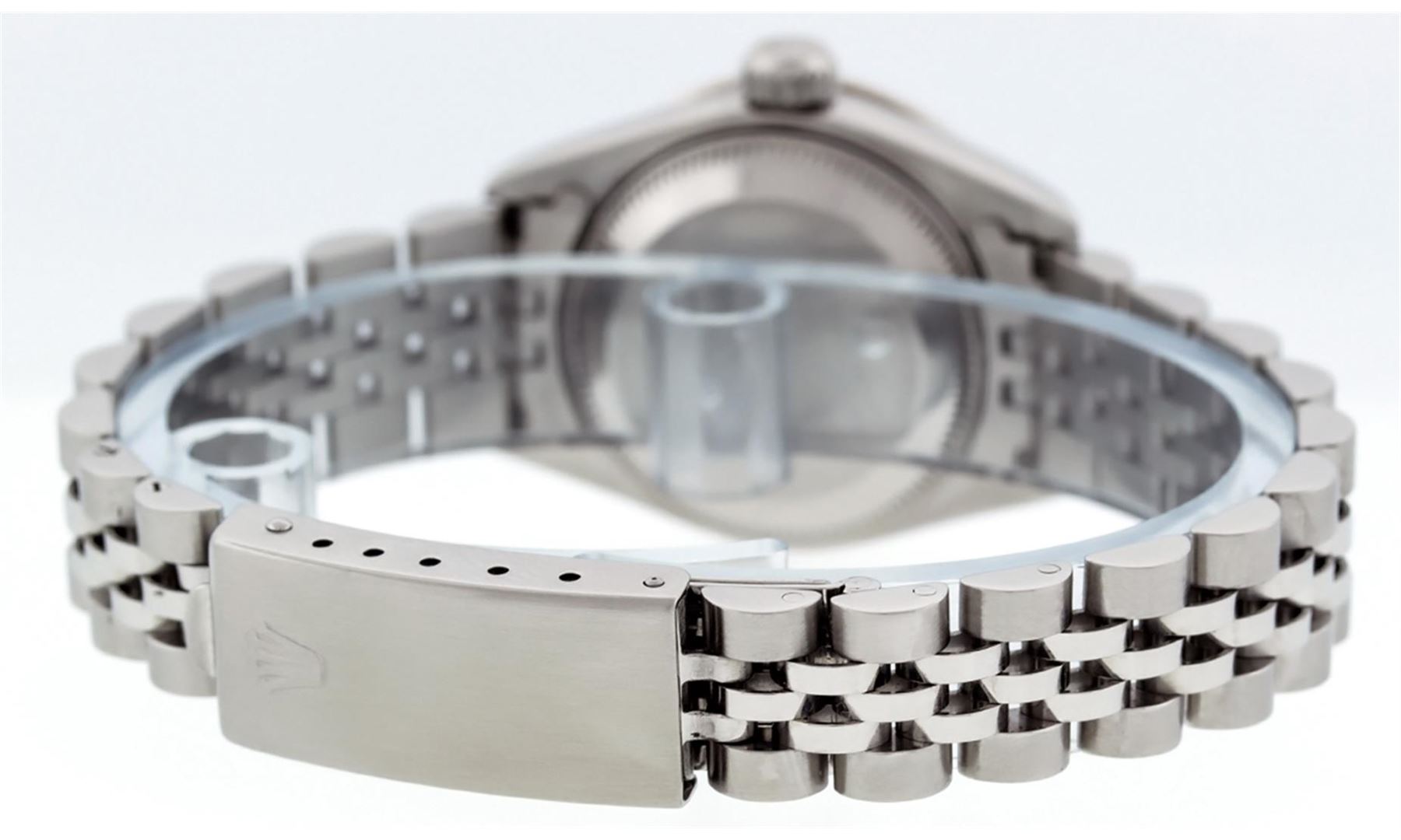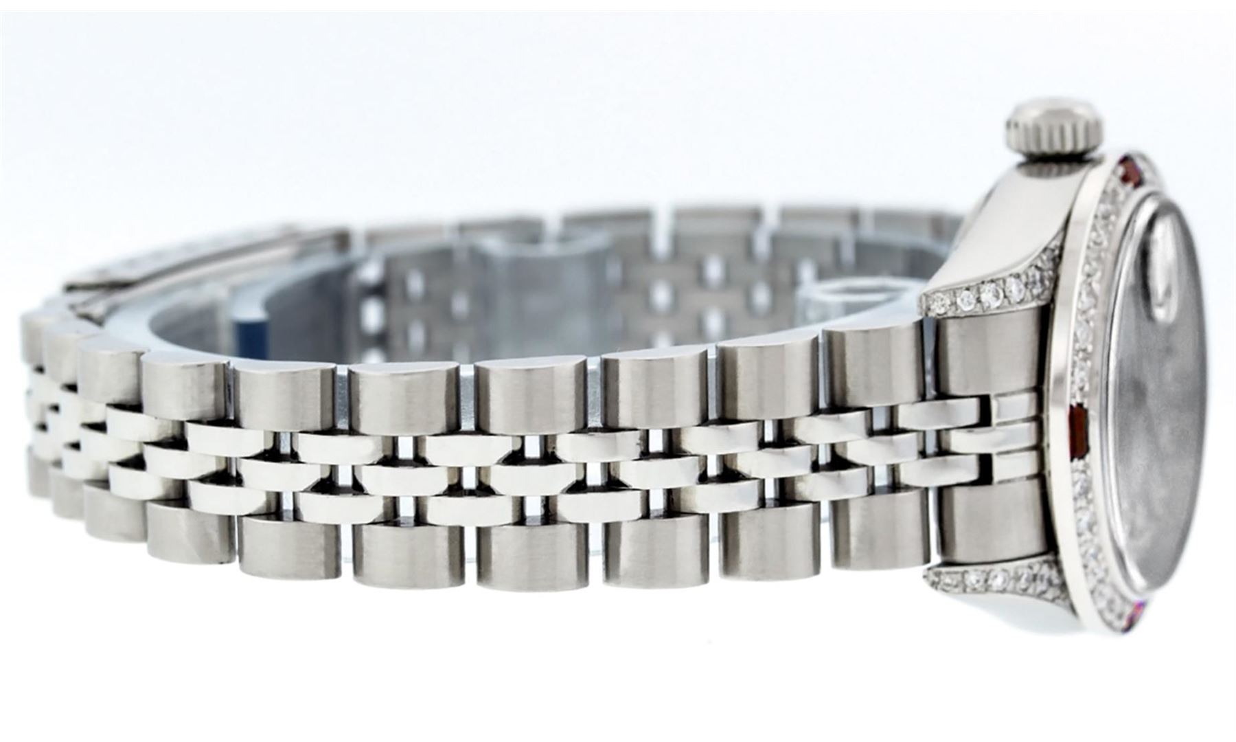 One Quickset Ladies Stainless Steel Rolex Datejust Polished Bright with Satin Finish, Serviced & Electronically Tested, Stainless Steel Case: 26mm, Stainless Steel Crown, Custom Diamond Lugs: 24 Diamonds On Lugs, Clarity: SI-VS, Color: G to H. Custom Bezel: New 18K White Gold Diamond + Ruby Beadset Diamond Bezel, Stone Count: 28 Diamonds + 4 Rubies, Total Weight .70 Carat, Clarity: SI-VS, Color: G to H. Custom Crystal: New Scratch Resistant Synthetic Sapphire Cyclops Lens. Custom Hands: New Luminescent Hands. Movement: Automatic Winding Movement Caliber 2235. Custom Dial: Refinished Single Cut Mother Of Pearl String Diamond Dial, 43 Diamonds in Dial G To H In Color, Clarity: VS. Date Window: 3 O'Clock Position Date Display, Model: Quickset Datejust. Condition: G-6 Extra Fine. Bracelet: Stainless Steel Jubilee Band. Bright Polish & Satin Finish. 6.0 Inch Length, Adjustable. Standard Clasp, With Rolex Logo. This Watch Has Been Serviced Time Tested And Is In Excellent Condition It Is Free Of All Scratches And Dents.