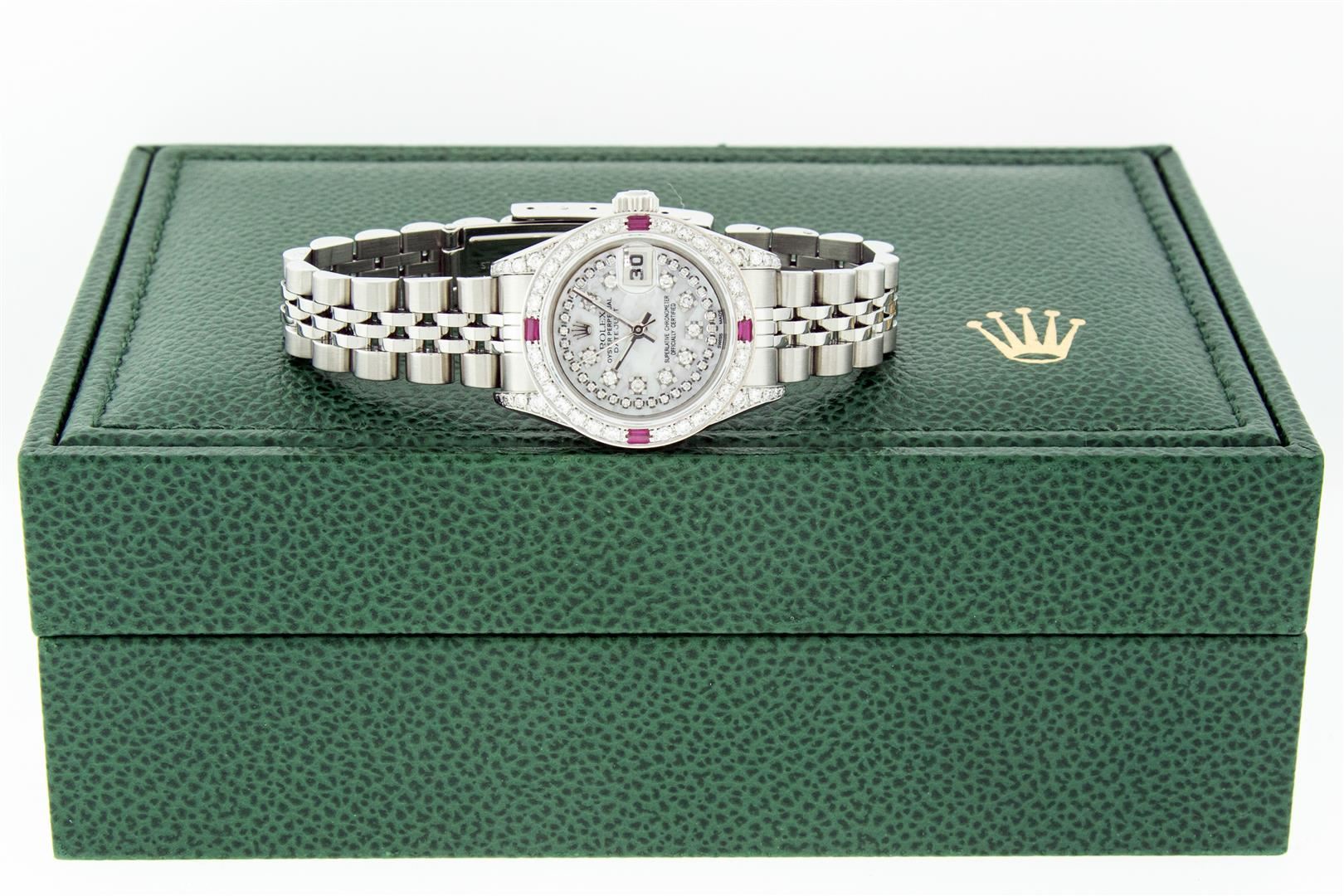 One Quickset Ladies Stainless Steel Rolex Datejust Polished Bright with Satin Finish, Serviced & Electronically Tested, Rolex Stainless Steel Case: 26mm, Rolex Stainless Steel Crown, Custom Diamond Lugs: 24 Diamonds On Lugs, Clarity: SI-VS, Color: G to H. Custom Bezel: New 18K White Gold Diamond + Ruby Beadset Diamond Bezel, Stone Count: 28 Diamonds + 4 Rubies, Total Weight .70 Carat, Clarity: SI-VS, Color: G to H. Custom Crystal: New Sapphire With Magnified Date Window. Custom Hands: New Luminescent Hands. Rolex Movement: Automatic Winding Movement. Custom Dial: Mother Of Pearl String Diamond Dial, 43 Diamonds in Dial G To H In Color, Clarity: VS. Date Window: 3 O'clock Position Date Display, Model: Quickset Datejust. Condition: G-6 Extra Fine. Rolex Bracelet: Stainless Steel Jubilee Band. Bright Polish & Satin Finish. 6.0 Inch Length, Adjustable. Standard Clasp, With Rolex Logo. This Pre Owned Watch Has Been Serviced Time Tested And Is In Excellent Condition It Is Free Of All Scratches And Dents. This Watch Comes With A Rolex Box.