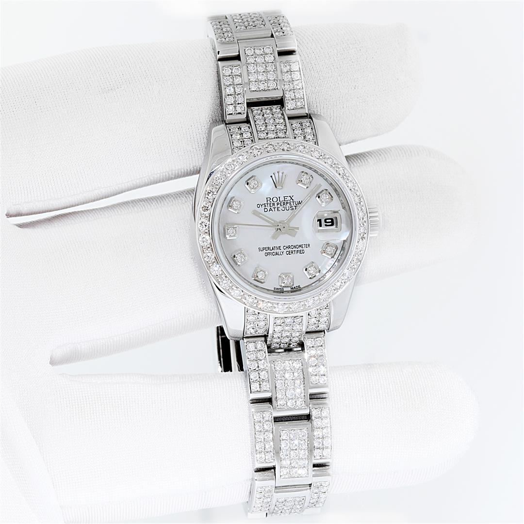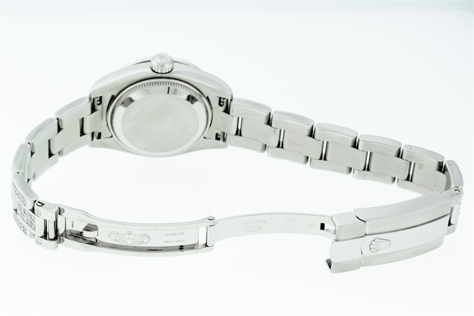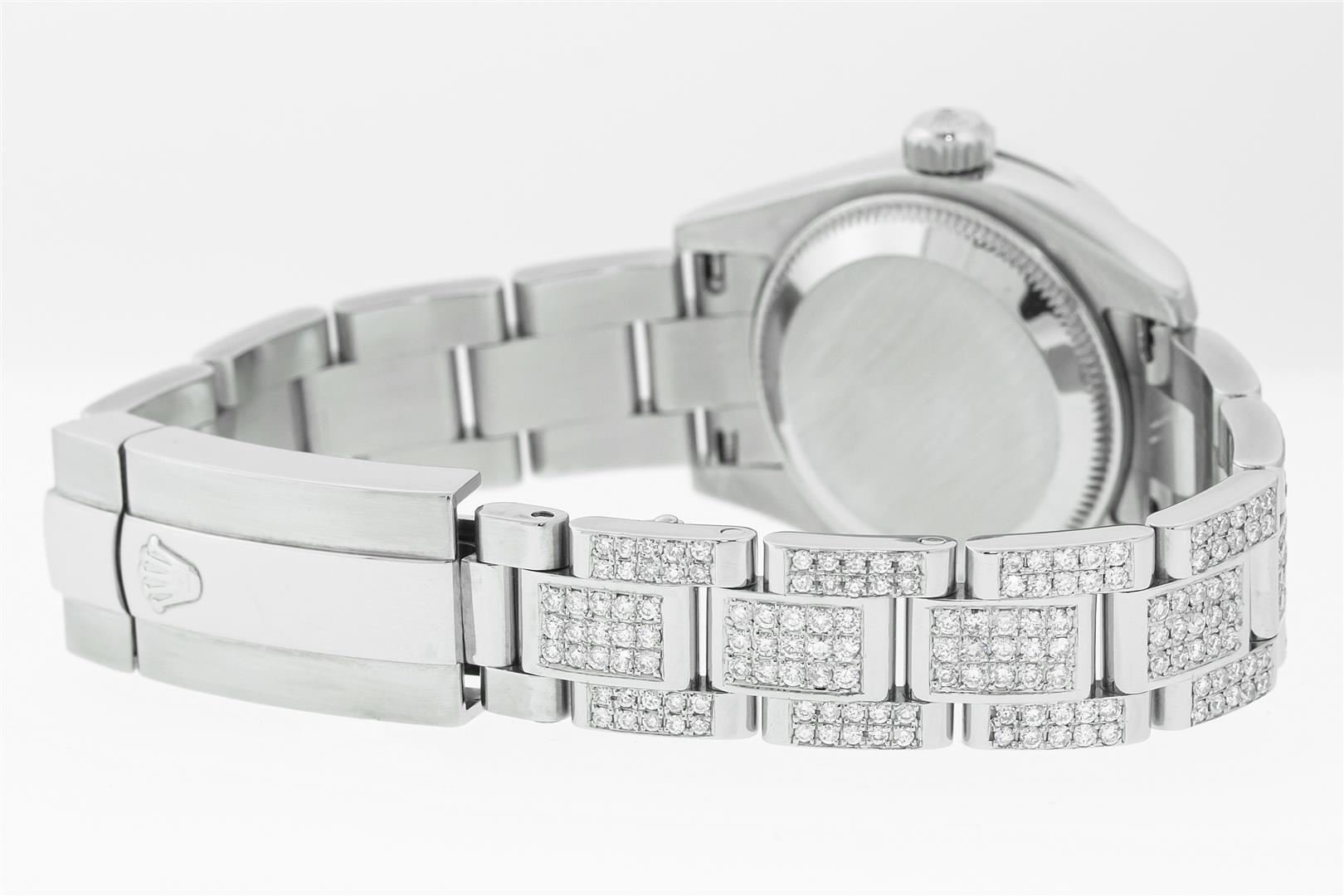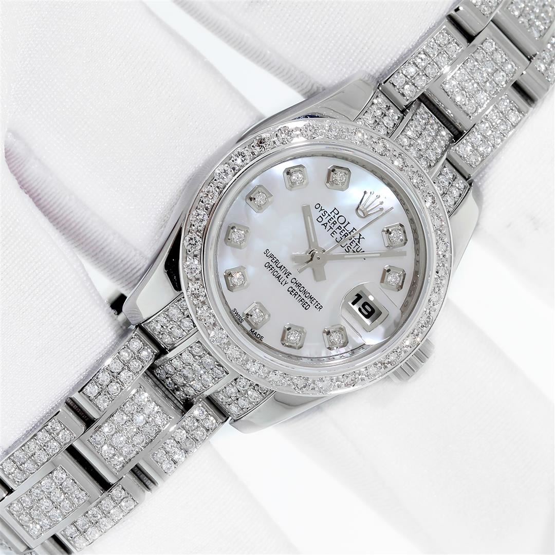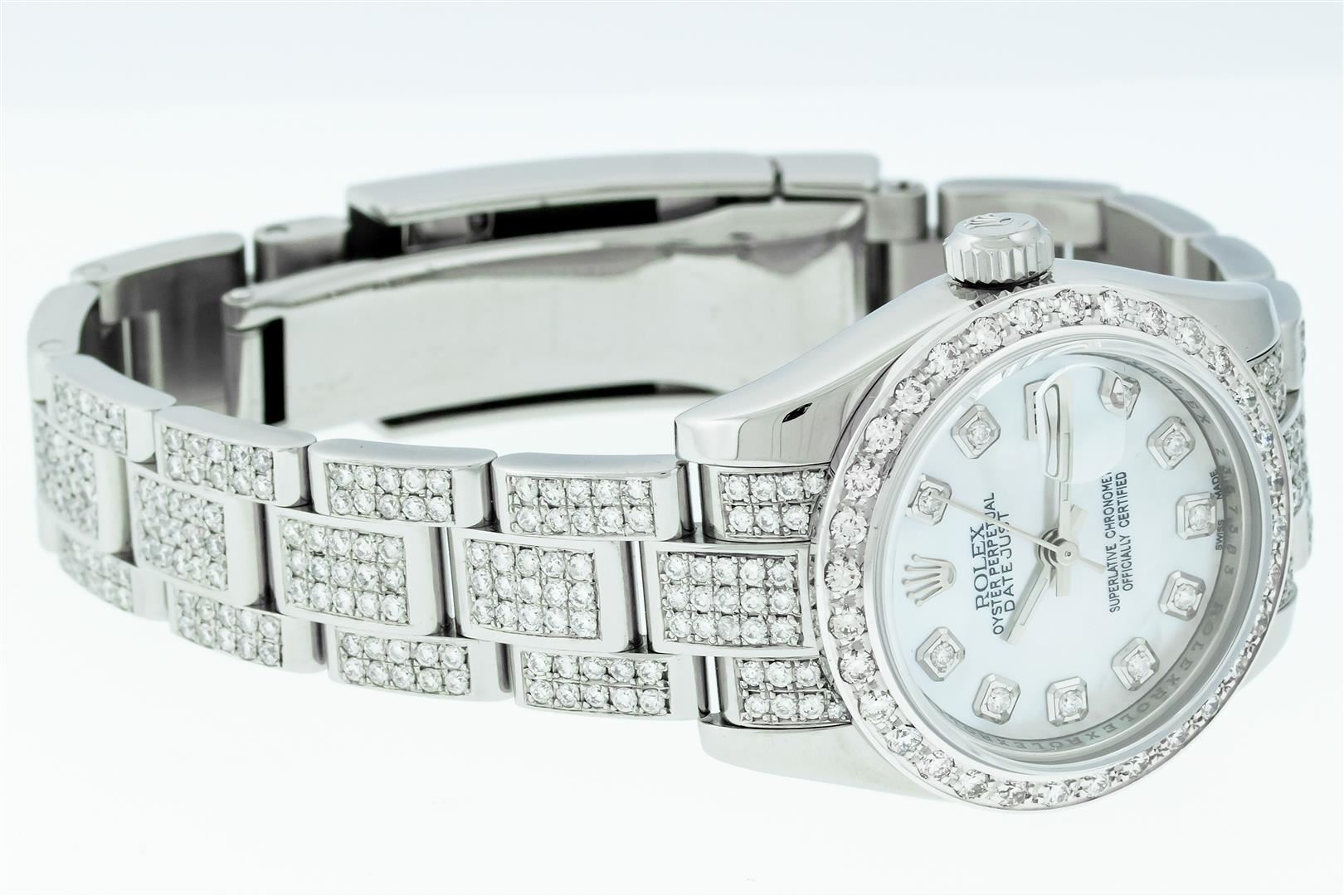 One Quickset Ladies Stainless Steel Rolex Datejust Polished Bright with Satin Finish, Serviced & Electronically Tested, Rolex Stainless Steel Case: 26mm, Rolex Stainless Steel Crown, Custom Bezel: New 18K White Gold Diamond Bezel, Stone Count: 32 Diamonds On Bezel, Total Weight .70 Carat, Clarity: SI-VS, Color: G to H. Custom Crystal: New Sapphire With Magnified Date Window. Custom Hands: New Luminescent Hands. Rolex Movement: Automatic Winding Movement. Custom Dial: Mother Of Pearl Diamond Dial, Stone Count: 10 Diamonds On Dial, G To H In Color, Clarity: VS2. Date Window: 3 O'clock Position Date Display, Model: Sapphire Quickset Datejust. Condition: G-6 Extra Fine. Rolex Bracelet: Stainless Steel Oyster Band set with Custom Added Diamonds. Bright Polish & Satin Finish. 6.0 Inch Length, Adjustable. Standard Clasp, With Rolex Logo. This Pre Owned Watch Has Been Serviced Time Tested And Is In Excellent Condition It Is Free Of All Scratches And Dents. This Watch Comes With A Rolex Box.