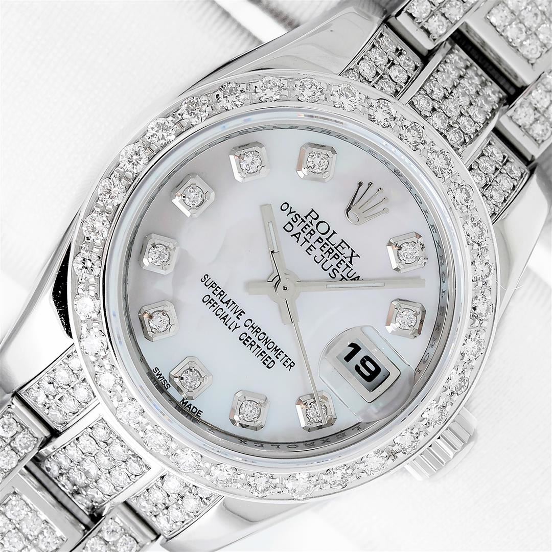 One Quickset Ladies Stainless Steel Rolex Datejust Polished Bright with Satin Finish, Serviced & Electronically Tested, Rolex Stainless Steel Case: 26mm, Rolex Stainless Steel Crown, Custom Bezel: New 18K White Gold Diamond Bezel, Stone Count: 32 Diamonds On Bezel, Total Weight .70 Carat, Clarity: SI-VS, Color: G to H. Custom Crystal: New Sapphire With Magnified Date Window. Custom Hands: New Luminescent Hands. Rolex Movement: Automatic Winding Movement. Custom Dial: Mother Of Pearl Diamond Dial, Stone Count: 10 Diamonds On Dial, G To H In Color, Clarity: VS2. Date Window: 3 O'clock Position Date Display, Model: Sapphire Quickset Datejust. Condition: G-6 Extra Fine. Rolex Bracelet: Stainless Steel Oyster Band set with Custom Added Diamonds. Bright Polish & Satin Finish. 6.0 Inch Length, Adjustable. Standard Clasp, With Rolex Logo. This Pre Owned Watch Has Been Serviced Time Tested And Is In Excellent Condition It Is Free Of All Scratches And Dents. This Watch Comes With A Rolex Box.