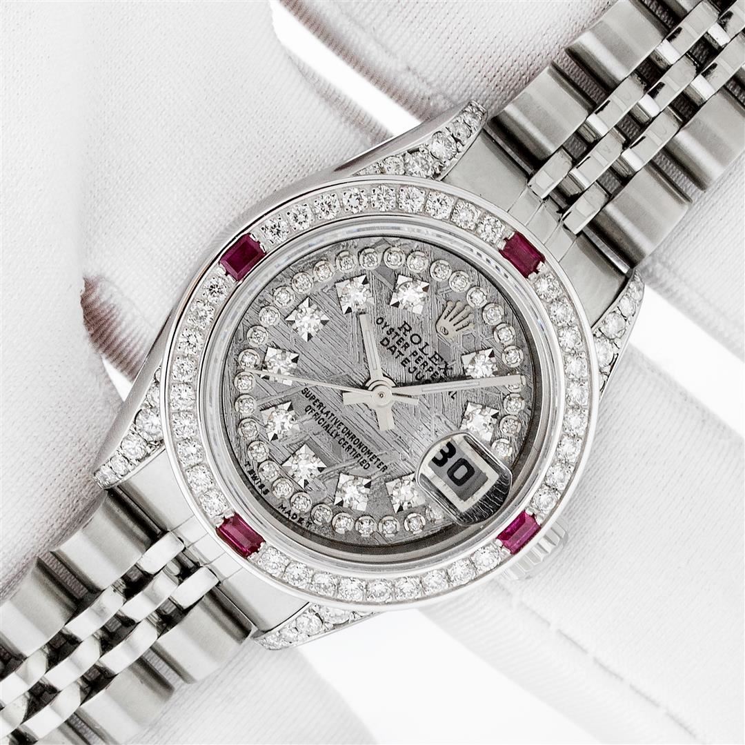 One Quickset Ladies Stainless Steel Rolex Datejust Polished Bright with Satin Finish, Serviced & Electronically Tested, Rolex Stainless Steel Case: 26mm, Rolex Stainless Steel Crown, Custom Diamond Lugs: 24 Diamonds On Lugs, Clarity: SI-VS, Color: G to H. Custom Bezel: New 18K White Gold Beadset Diamond Bezel, Stone Count: 28 Diamonds + 4 Emeralds On Bezel, Total Weight .70 Carat, Clarity: SI-VS, Color: G to H. Custom Crystal: New Sapphire With Magnified Date Window. Custom Hands: New Luminescent Hands. Rolex Movement: Automatic Winding Movement. Custom Dial: Meteorite String Diamond Dial, 43 Diamonds in Dial G To H In Color, Clarity: VS. Date Window: 3 O'clock Position Date Display, Model: Sapphire Quickset Datejust. Condition: G-6 Extra Fine. Rolex Bracelet: Stainless Steel Jubilee Band. Bright Polish & Satin Finish. 6.0 Inch Length, Adjustable. Standard Clasp, With Rolex Logo. This Pre Owned Watch Has Been Serviced Time Tested And Is In Excellent Condition It Is Free Of All Scratches And Dents. This Watch Comes With A Rolex Box.