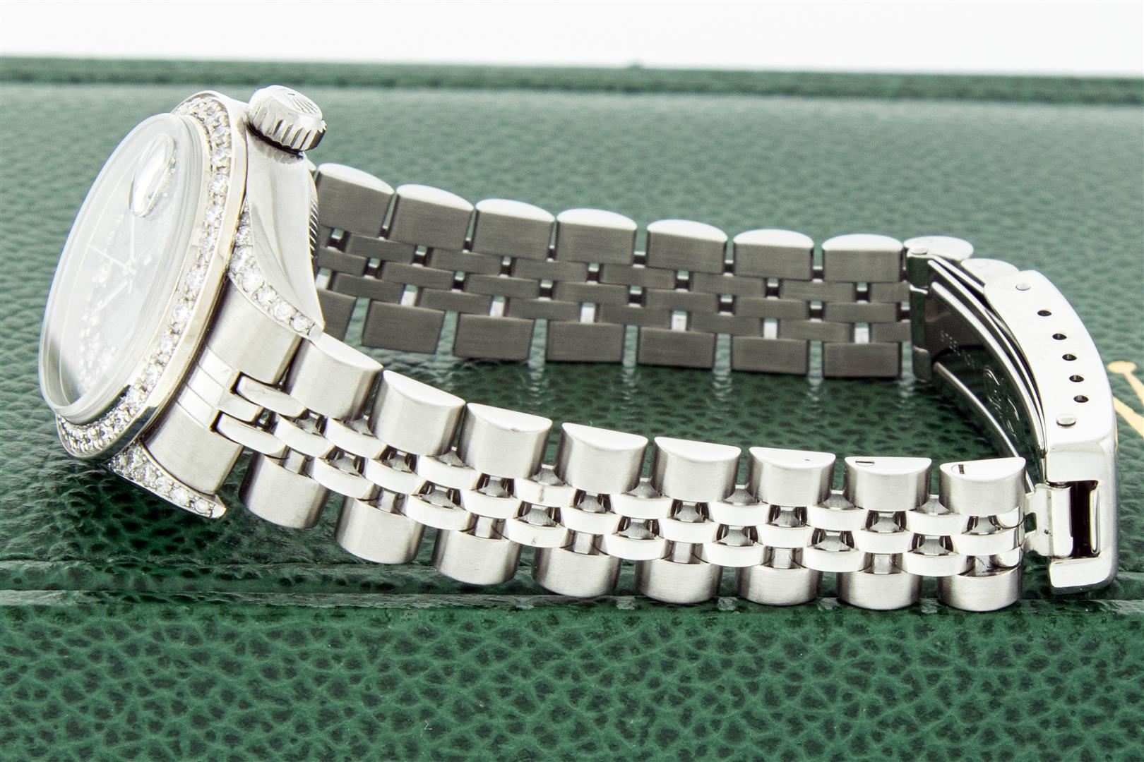 One Quickset Ladies Stainless Steel Rolex Datejust Polished Bright with Satin Finish, Serviced & Electronically Tested, Rolex Stainless Steel Case: 26mm, Rolex Stainless Steel Crown, Custom Diamond Lugs: 24 Diamonds On Lugs, Clarity: SI-VS, Color: G to H. Custom Bezel: New Stainless Steel Beadset Diamond Bezel, Stone Count: 39 Diamonds On Bezel, Total Weight .70 Carat, Clarity: SI-VS, Color: G to H. Custom Crystal: New Sapphire With Magnified Date Window. Custom Hands: New Luminescent Hands. Rolex Movement: Automatic Winding Movement. Custom Dial: Meteorite String Diamond Dial, 43 Diamonds in Dial G To H In Color, Clarity: VS. Date Window: 3 O'clock Position Date Display, Model: Sapphire Quickset Datejust. Condition: G-6 Extra Fine. Rolex Bracelet: Stainless Steel Jubilee Band. Bright Polish & Satin Finish. 6.0 Inch Length, Adjustable. Standard Clasp, With Rolex Logo. This Pre Owned Watch Has Been Serviced Time Tested And Is In Excellent Condition It Is Free Of All Scratches And Dents. This Watch Comes With A Rolex Box.