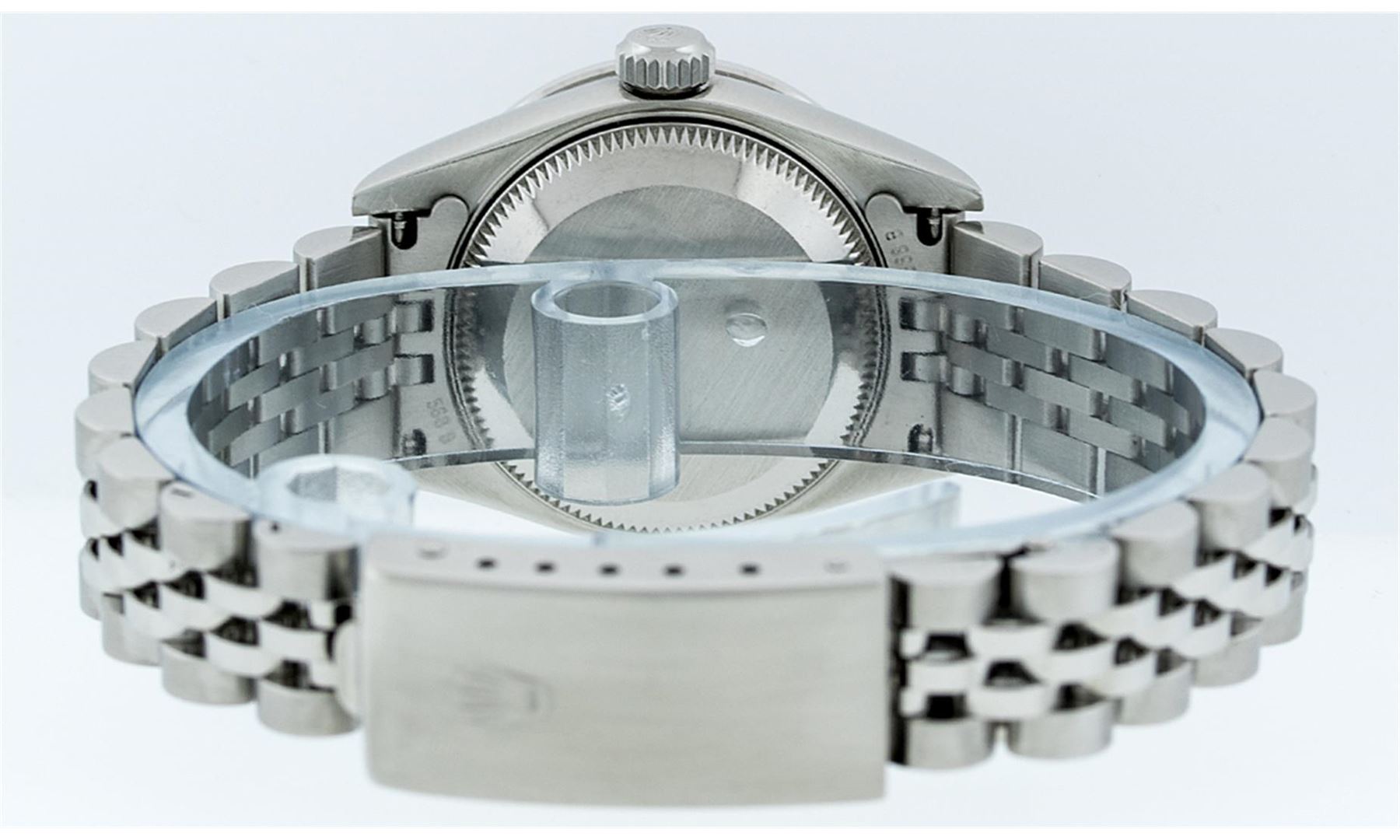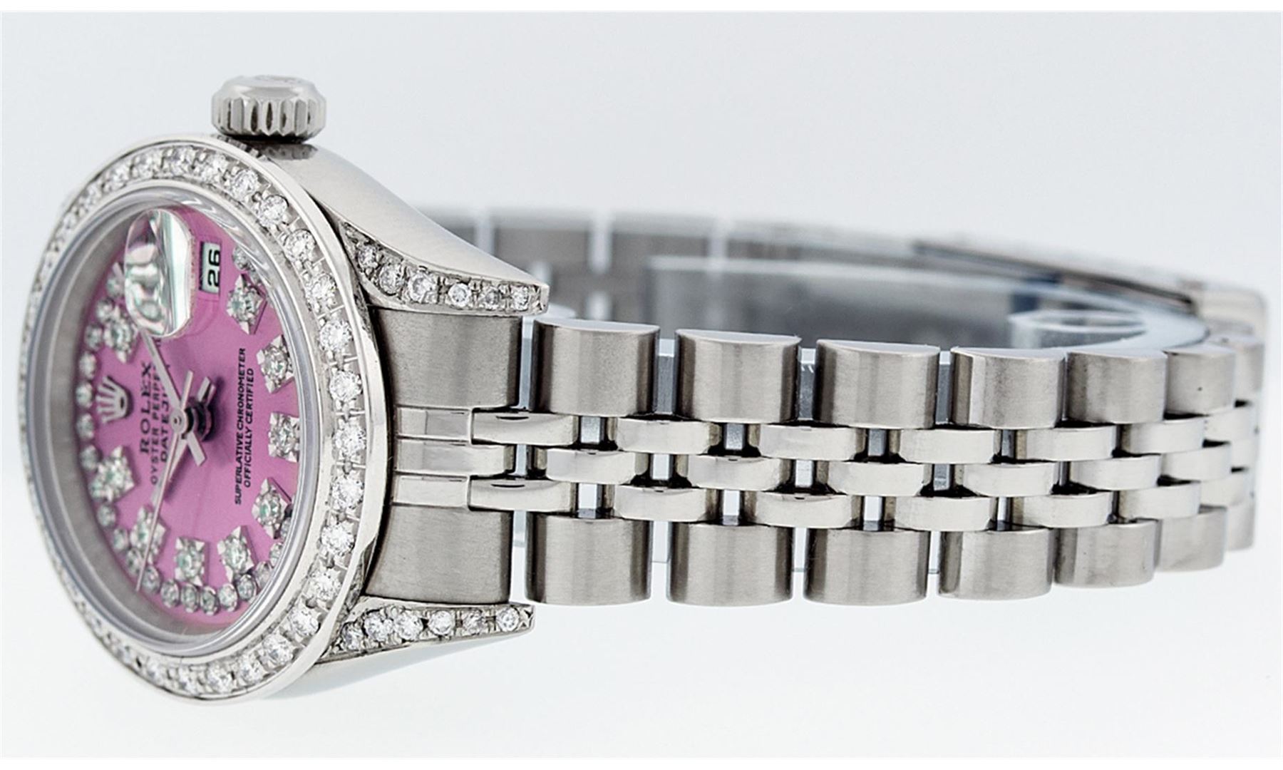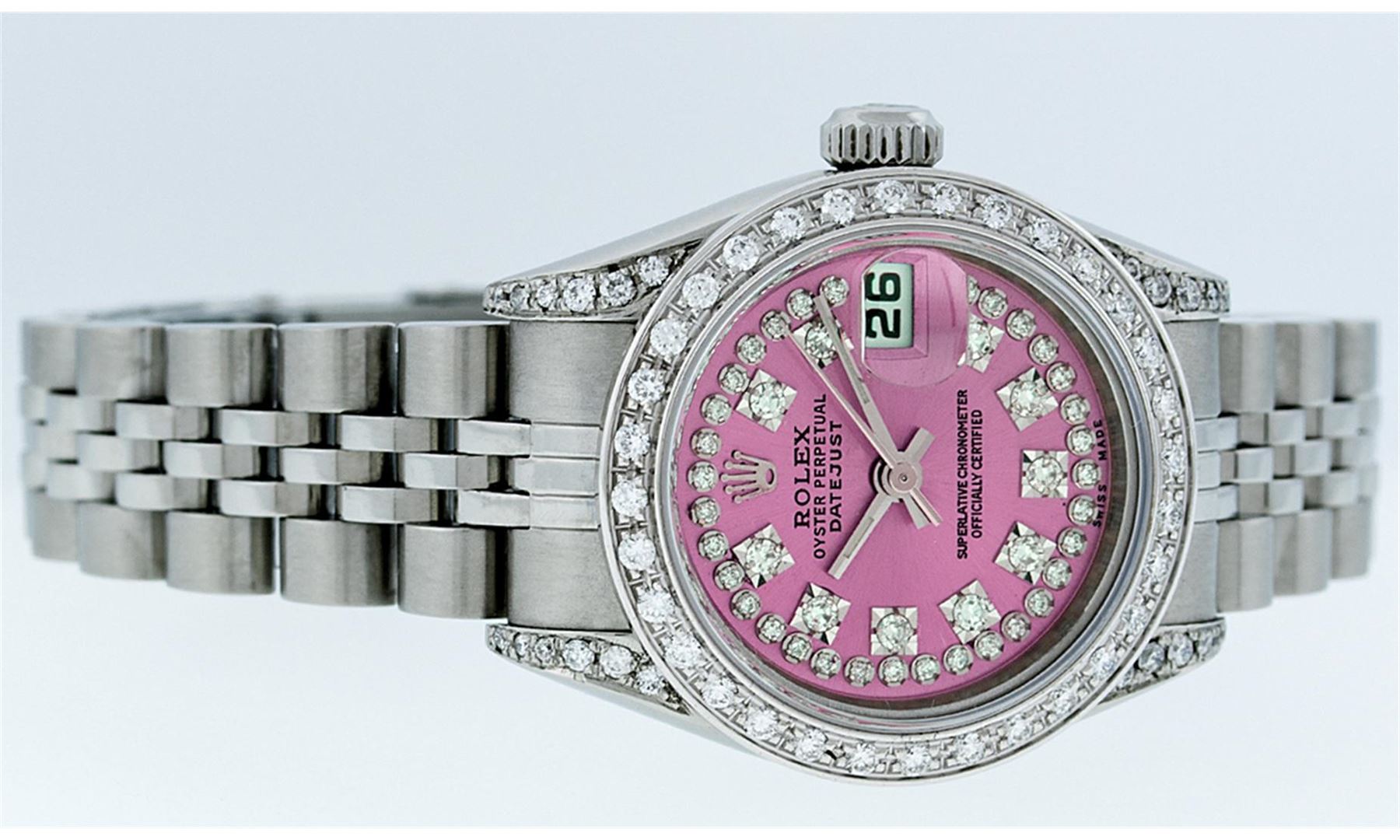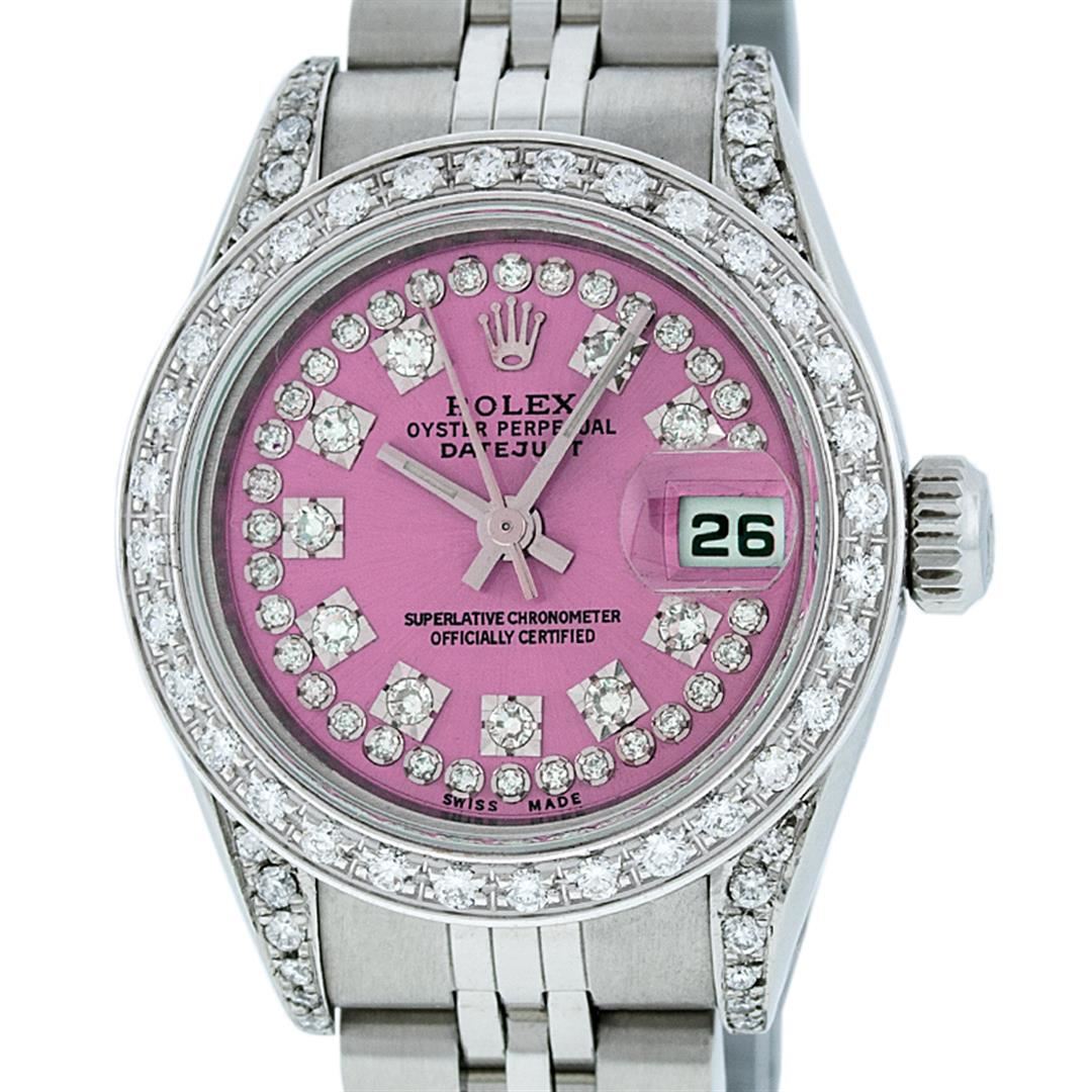One Quickset Ladies Stainless Steel Rolex Datejust Polished Bright with Satin Finish, Serviced & Electronically Tested, Stainless Steel Case: 26mm, Stainless Steel Crown, Custom Diamond Lugs: 24 Diamonds On Lugs, Clarity: SI-VS, Color: G to H. Custom Bezel: New 18K White Gold Beadset Diamond Bezel, Stone Count: 32 Diamonds, Total Weight .70 Carat, Clarity: SI-VS, Color: G to H. Custom Crystal: New Scratch Resistant Synthetic Sapphire Cyclops Lens. Custom Hands: New Luminescent Hands. Movement: Automatic Winding Movement Caliber 2235. Custom Dial: Refinished Single Cut Pink String Diamond Dial, 43 Diamonds in Dial G To H In Color, Clarity: VS. Date Window: 3 O'Clock Position Date Display, Model: 79174 Quickjset Datejust. Condition: G-6 Extra Fine. Bracelet: Stainless Steel Jubilee Band. Bright Polish & Satin Finish. 6.0 Inch Length, Adjustable. Standard Clasp, With Rolex Logo. This Watch Has Been Serviced Time Tested And Is In Excellent Condition It Is Free Of All Scratches And Dents.