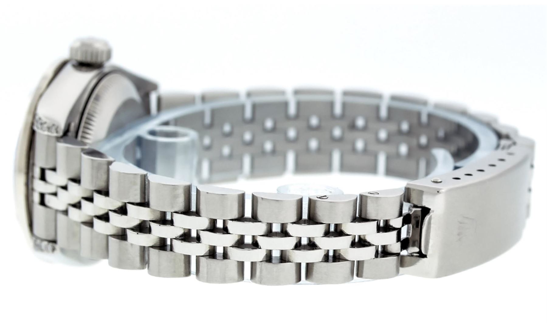 One Quickset Ladies Stainless Steel Rolex Datejust Polished Bright with Satin Finish, Serviced & Electronically Tested, Stainless Steel Case: 26mm, Stainless Steel Crown, Custom Diamond Lugs: 24 Diamonds On Lugs, Clarity: SI-VS, Color: G to H. Custom Bezel: New 18K White Gold Diamond + Ruby Beadset Diamond Bezel, Stone Count: 28 Diamonds + 4 Rubies, Total Weight .70 Carat, Clarity: SI-VS, Color: G to H. Custom Crystal: New Scratch Resistant Synthetic Sapphire Cyclops Lens. Custom Hands: New Luminescent Hands. Movement: Automatic Winding Movement Caliber 2235. Custom Dial: Refinished Single Cut Purple Mother Of Pearl String Diamond Dial, 43 Diamonds in Dial G To H In Color, Clarity: VS. Date Window: 3 O'Clock Position Date Display, Model: Quickset Datejust. Condition: G-6 Extra Fine. Bracelet: Stainless Steel Jubilee Band. Bright Polish & Satin Finish. 6.0 Inch Length, Adjustable. Standard Clasp, With Rolex Logo. This Watch Has Been Serviced Time Tested And Is In Excellent Condition It Is Free Of All Scratches And Dents.
