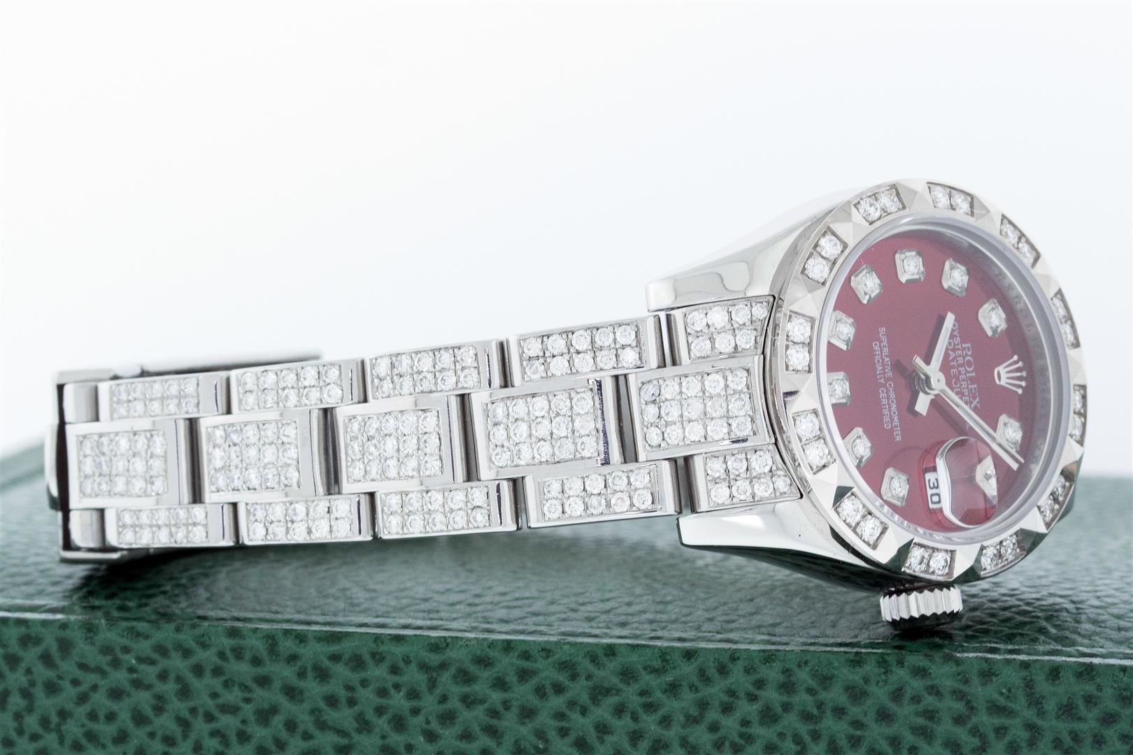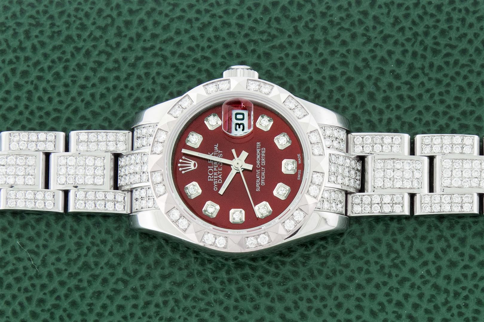 One Quickset Ladies Stainless Steel Rolex Datejust Polished Bright with Satin Finish, Serviced & Electronically Tested, Rolex Stainless Steel Case: 26mm, Rolex Stainless Steel Crown, Custom Bezel: New 18K White Gold Pyramid Diamond Bezel, Stone Count: 24 Diamonds On Bezel, Total Weight .50 Carat, Clarity: SI-VS, Color: G to H. Custom Crystal: New Sapphire With Magnified Date Window. Custom Hands: New Luminescent Hands. Rolex Movement: Automatic Winding Movement. Custom Dial: Refinished To Red With Custom Added Diamonds, Stone Count: 10 Diamonds On Dial, G To H In Color, Clarity: VS. Date Window: 3 O'clock Position Date Display, Model: Sapphire Quickset Datejust. Condition: G-6 Extra Fine. Rolex Bracelet: Stainless Steel Oyster Band set with Custom Added Diamonds. Bright Polish & Satin Finish. 6.0 Inch Length, Adjustable. Standard Clasp, With Rolex Logo. This Pre Owned Watch Has Been Serviced Time Tested And Is In Excellent Condition It Is Free Of All Scratches And Dents. This Watch Comes With A Rolex Box.