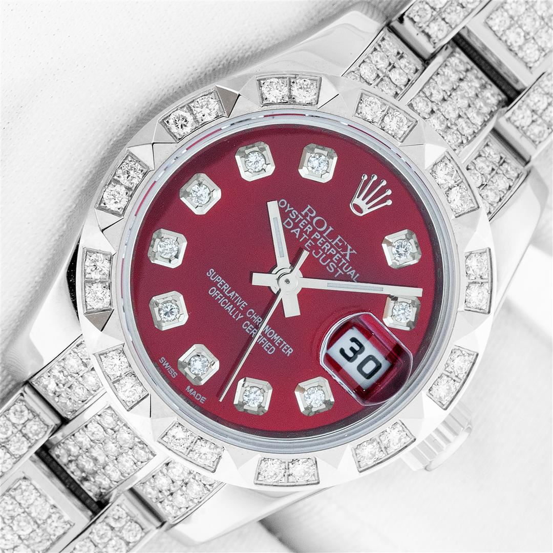 One Quickset Ladies Stainless Steel Rolex Datejust Polished Bright with Satin Finish, Serviced & Electronically Tested, Rolex Stainless Steel Case: 26mm, Rolex Stainless Steel Crown, Custom Bezel: New 18K White Gold Pyramid Diamond Bezel, Stone Count: 24 Diamonds On Bezel, Total Weight .50 Carat, Clarity: SI-VS, Color: G to H. Custom Crystal: New Sapphire With Magnified Date Window. Custom Hands: New Luminescent Hands. Rolex Movement: Automatic Winding Movement. Custom Dial: Refinished To Red With Custom Added Diamonds, Stone Count: 10 Diamonds On Dial, G To H In Color, Clarity: VS. Date Window: 3 O'clock Position Date Display, Model: Sapphire Quickset Datejust. Condition: G-6 Extra Fine. Rolex Bracelet: Stainless Steel Oyster Band set with Custom Added Diamonds. Bright Polish & Satin Finish. 6.0 Inch Length, Adjustable. Standard Clasp, With Rolex Logo. This Pre Owned Watch Has Been Serviced Time Tested And Is In Excellent Condition It Is Free Of All Scratches And Dents. This Watch Comes With A Rolex Box.