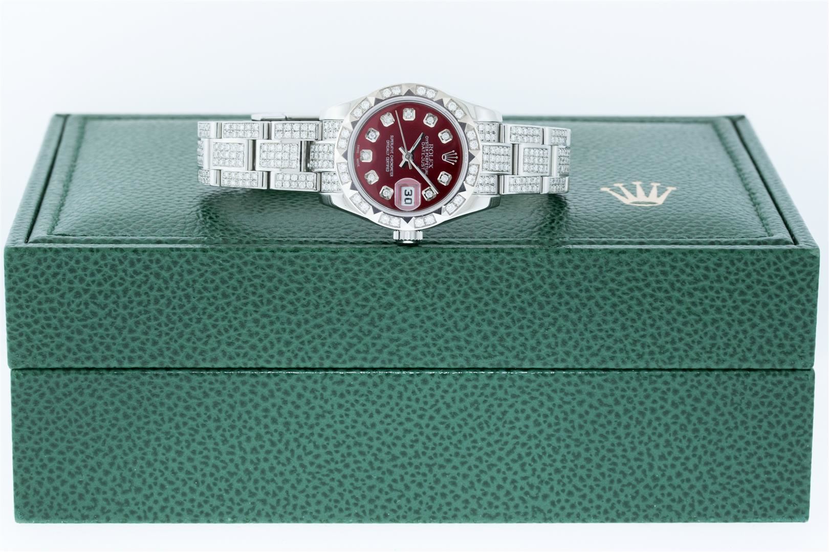 One Quickset Ladies Stainless Steel Rolex Datejust Polished Bright with Satin Finish, Serviced & Electronically Tested, Rolex Stainless Steel Case: 26mm, Rolex Stainless Steel Crown, Custom Bezel: New 18K White Gold Pyramid Diamond Bezel, Stone Count: 24 Diamonds On Bezel, Total Weight .50 Carat, Clarity: SI-VS, Color: G to H. Custom Crystal: New Sapphire With Magnified Date Window. Custom Hands: New Luminescent Hands. Rolex Movement: Automatic Winding Movement. Custom Dial: Refinished To Red With Custom Added Diamonds, Stone Count: 10 Diamonds On Dial, G To H In Color, Clarity: VS. Date Window: 3 O'clock Position Date Display, Model: Sapphire Quickset Datejust. Condition: G-6 Extra Fine. Rolex Bracelet: Stainless Steel Oyster Band set with Custom Added Diamonds. Bright Polish & Satin Finish. 6.0 Inch Length, Adjustable. Standard Clasp, With Rolex Logo. This Pre Owned Watch Has Been Serviced Time Tested And Is In Excellent Condition It Is Free Of All Scratches And Dents. This Watch Comes With A Rolex Box.