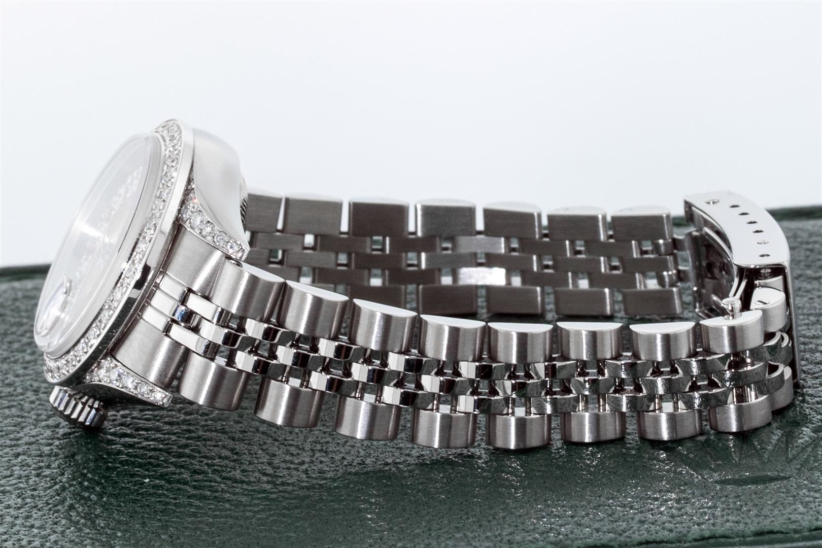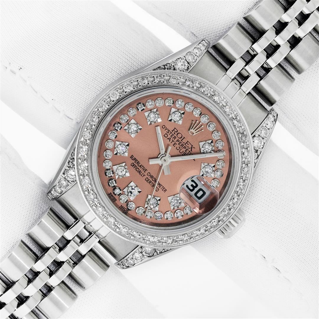 One Quickset Ladies Stainless Steel Rolex Datejust Polished Bright with Satin Finish, Serviced & Electronically Tested, Rolex Stainless Steel Case: 26mm, Rolex Stainless Steel Crown, Custom Diamond Lugs: 24 Diamonds On Lugs, Clarity: SI-VS, Color: G to H. Custom Bezel: New 18K White Gold Beadset Diamond Bezel, Stone Count: 32 Diamonds On Bezel, Total Weight .70 Carat, Clarity: SI-VS, Color: G to H. Custom Crystal: New Sapphire With Magnified Date Window. Custom Hands: New Luminescent Hands. Rolex Movement: Automatic Quickset Winding Movement Caliber 2230. Custom Dial: Refinished To Salmon With Custom Added Diamond Hour Markers, 43 Diamonds in Dial G To H In Color, Clarity: VS. Date Window: 3 O'clock Position Date Display, Model: Caliber 2230 Quickset Datejust. Condition: G-6 Extra Fine. Rolex Bracelet: Stainless Steel Jubilee Band. Bright Polish & Satin Finish. 6.0 Inch Length, Adjustable. Standard Clasp, With Rolex Logo. This Pre Owned Watch Has Been Serviced Time Tested And Is In Excellent Condition It Is Free Of All Scratches And Dents. This Watch Comes With A Rolex Box.
