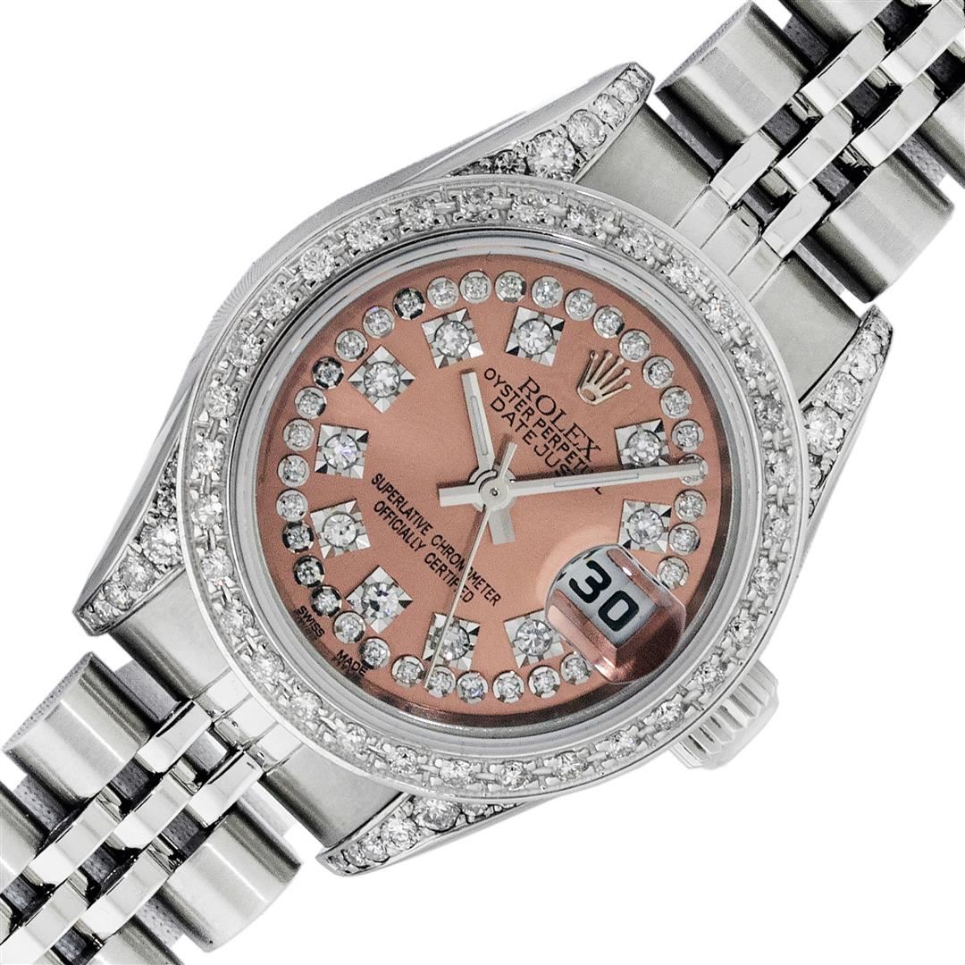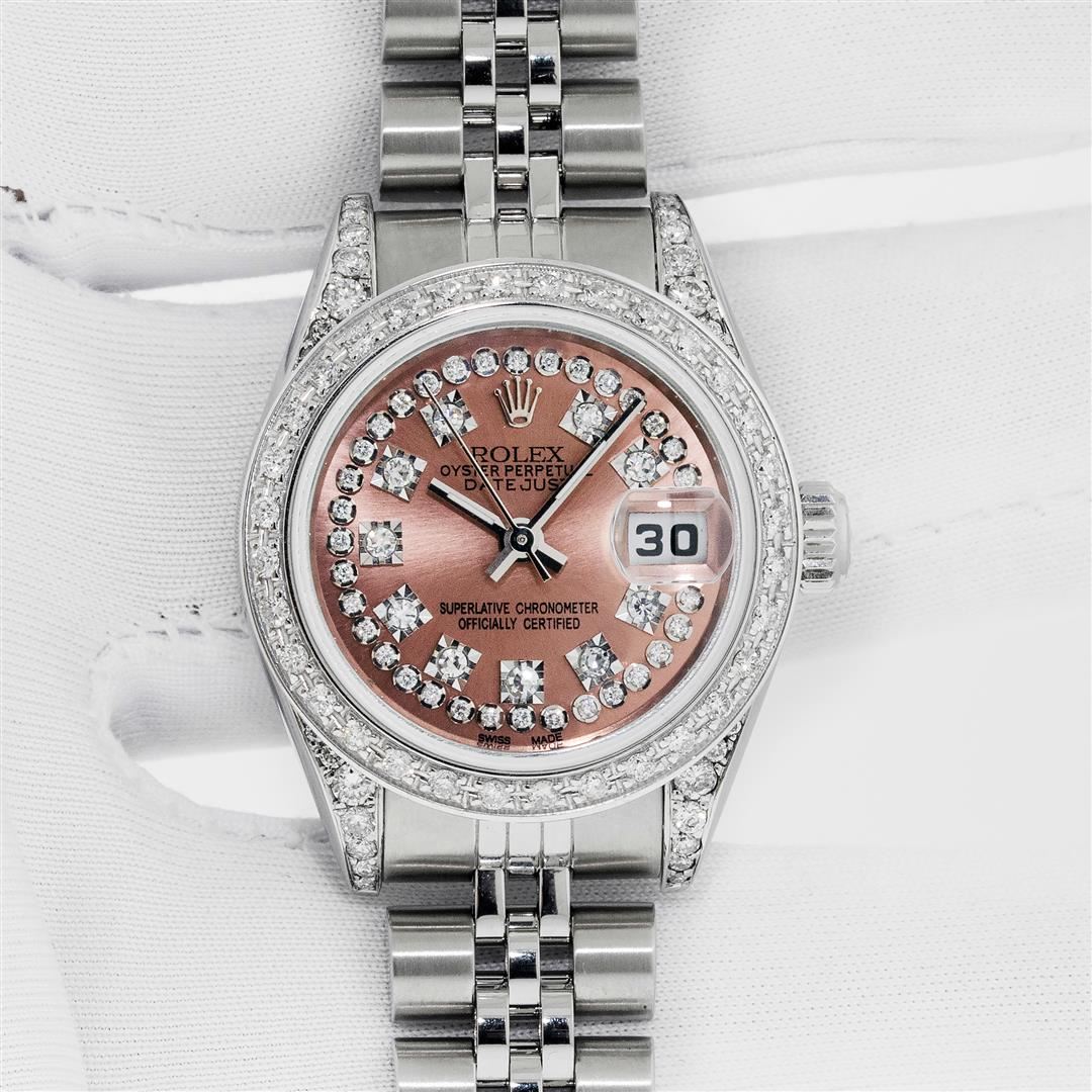 One Quickset Ladies Stainless Steel Rolex Datejust Polished Bright with Satin Finish, Serviced & Electronically Tested, Rolex Stainless Steel Case: 26mm, Rolex Stainless Steel Crown, Custom Diamond Lugs: 24 Diamonds On Lugs, Clarity: SI-VS, Color: G to H. Custom Bezel: New 18K White Gold Beadset Diamond Bezel, Stone Count: 32 Diamonds On Bezel, Total Weight .70 Carat, Clarity: SI-VS, Color: G to H. Custom Crystal: New Sapphire With Magnified Date Window. Custom Hands: New Luminescent Hands. Rolex Movement: Automatic Quickset Winding Movement Caliber 2230. Custom Dial: Refinished To Salmon With Custom Added Diamond Hour Markers, 43 Diamonds in Dial G To H In Color, Clarity: VS. Date Window: 3 O'clock Position Date Display, Model: Caliber 2230 Quickset Datejust. Condition: G-6 Extra Fine. Rolex Bracelet: Stainless Steel Jubilee Band. Bright Polish & Satin Finish. 6.0 Inch Length, Adjustable. Standard Clasp, With Rolex Logo. This Pre Owned Watch Has Been Serviced Time Tested And Is In Excellent Condition It Is Free Of All Scratches And Dents. This Watch Comes With A Rolex Box.
