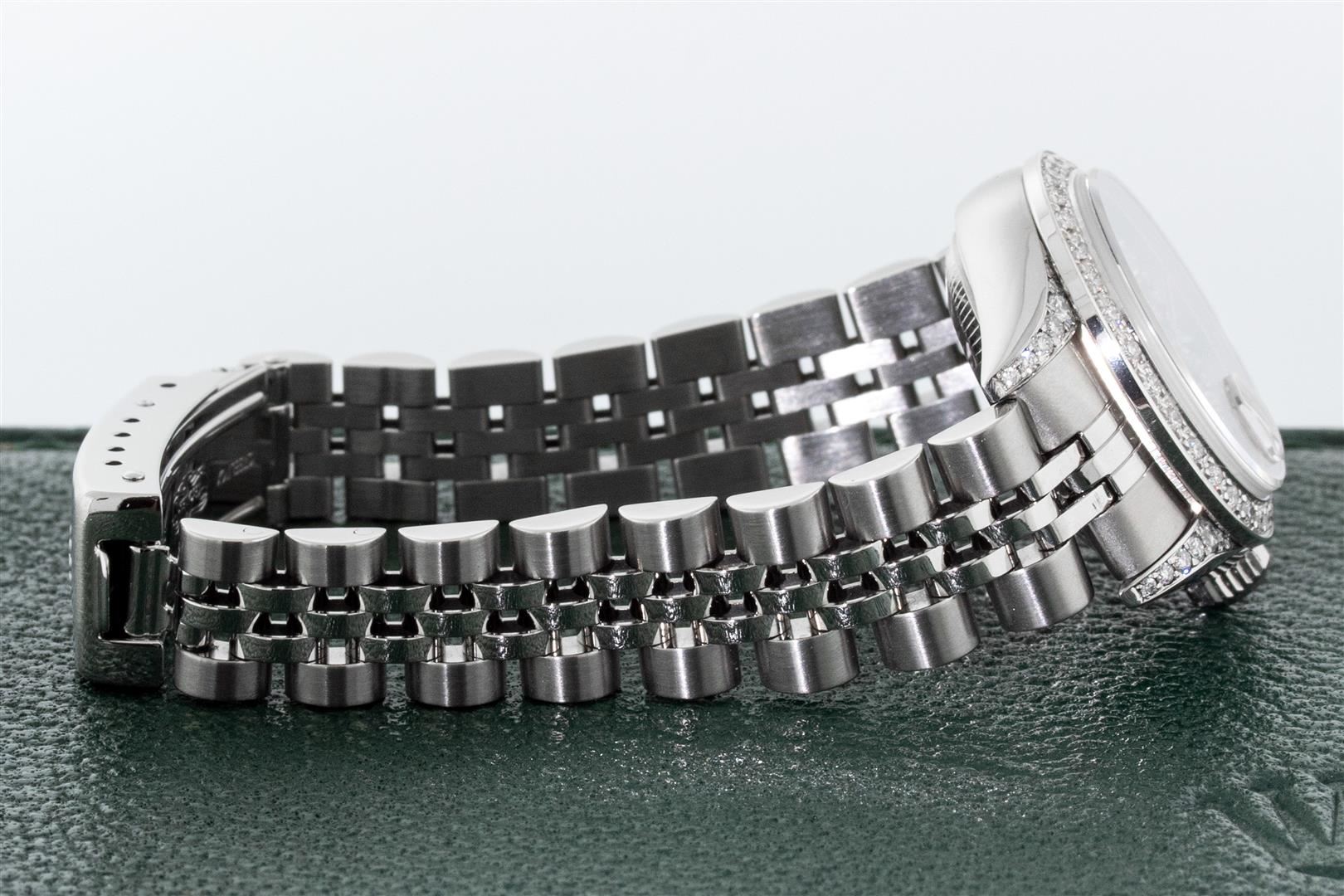 One Quickset Ladies Stainless Steel Rolex Datejust Polished Bright with Satin Finish, Serviced & Electronically Tested, Rolex Stainless Steel Case: 26mm, Rolex Stainless Steel Crown, Custom Diamond Lugs: 24 Diamonds On Lugs, Clarity: SI-VS, Color: G to H. Custom Bezel: New 18K White Gold Beadset Diamond Bezel, Stone Count: 32 Diamonds On Bezel, Total Weight .70 Carat, Clarity: SI-VS, Color: G to H. Custom Crystal: New Sapphire With Magnified Date Window. Custom Hands: New Luminescent Hands. Rolex Movement: Automatic Quickset Winding Movement Caliber 2230. Custom Dial: Refinished To Salmon With Custom Added Diamond Hour Markers, 43 Diamonds in Dial G To H In Color, Clarity: VS. Date Window: 3 O'clock Position Date Display, Model: Caliber 2230 Quickset Datejust. Condition: G-6 Extra Fine. Rolex Bracelet: Stainless Steel Jubilee Band. Bright Polish & Satin Finish. 6.0 Inch Length, Adjustable. Standard Clasp, With Rolex Logo. This Pre Owned Watch Has Been Serviced Time Tested And Is In Excellent Condition It Is Free Of All Scratches And Dents. This Watch Comes With A Rolex Box.