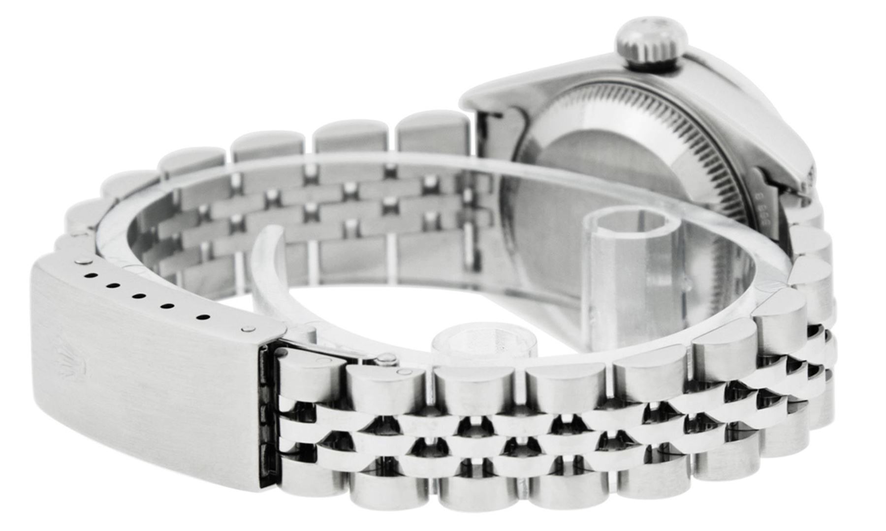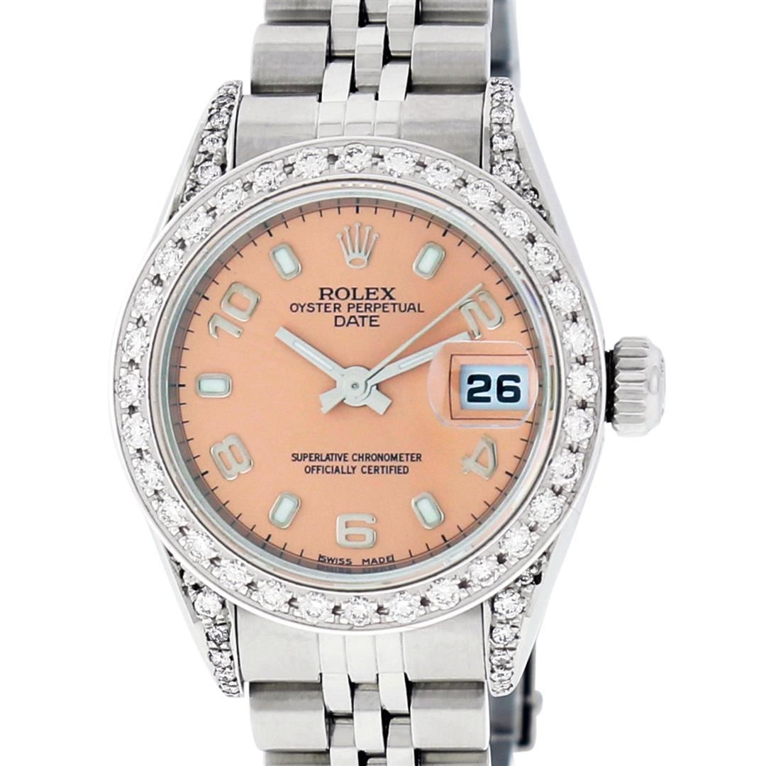 One Quickset Ladies Stainless Steel Rolex Datejust Polished Bright with Satin Finish, Serviced & Electronically Tested, Stainless Steel Case: 26mm, Stainless Steel Crown, Custom Diamond Lugs: 24 Diamonds On Lugs, Clarity: SI-VS, Color: G to H. Custom Bezel: New 18K White Gold Beadset Diamond Bezel, Stone Count: 32 Diamonds On Bezel, Total Weight .70 Carat, Clarity: SI-VS, Color: G to H. Custom Crystal: New Scratch Resistant Synthetic Sapphire Cyclops Lens. Custom Hands: New Luminescent Hands. Movement: Automatic Winding Movement Caliber 2235. Dial: Salmon Arabic With Dash Track, Date Window: 3 O'Clock Position Date Display, Model: 79160 Quickset Datejust. Condition: G-6 Extra Fine. Bracelet: Stainless Steel Jubilee Band. Bright Polish & Satin Finish. 6.0 Inch Length, Adjustable. Standard Clasp, With Rolex Logo. This Watch Has Been Serviced Time Tested And Is In Excellent Condition It Is Free Of All Scratches And Dents.
