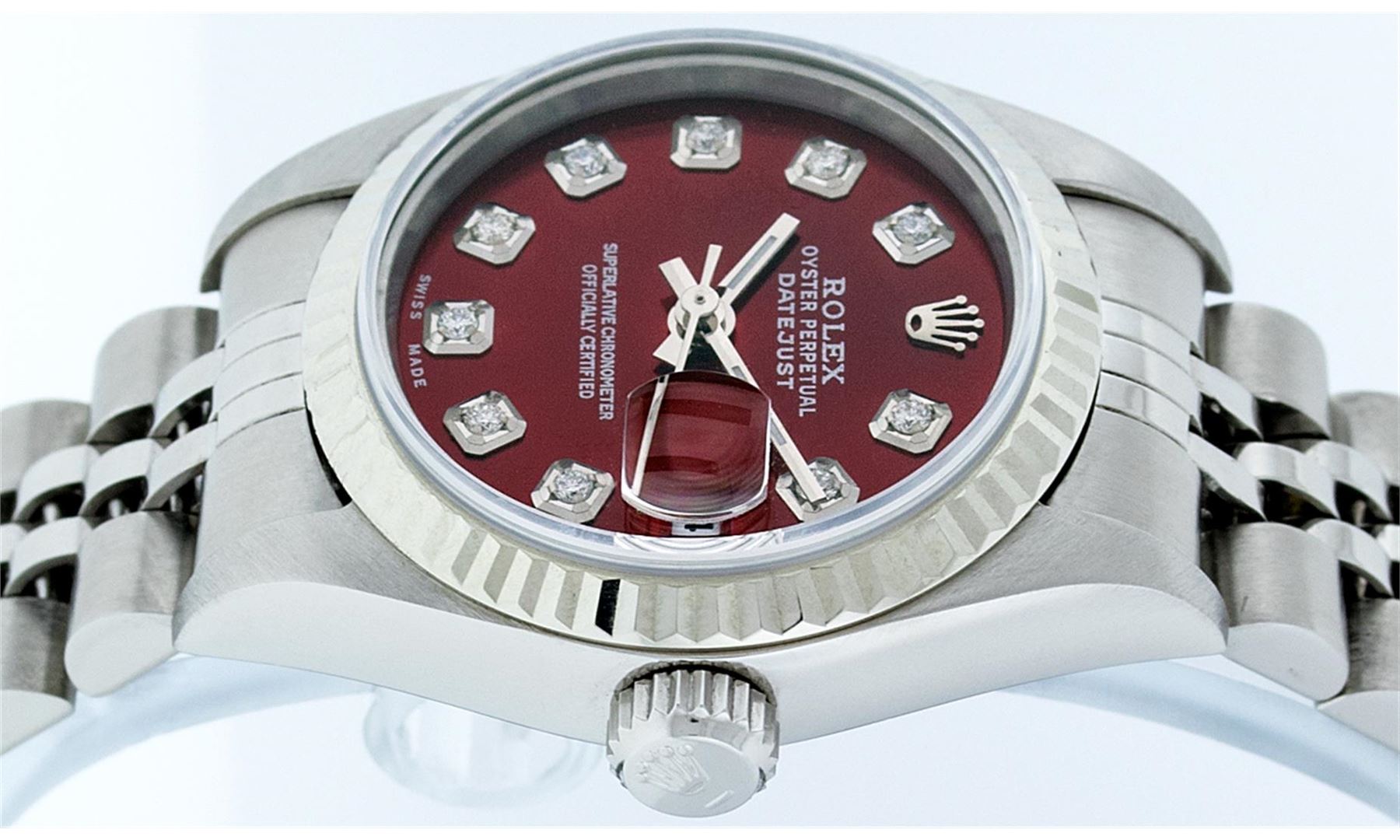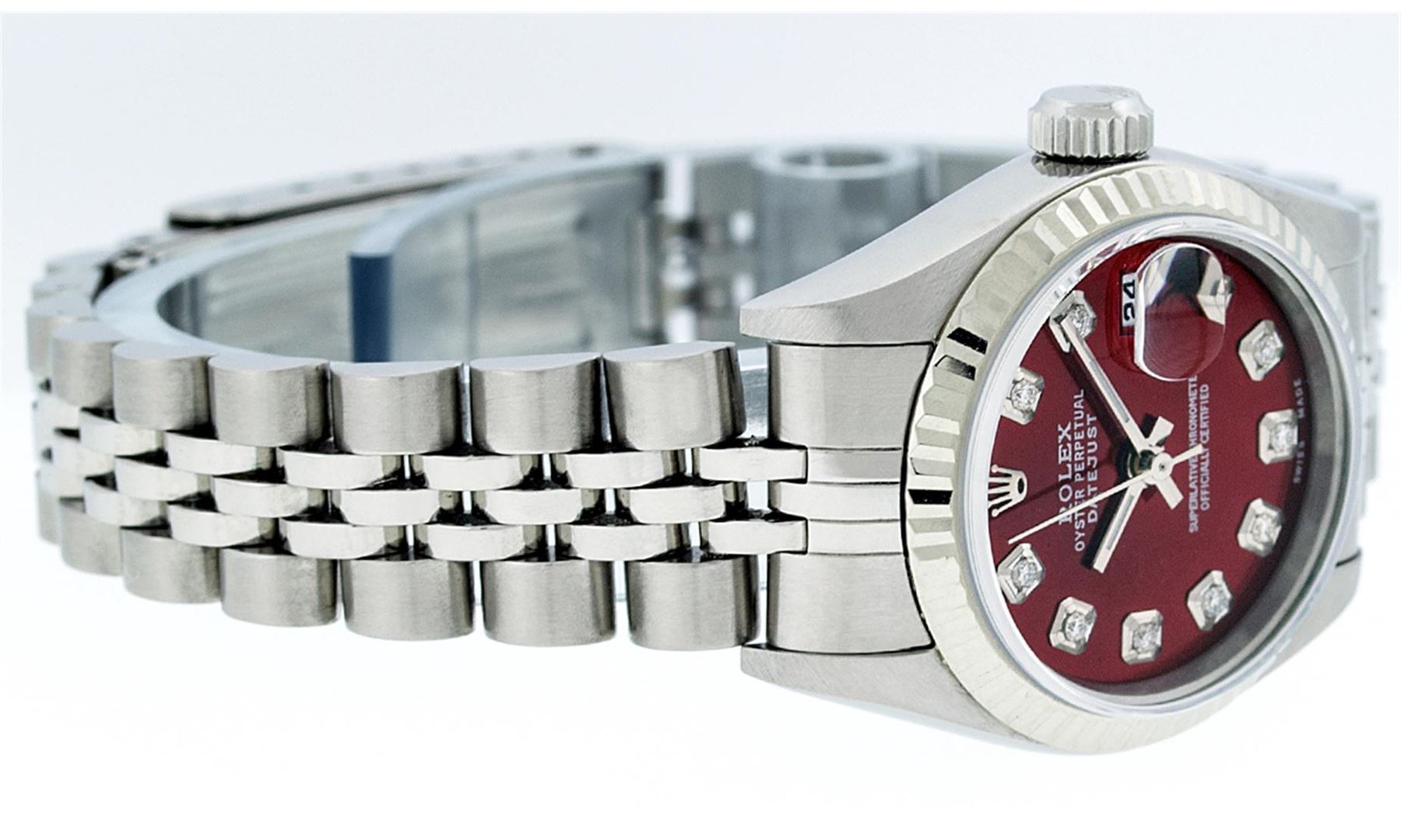 One Ladies Quickset Stainless Steel Rolex Datejust Polished Bright with Satin Finish, Serviced & Electronically Tested, Stainless Steel Case: 26mm, Stainless Steel Crown, Bezel: 18K White Gold Fluted Bezel. Custom Crystal: New Scratch Resistant Sapphire Cyclops Lens. Custom Hands: New Luminescent Hands. Movement: Automatic Winding Movement Caliber 2235. Custom Dial: Red Diamond Dial, Diamond Count: 10 Diamonds In Dial, Color: G to H, Clarity: SI1 Date Window: 3 O'Clock Position Date Display, Model: 79174 Quickset Datejust. Condition: G-6 Extra Fine. Bracelet: Stainless Steel Jubilee Band. Bright Polish & Satin Finish. 6.0 Inch Length, Adjustable. Standard Clasp, With Rolex Logo. This Watch Has Been Serviced Time Tested And Is In Excellent Condition It Is Free Of All Scratches And Dents.