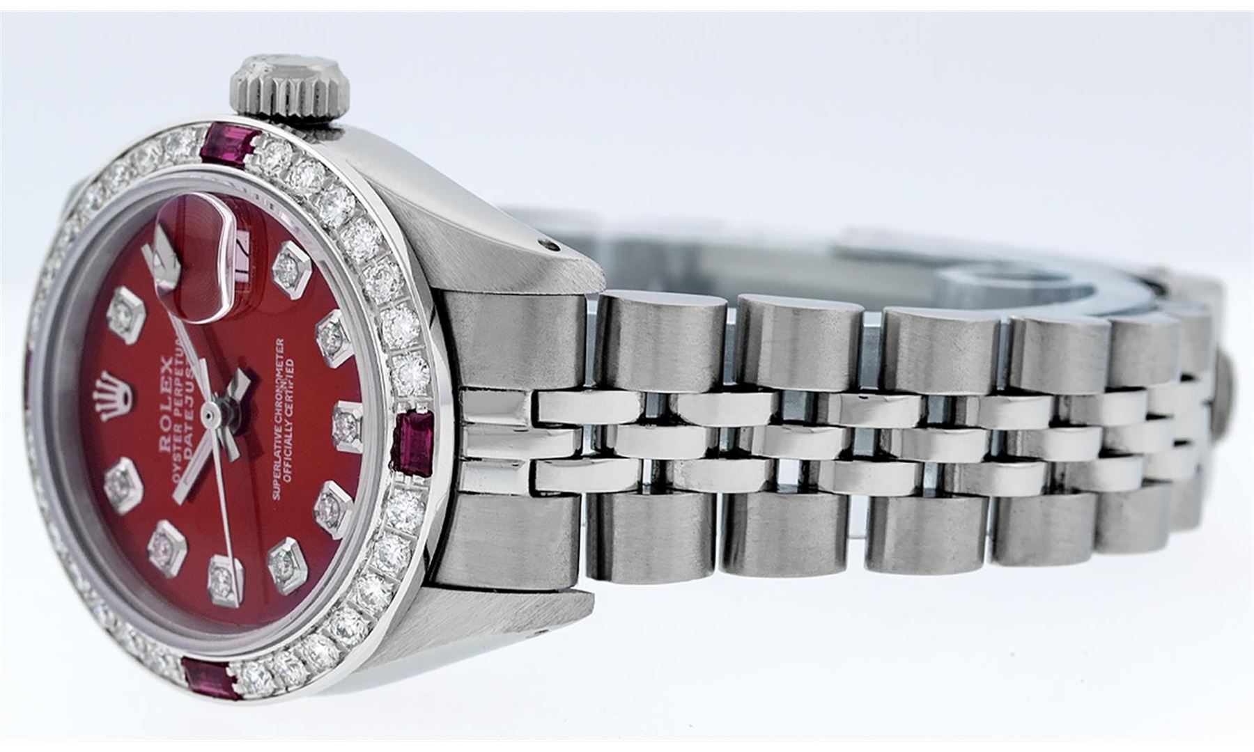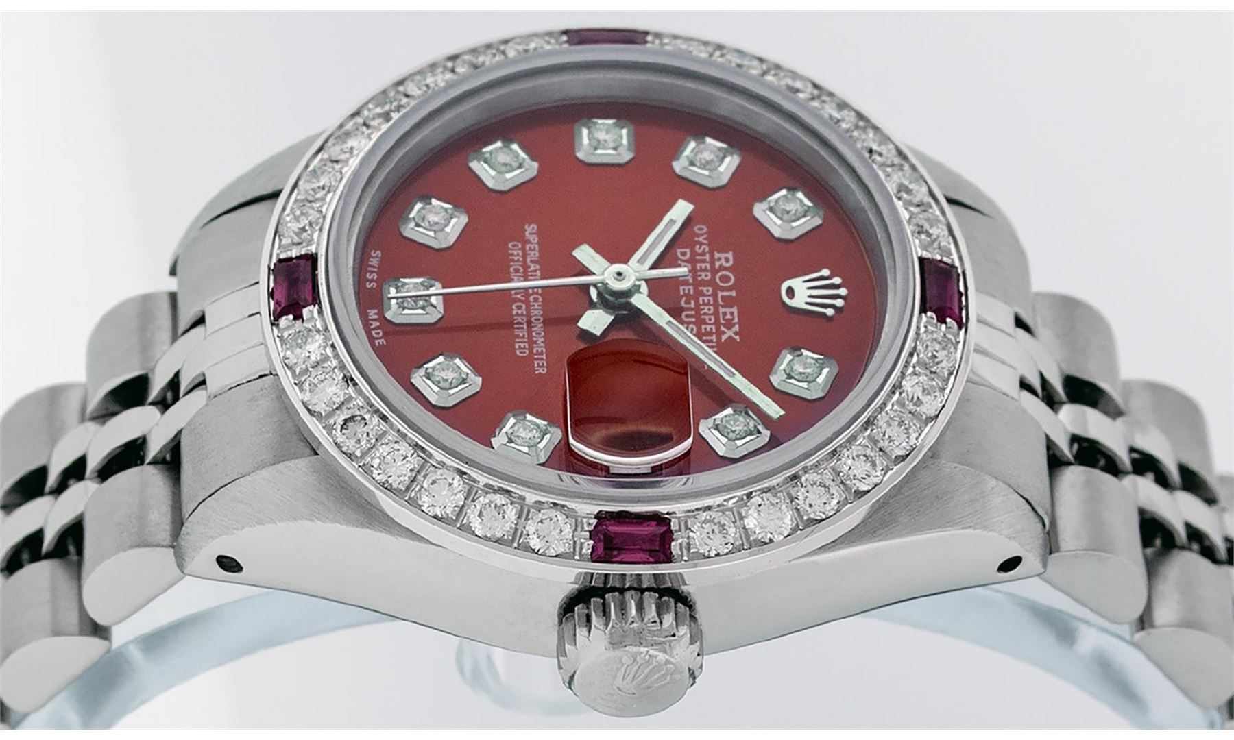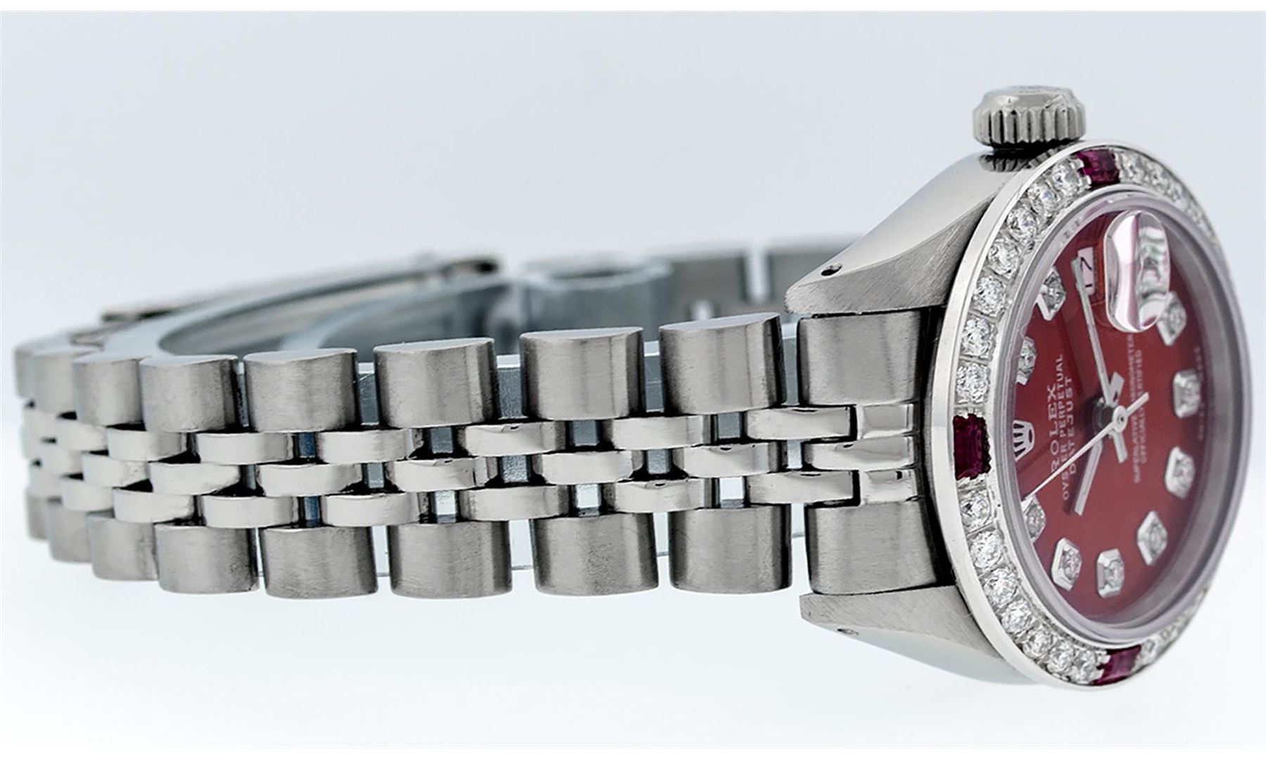One Ladies Stainless Steel Rolex Datejust Polished Bright with Satin Finish, Serviced & Electronically Tested, Stainless Steel Case: 26mm, Stainless Steel Crown, Custom Bezel: New 18K White Gold Ruby Beadset Diamond Bezel, Diamond + Gem Count:  28 Diamonds + 4 Rubies. Total Weight .70 Carat, Clarity: SI-VS, Color: G to H. Custom Crystal: New Synthetic Sapphire Cyclops Lens. Custom Hands: New Luminescent Hands. Movement: Automatic Winding Movement Caliber 2030. Custom Dial: Refinished Red With Diamond Hour Markers, 10 Diamonds in Dial G To H In Color, Clarity: SI-VS. Date Window: 3 O'Clock Position Date Display, Model: Datejust. Condition: G-6 Extra Fine. Bracelet: Stainless Steel Jubilee. Bright Polish & Satin Finish. 6.0 Inch Length, Adjustable. Standard Clasp, With Rolex Logo. This Watch Has Been Serviced Time Tested And Is In Excellent Condition It Is Free Of All Scratches And Dents.