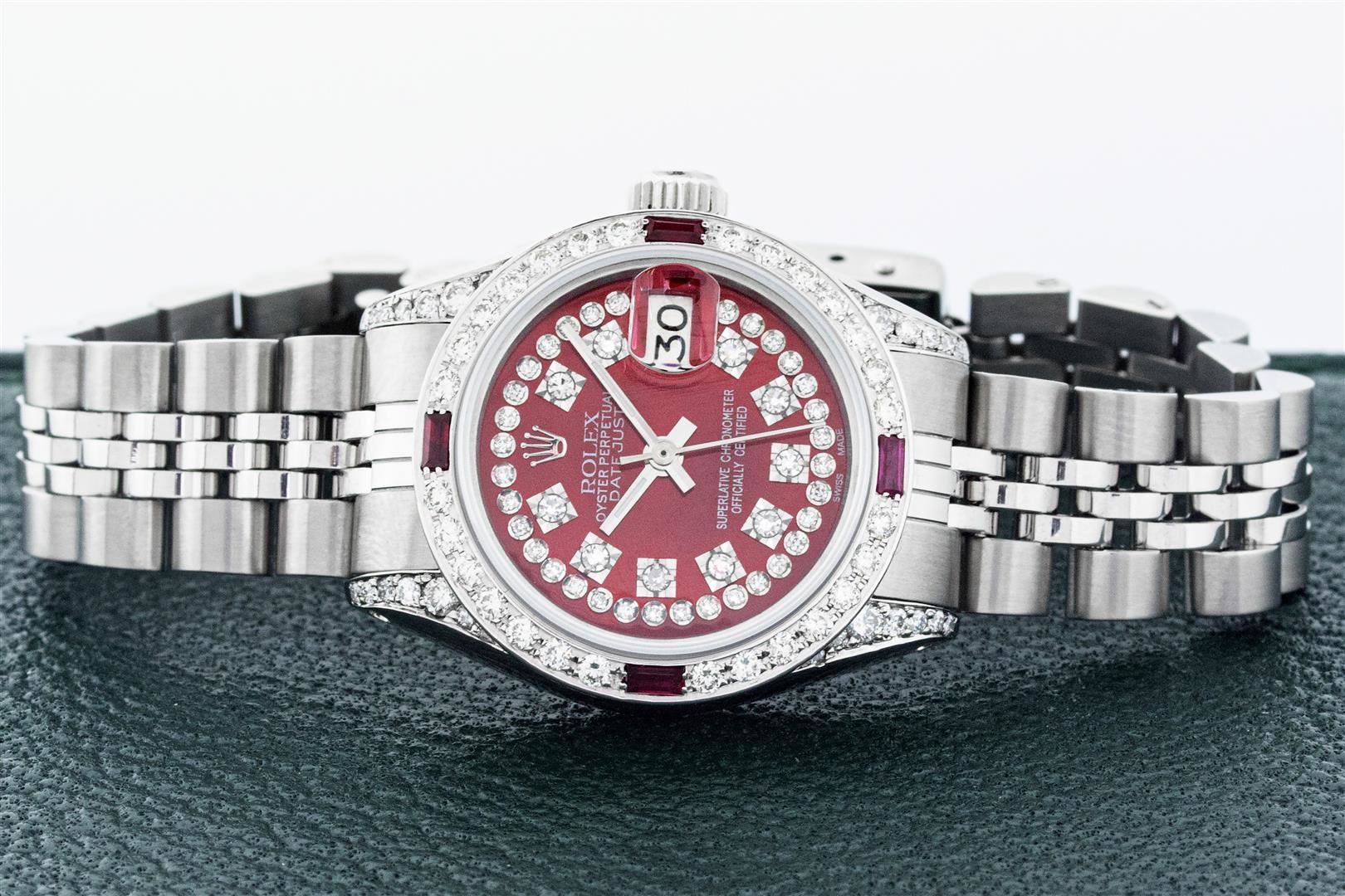 One Ladies Stainless Steel Rolex Datejust Polished Bright with Satin Finish, Serviced & Electronically Tested, Rolex Stainless Steel Case: 26mm, Rolex Stainless Steel Crown. Custom Bezel: New 18K White Gold Beadset & Ruby Diamond Bezel, Custom Diamond Count: 28 Diamonds + 4 Rubies. Total Weight .70 Carat, Clarity: SI-VS, Color: G to H. Custom Crystal: New Sapphire With Magnified Date Window. Custom Hands: New Luminescent Hands. Rolex Movement: Automatic Winding Movement. Custom Dial: Refinished To Red With Custom Added Diamonds, Stone Count: 43 Diamonds On Dial, G To H In Color, Clarity: SI-VS. Date Window: 3 O'clock Position Date Display, Model: Datejust. Condition: G-6 Extra Fine. Rolex Bracelet: Stainless Steel Jubilee Band. Bright Polish & Satin Finish. 6.0 Inch Length, Adjustable. Standard Clasp, With Rolex Logo. This Pre Owned Watch Has Been Serviced Time Tested And Is In Excellent Condition It Is Free Of All Scratches And Dents. This Watch Comes With A Rolex Box.