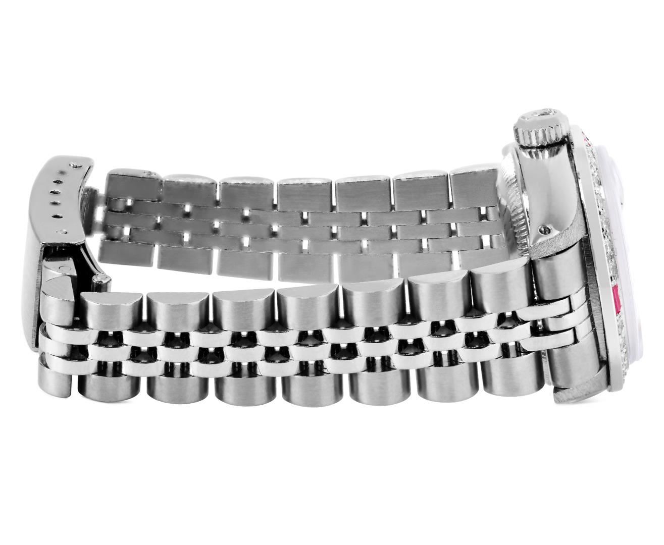One Rolex Ladies Pre Owned Stainless Steel Date Wristwatch Polished Bright with Satin Finish, Serviced & Electronically Tested, Stainless Steel Case: 26mm, Stainless Steel Crown, Custom Bezel: New 18K White Gold Ruby Beadset Diamond Bezel, Diamond + Gem Count: 36 Diamonds + 4 Rubies. Custom Crystal: New Sapphire With Magnified Date Window. Custom Hands: New Luminescent Hands. Rolex Movement: Automatic Winding Movement 2035. Rolex Dial: Factory Silver With Index Hour Markers And Lumi Dots. Date Window: 3 O'clock Position Date Display, Model: Date. Condition: G-6 Extra Fine. Rolex Bracelet: Stainless Steel Jubilee Band. Bright Polish & Satin Finish. 6.0 Inch Length, Adjustable. Standard Clasp, With Rolex Logo. This Watch Has Been Serviced Time Tested And Is In Excellent Condition. It Is Free Of All Scratches And Dents.