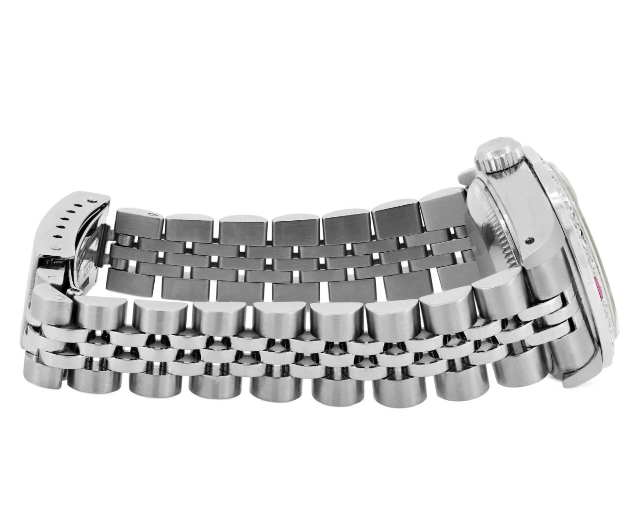 One Rolex Ladies Pre Owned Stainless Steel Date Wristwatch Polished Bright with Satin Finish, Serviced & Electronically Tested, Stainless Steel Case: 26mm, Stainless Steel Crown, Custom Bezel: New 18K White Gold Ruby Beadset Diamond Bezel, Diamond + Gem Count: 36 Diamonds + 4 Rubies. Custom Crystal: New Sapphire With Magnified Date Window. Custom Hands: New Luminescent Hands. Rolex Movement: 2135 Automatic Winding Movement. Rolex Dial: Factory Silver With Index Hour Markers And Lumi Dots. Date Window: 3 O'clock Position Date Display, Model: Quickset Date. Condition: G-6 Extra Fine. Rolex Bracelet: Stainless Steel Jubilee Band. Bright Polish & Satin Finish. 6.0 Inch Length, Adjustable. Standard Clasp, With Rolex Logo. This Watch Has Been Serviced Time Tested And Is In Excellent Condition. It Is Free Of All Scratches And Dents. This Watch Comes With A Rolex Box.