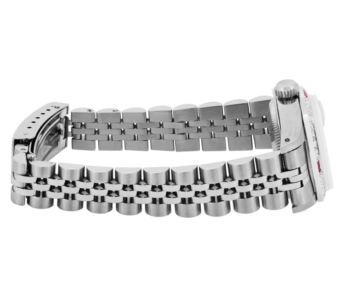 One Rolex Ladies Pre Owned Stainless Steel Date Wristwatch Polished Bright with Satin Finish, Serviced & Electronically Tested, Stainless Steel Case: 26mm, Stainless Steel Crown, Custom Bezel: New 18K White Gold Ruby Beadset Diamond Bezel, Diamond + Gem Count: 36 Diamonds + 4 Rubies, Clarity: SI-VS, Color: G to H. Custom Crystal: New Sapphire With Magnified Date Window. Custom Hands: New Luminescent Hands. Rolex Movement: Automatic Winding Movement. Rolex Dial: Factory Silver Dial With Black Index Hour Markers And Lumi Dots. Date Window: 3 O'Clock Position Date Display, Model: Datej. Condition: G-6 Extra Fine. Rolex Bracelet: Stainless Steel Jubilee Band. Bright Polish & Satin Finish. 6.0 Inch Length, Adjustable. Standard Clasp, With Rolex Logo. This Watch Has Been Serviced Time Tested And Is In Excellent Condition. It Is Free Of All Scratches And Dents. This Watch Comes With A Rolex Box.