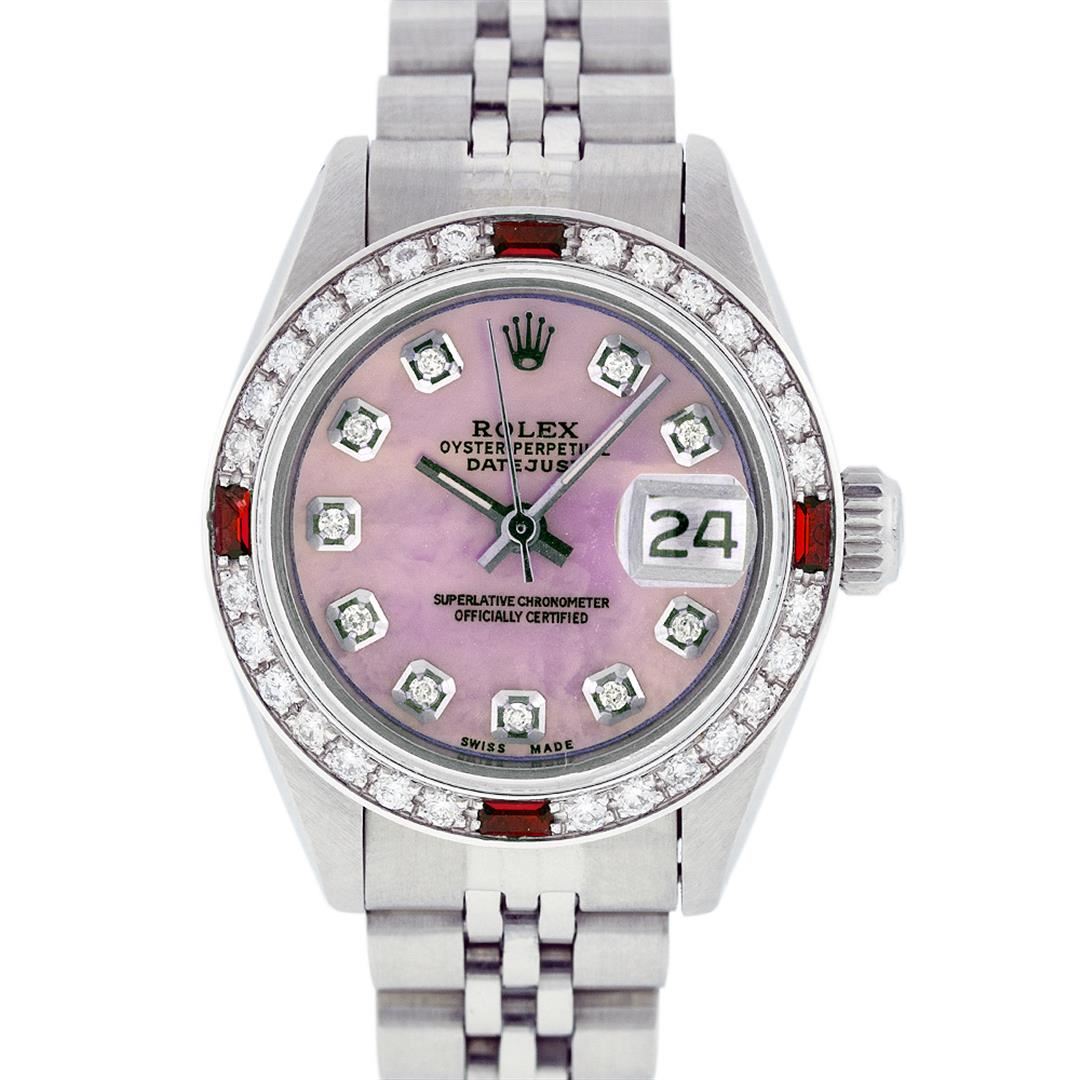 One Ladies Rolex Datejust Polished Bright with Satin Finish, Serviced & Electronically Tested, Stainless Steel Case:26mm, Stainless Steel Crown, Custom Bezel: 18K White Gold Ruby Beadset Diamond Bezel, Diamond + Gem Count: 28 Diamonds + 4 Rubies Total Weight .70 Carat, Clarity: SI-VS, Color: G to H. Custom Crystal: Synthetic Sapphire Cyclops Lens. Movement: Automatic Winding Movement Caliber 2030. Custom Dial: Refinished Pink Mother Of Pearl Diamond Dial, Diamond Count: 10 Diamonds, Clarity: SI-VS, G to H. Date Window: 3 O'Clock Position Date Display, Model: Datejust. Condition: G-6 Extra Fine. Bracelet: Stainless Steel Jubilee. Bright Polish & Satin Finish. 6.0 Inch Length, Adjustable. Standard Clasp, With Rolex Logo.