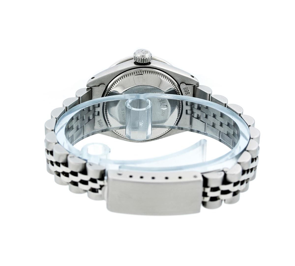 One Ladies Rolex Datejust Polished Bright with Satin Finish, Serviced & Electronically Tested, Stainless Steel Case:26mm, Stainless Steel Crown, Custom Bezel: 18K White Gold Ruby Beadset Diamond Bezel, Diamond + Gem Count: 28 Diamonds + 4 Rubies Total Weight .70 Carat, Clarity: SI-VS, Color: G to H. Custom Crystal: Synthetic Sapphire Cyclops Lens. Movement: Automatic Winding Movement Caliber 2030. Custom Dial: Refinished Pink Mother Of Pearl Diamond Dial, Diamond Count: 10 Diamonds, Clarity: SI-VS, G to H. Date Window: 3 O'Clock Position Date Display, Model: Datejust. Condition: G-6 Extra Fine. Bracelet: Stainless Steel Jubilee. Bright Polish & Satin Finish. 6.0 Inch Length, Adjustable. Standard Clasp, With Rolex Logo.