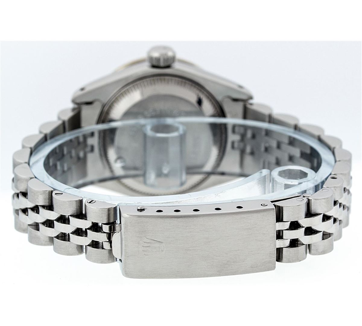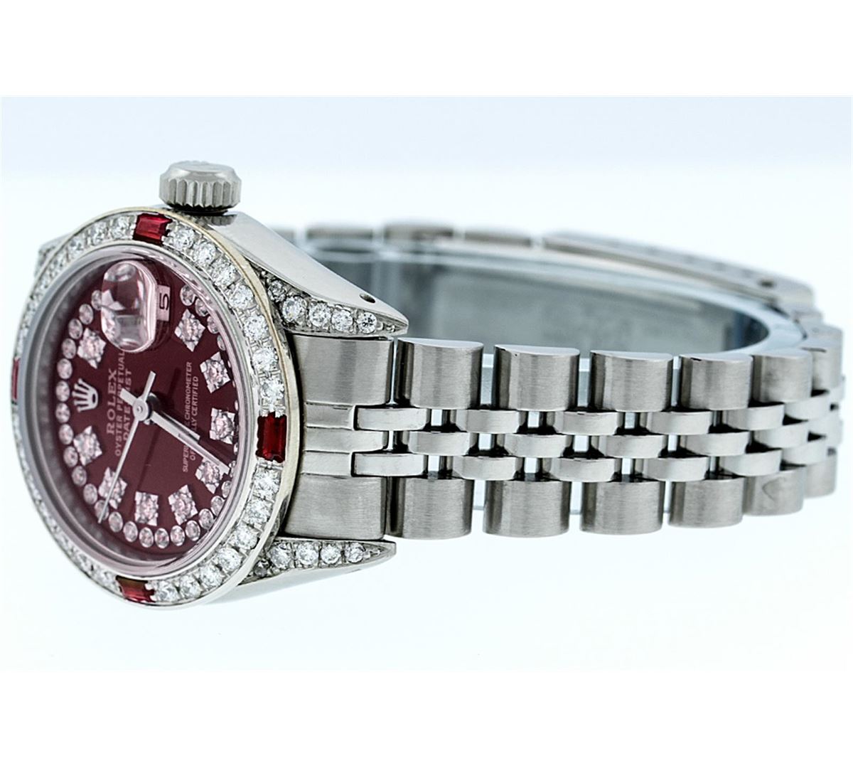 One Ladies Rolex Datejust Polished Bright with Satin Finish, Serviced & Electronically Tested, Stainless Steel Case:26mm, Stainless Steel Crown, Diamond Lugs: 16 Diamonds On Lugs, Clarity: SI-VS, Color: G to H. Custom Bezel: 18K White Gold Ruby Beadset Bezel, Diamond Count: 28 Diamonds + 4 Rubies, Total Weight 1.00 Carat, Clarity: SI-VS, Color: G to H. Custom Crystal: Synthetic Sapphire Cyclops Lens. Movement: Automatic Winding Movement Caliber 2030. Custom Dial: Refinished Burgundy With String Diamond Dial, 43 Diamonds in Dial G To H In Color, Clarity: VVS. Date Window: 3 O'Clock Position Date Display, Model: Datejust Condition: G-6 Extra Fine. Bracelet: Stainless Steel Jubilee. Bright Polish & Satin Finish. 6.0 Inch Length, Adjustable. Standard Clasp, With Rolex Logo.