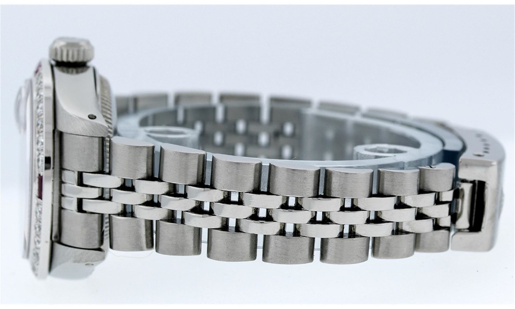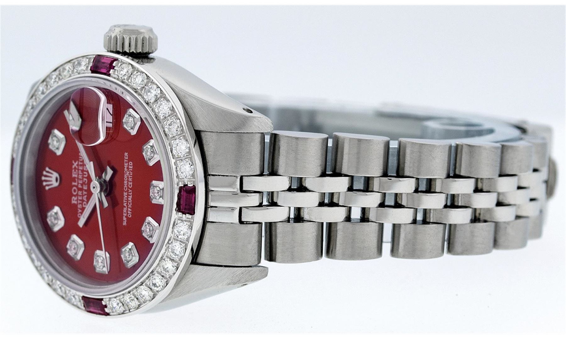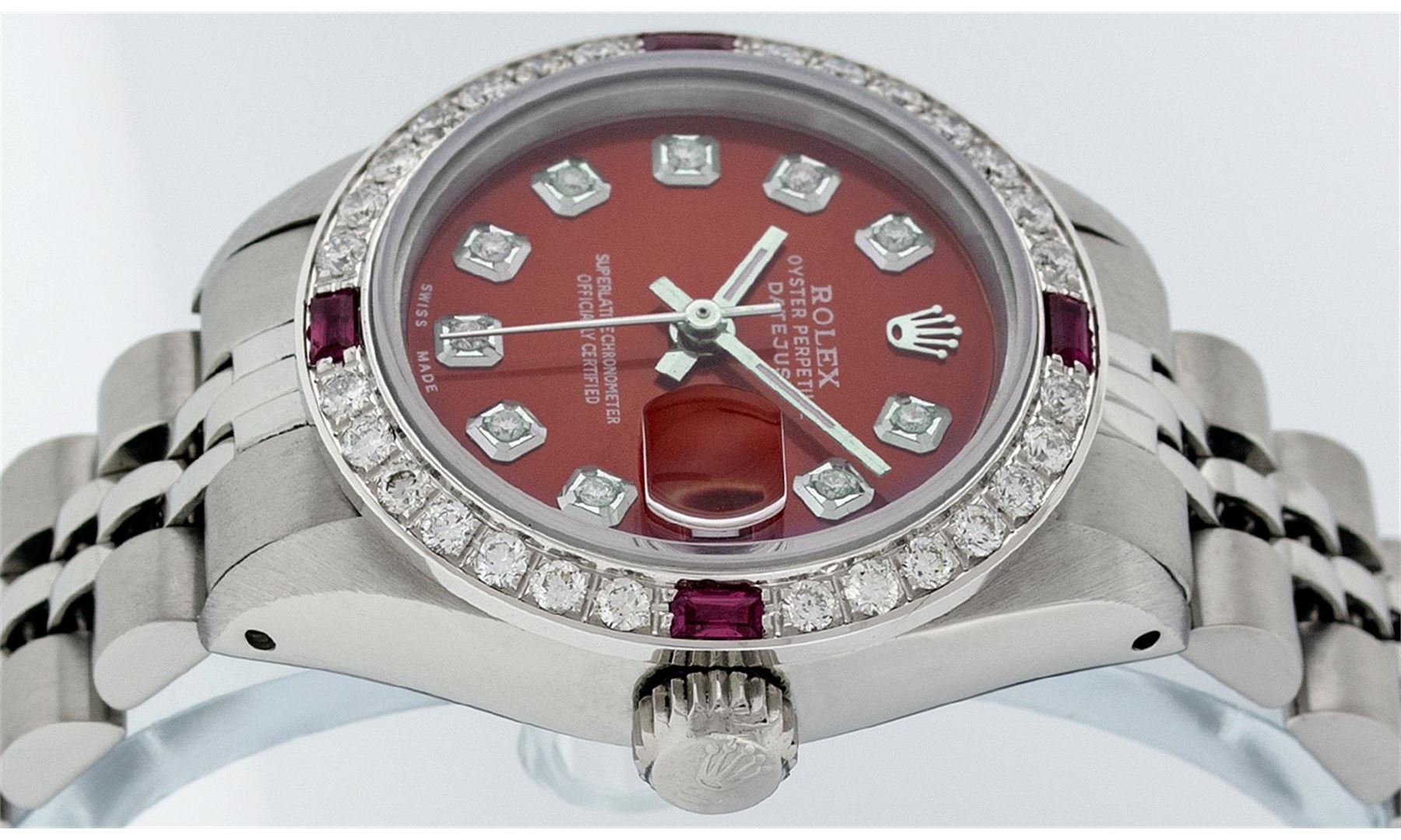 One Ladies Rolex Datejust Polished Bright with Satin Finish, Serviced & Electronically Tested, Stainless Steel Case:26mm, Stainless Steel Crown, Custom Bezel: 18K White Gold Ruby Beadset Diamond Bezel, Diamond + Gem Count: 28 Diamonds + 4 Rubies Total Weight .70 Carat, Clarity: SI-VS, Color: G to H. Custom Crystal: Synthetic Sapphire Cyclops Lens. Movement: Automatic Winding Movement Caliber 2030. Custom Dial: Refinished Red Diamond Dial. Diamond Count: 10 Diamonds In Dial, Color: G To H, VS SI1. Date Window: 3 O'Clock Position Date Display, Model: Datejust Condition: G-6 Extra Fine. Bracelet:Stainless Steel Jubilee. Bright Polish & Satin Finish. 5.5 Inch Length, Adjustable. Standard Clasp, With Rolex Logo.