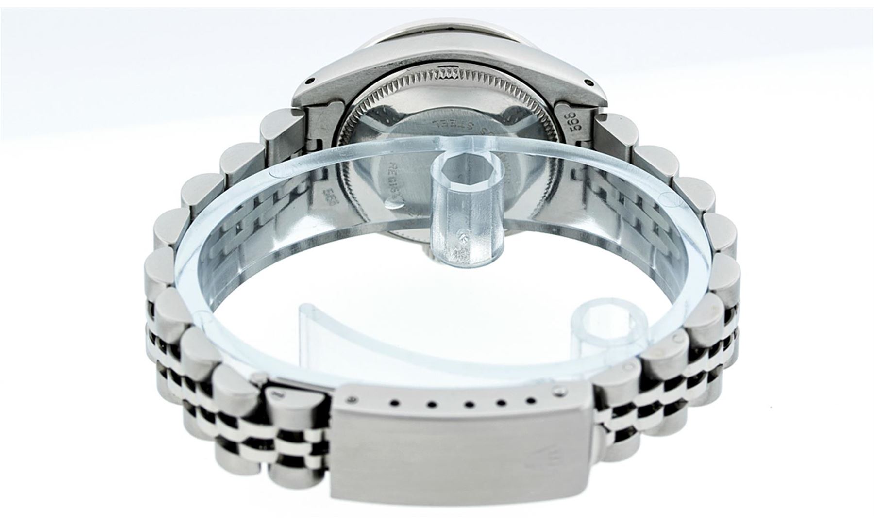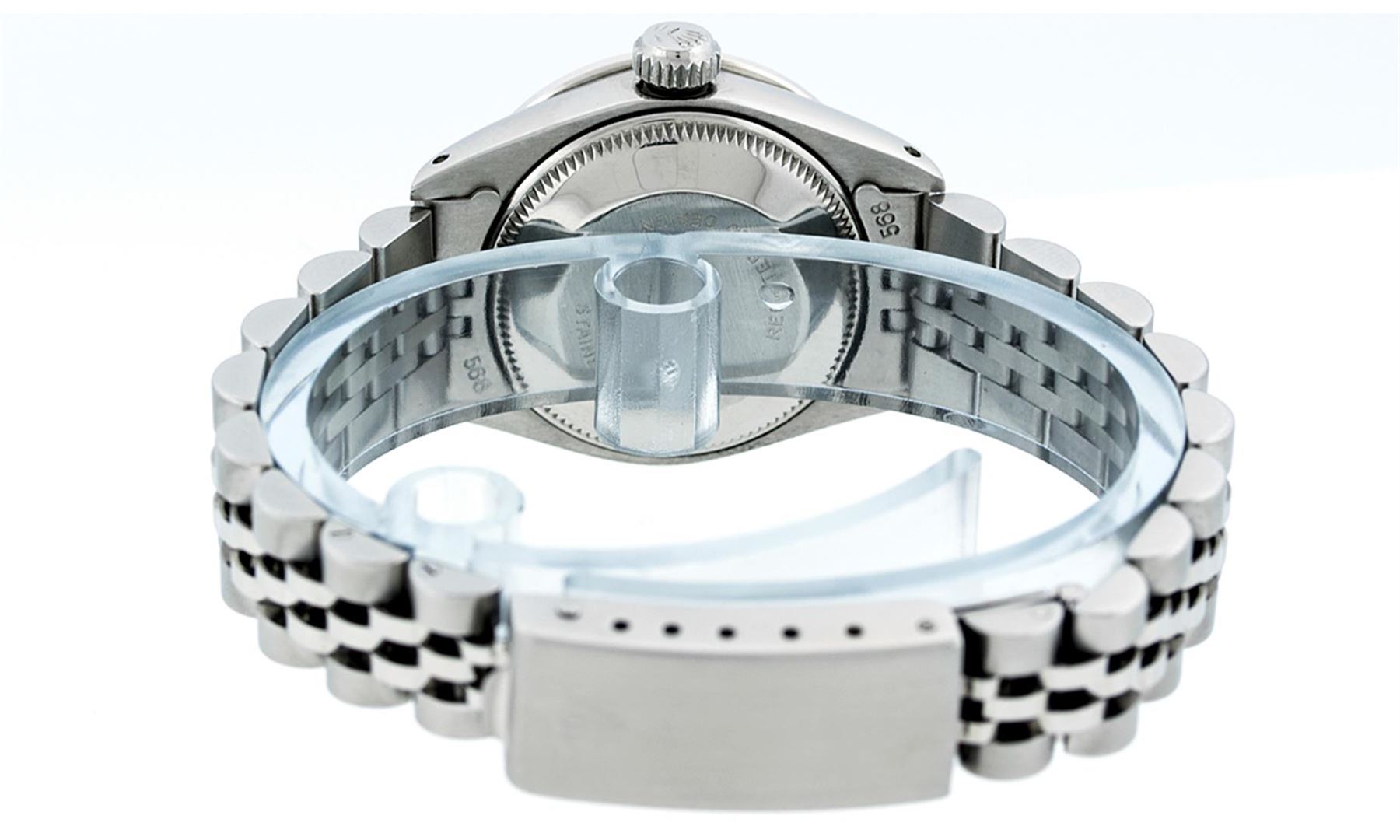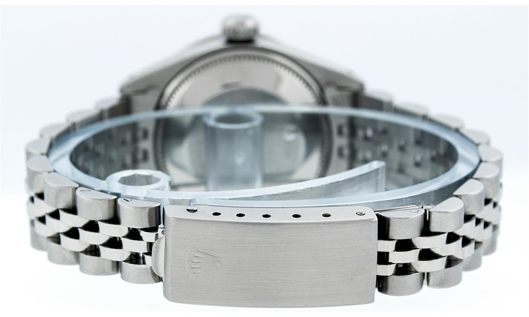 One Ladies Rolex Datejust Polished Bright with Satin Finish, Serviced & Electronically Tested, Stainless Steel Case:26mm, Stainless Steel Crown, Custom Bezel: 18K White Gold Ruby Beadset Diamond Bezel, Diamond + Gem Count: 28 Diamonds + 4 Rubies Total Weight .70 Carat, Clarity: SI-VS, Color: G to H. Custom Crystal: Synthetic Sapphire Cyclops Lens. Movement: Automatic Winding Movement Caliber 2030. Custom Dial: Refinished Red Diamond Dial. Diamond Count: 10 Diamonds In Dial, Color: G To H, VS SI1. Date Window: 3 O'Clock Position Date Display, Model: Datejust Condition: G-6 Extra Fine. Bracelet:Stainless Steel Jubilee. Bright Polish & Satin Finish. 5.5 Inch Length, Adjustable. Standard Clasp, With Rolex Logo.
