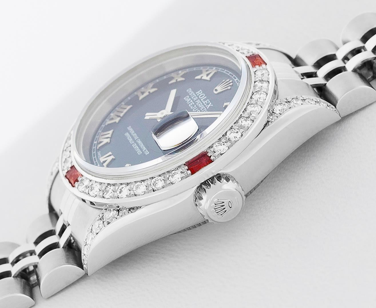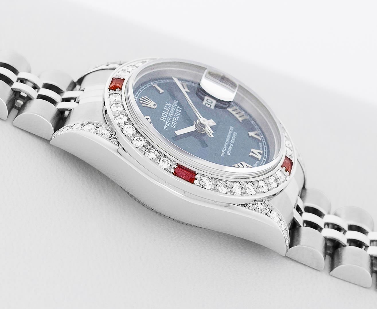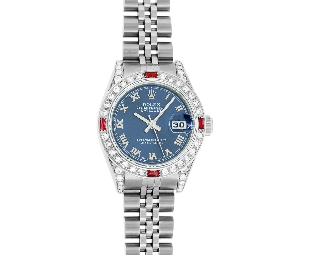 One Ladies Pre Owned Quickset Stainless Steel Rolex Datejust Polished Bright with Satin Finish, Serviced & Electronically Tested, Rolex Stainless Steel Case: 26mm, Custom Diamond Lugs: Added Diamonds On Lugs, Diamond Count: 24 Diamonds On Bezel, Color: G To H, Clarity: SI-VS. Rolex Stainless Steel Crown, Custom Bezel: New 18K White Gold Beadset And Ruby Bezel, Stone Count: 28 Diamonds + 4 Rubies, Diamond Color: G To H, Clarity: SI-VS. Custom Crystal: New Sapphire With Magnified Date Window. Custom Hands: New Hands. Rolex Movement: Quickset Automatic Winding Movement 2230. Rolex Dial: Blue Roman Dial With Square Track. Date Window: 3 O'Clock Position Date Display, Model: Sapphire Quickset Datejust. Condition: G-6 Extra Fine. Rolex Bracelet: Stainless Steel Jubilee Band. Bright Polish & Satin Finish. 6.0 Inch Length, Adjustable. Standard Clasp, With Rolex Logo. This Watch Has Been Serviced Time Tested And Is In Excellent Condition It Is Free Of All Scratches And Dents.