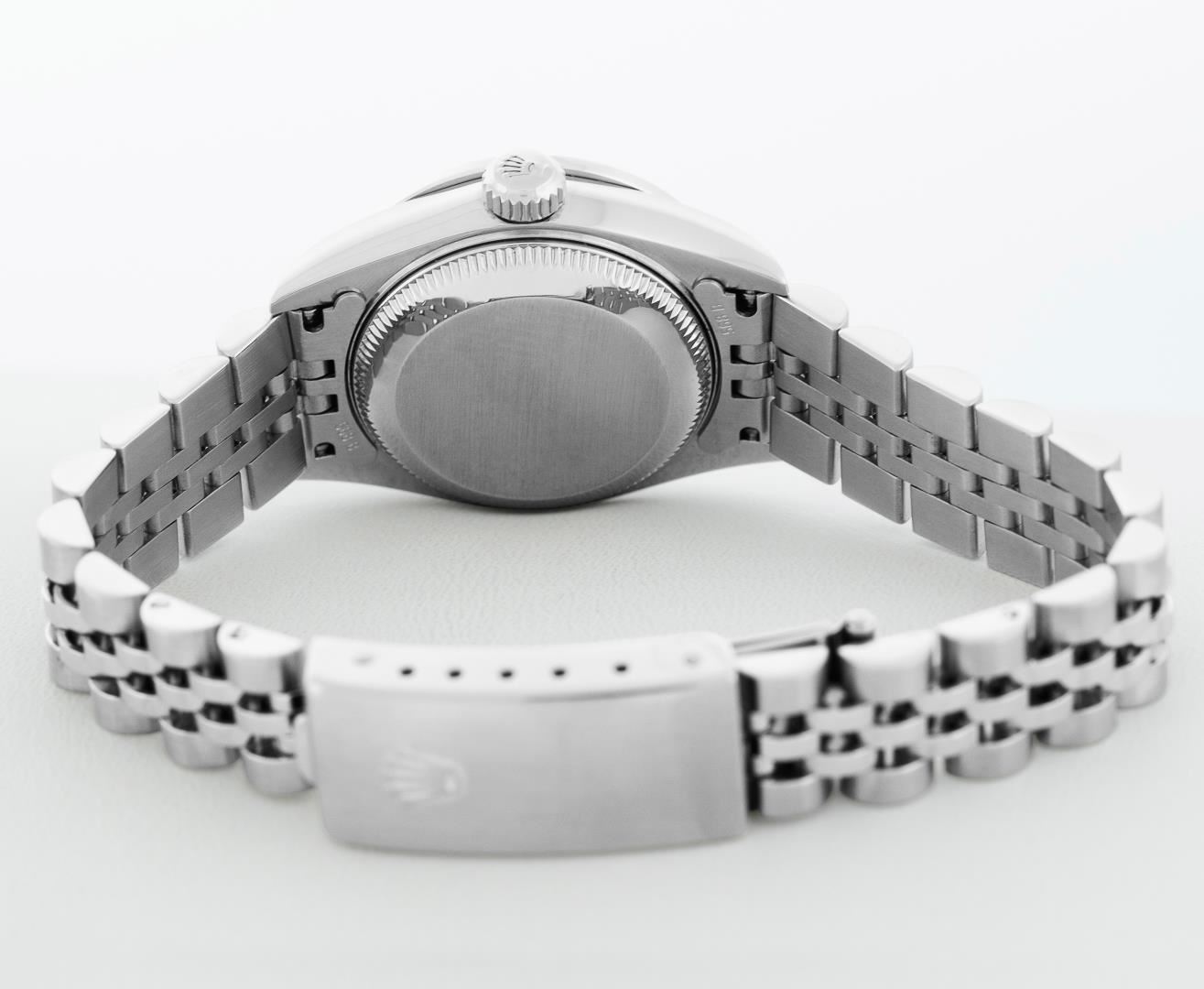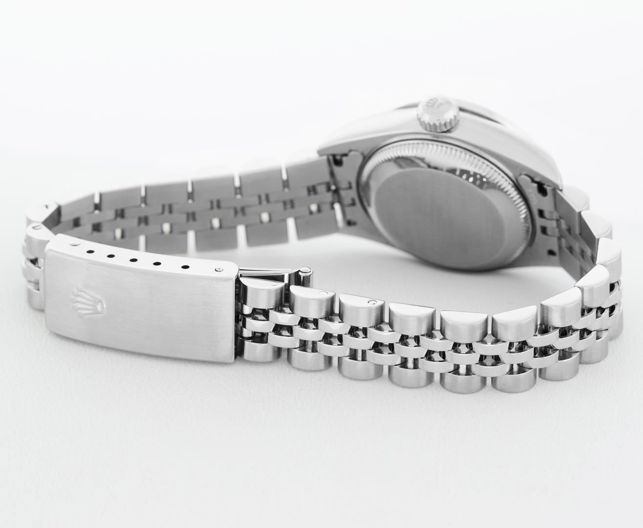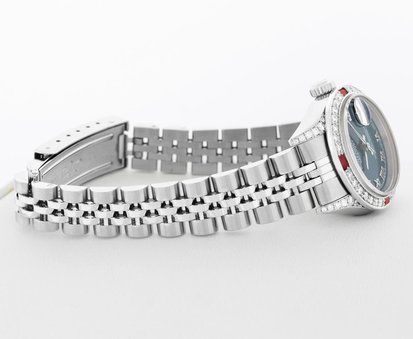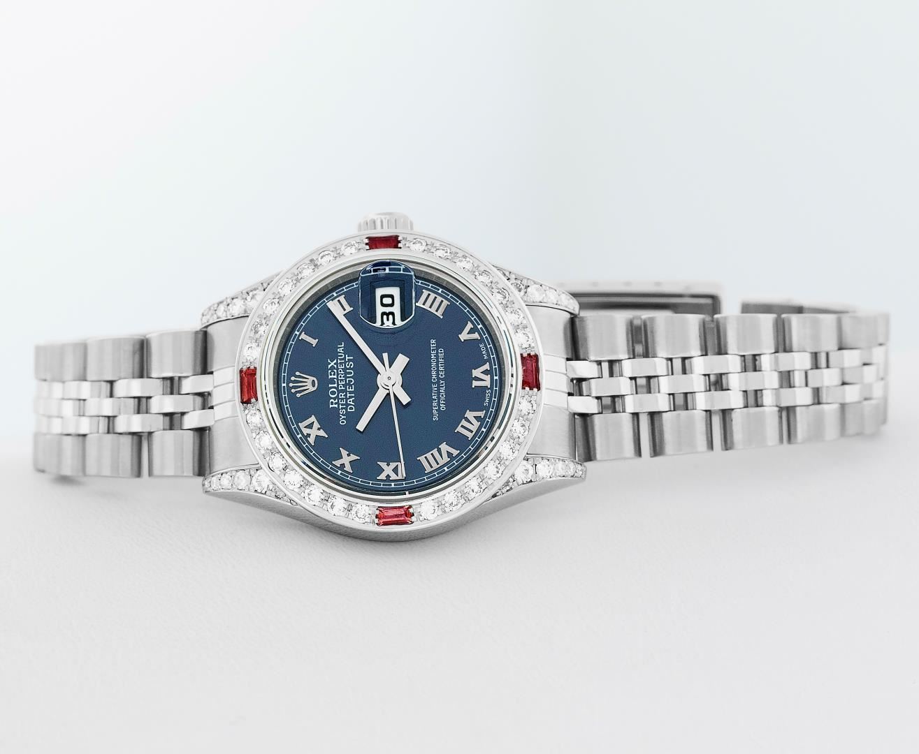 One Ladies Pre Owned Quickset Stainless Steel Rolex Datejust Polished Bright with Satin Finish, Serviced & Electronically Tested, Rolex Stainless Steel Case: 26mm, Custom Diamond Lugs: Added Diamonds On Lugs, Diamond Count: 24 Diamonds On Bezel, Color: G To H, Clarity: SI-VS. Rolex Stainless Steel Crown, Custom Bezel: New 18K White Gold Beadset And Ruby Bezel, Stone Count: 28 Diamonds + 4 Rubies, Diamond Color: G To H, Clarity: SI-VS. Custom Crystal: New Sapphire With Magnified Date Window. Custom Hands: New Hands. Rolex Movement: Quickset Automatic Winding Movement 2230. Rolex Dial: Blue Roman Dial With Square Track. Date Window: 3 O'Clock Position Date Display, Model: Sapphire Quickset Datejust. Condition: G-6 Extra Fine. Rolex Bracelet: Stainless Steel Jubilee Band. Bright Polish & Satin Finish. 6.0 Inch Length, Adjustable. Standard Clasp, With Rolex Logo. This Watch Has Been Serviced Time Tested And Is In Excellent Condition It Is Free Of All Scratches And Dents.