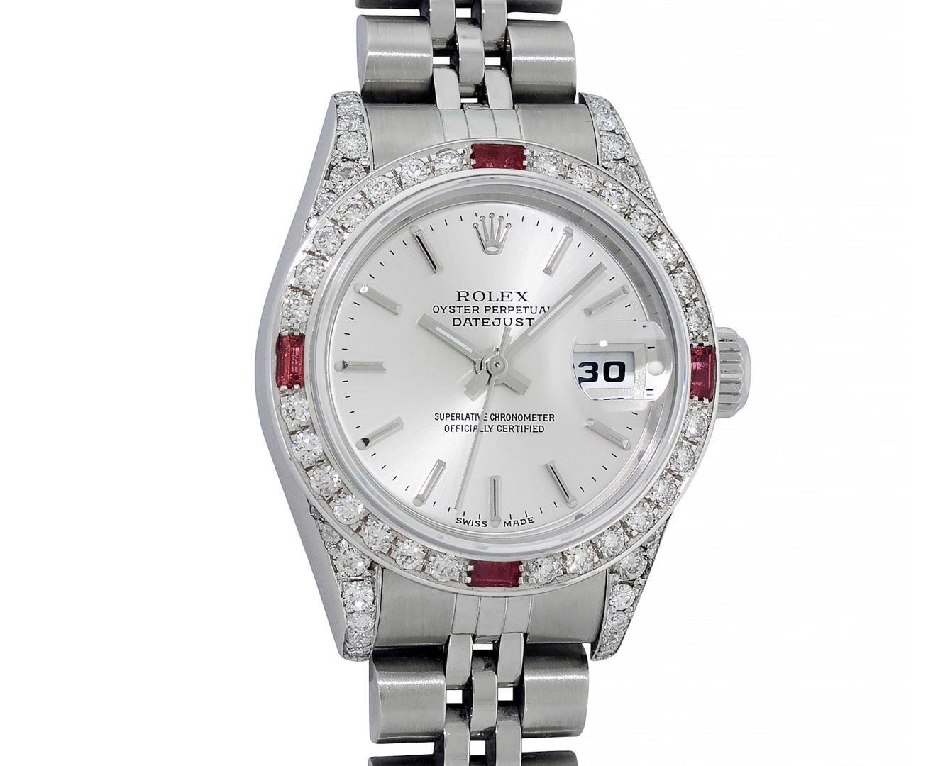 One Ladies Pre Owned Quickset Stainless Steel Rolex Datejust Polished Bright with Satin Finish, Serviced & Electronically Tested, Rolex Stainless Steel Case: 26mm, Custom Diamond Lugs: Added Diamonds On Lugs, Diamond Count: 24 Diamonds On Bezel, Color: G To H, Clarity: SI-VS. Rolex Stainless Steel Crown, Custom Bezel: New 18K White Gold Beadset And Ruby Bezel, Stone Count: 28 Diamonds + 4 Rubies, Diamond Color: G To H, Clarity: SI-VS. Custom Crystal: New Sapphire With Magnified Date Window. Custom Hands: New Lumi Hands. Rolex Movement: Quickset Automatic Winding Movement 2230. Rolex Dial: Silver Index With Dash Track And Lumi Dots. Date Window: 3 O'Clock Position Date Display, Model: Sapphire Quickset Datejust. Condition: G-6 Extra Fine. Rolex Bracelet: Stainless Steel Jubilee Band. Bright Polish & Satin Finish. 6.0 Inch Length, Adjustable. Standard Clasp, With Rolex Logo. This Watch Has Been Serviced Time Tested And Is In Excellent Condition It Is Free Of All Scratches And Dents.
