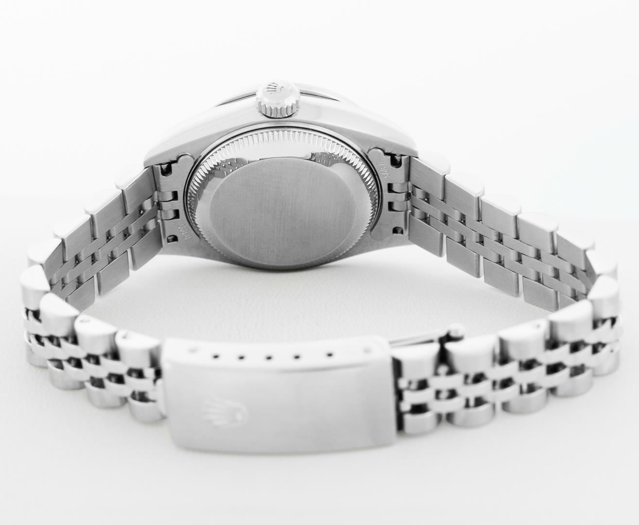One Ladies Pre Owned Quickset Stainless Steel Rolex Datejust Polished Bright with Satin Finish, Serviced & Electronically Tested, Rolex Stainless Steel Case: 26mm, Custom Diamond Lugs: Added Diamonds On Lugs, Diamond Count: 24 Diamonds On Bezel, Color: G To H, Clarity: SI-VS. Rolex Stainless Steel Crown, Custom Bezel: New 18K White Gold Beadset And Ruby Bezel, Stone Count: 28 Diamonds + 4 Rubies, Diamond Color: G To H, Clarity: SI-VS. Custom Crystal: New Sapphire With Magnified Date Window. Custom Hands: New Lumi Hands. Rolex Movement: Quickset Automatic Winding Movement 2230. Rolex Dial: Silver Index With Dash Track And Lumi Dots. Date Window: 3 O'Clock Position Date Display, Model: Sapphire Quickset Datejust. Condition: G-6 Extra Fine. Rolex Bracelet: Stainless Steel Jubilee Band. Bright Polish & Satin Finish. 6.0 Inch Length, Adjustable. Standard Clasp, With Rolex Logo. This Watch Has Been Serviced Time Tested And Is In Excellent Condition It Is Free Of All Scratches And Dents.